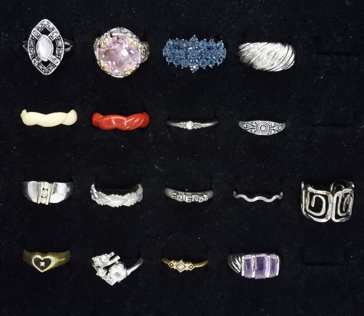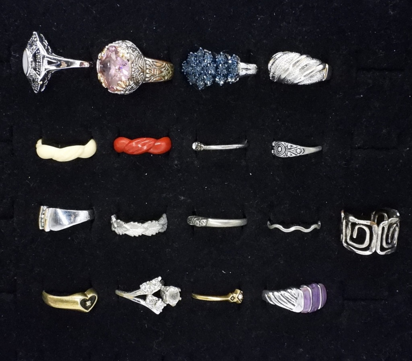 SIXTEEN FASHION RINGS, GOLD AND SILVER TONES. GEMSTONES. SIZES 7-10