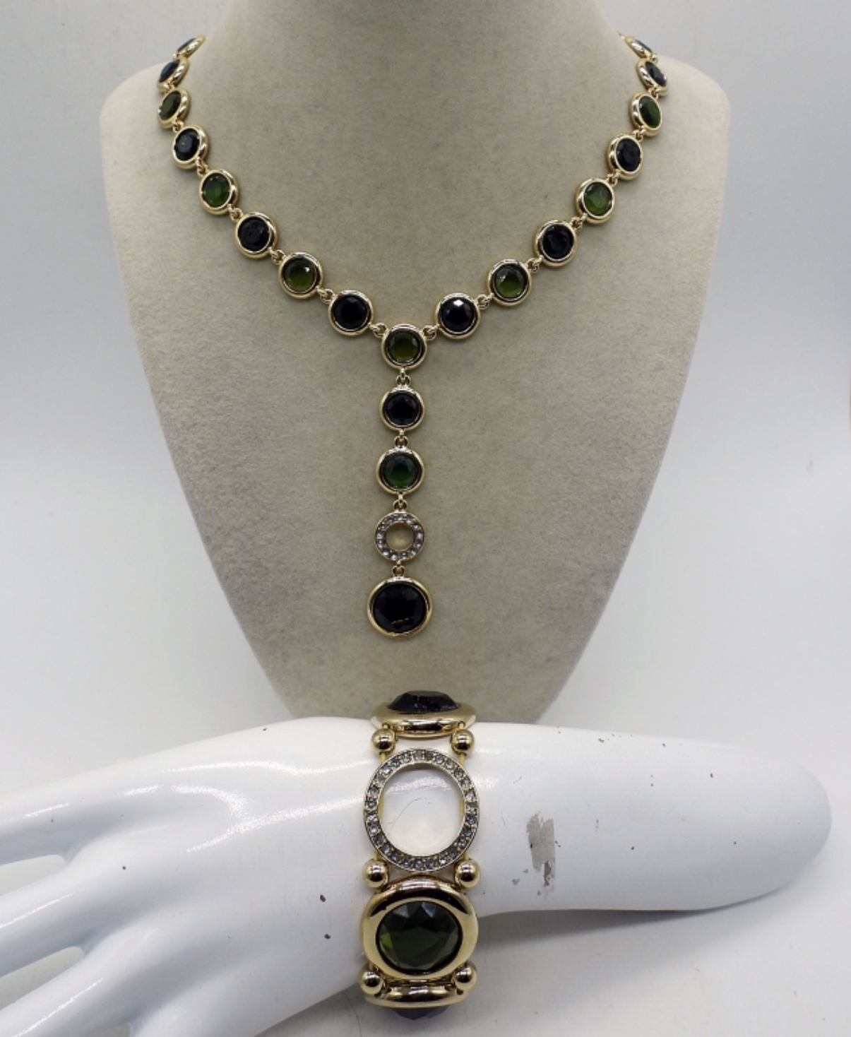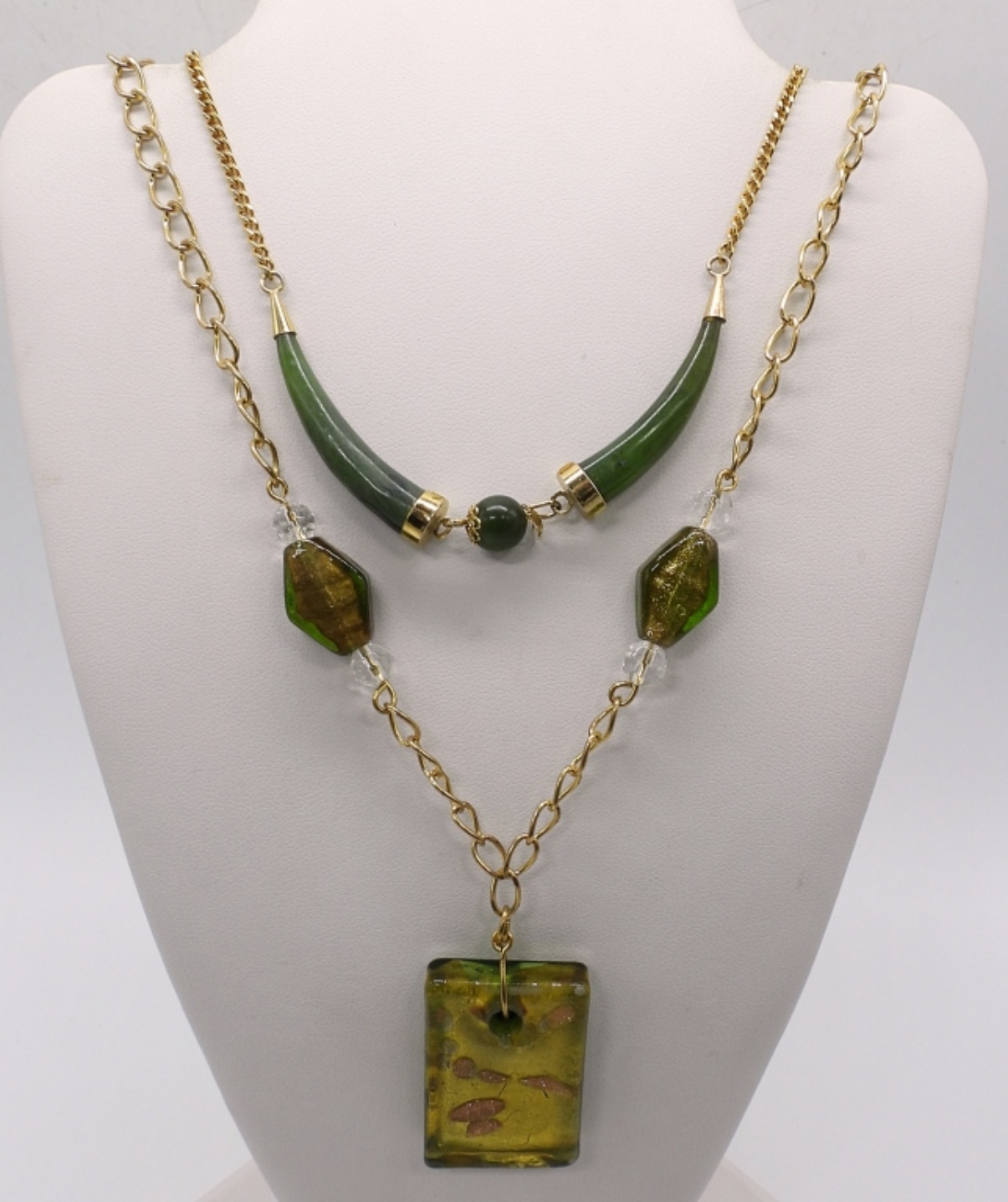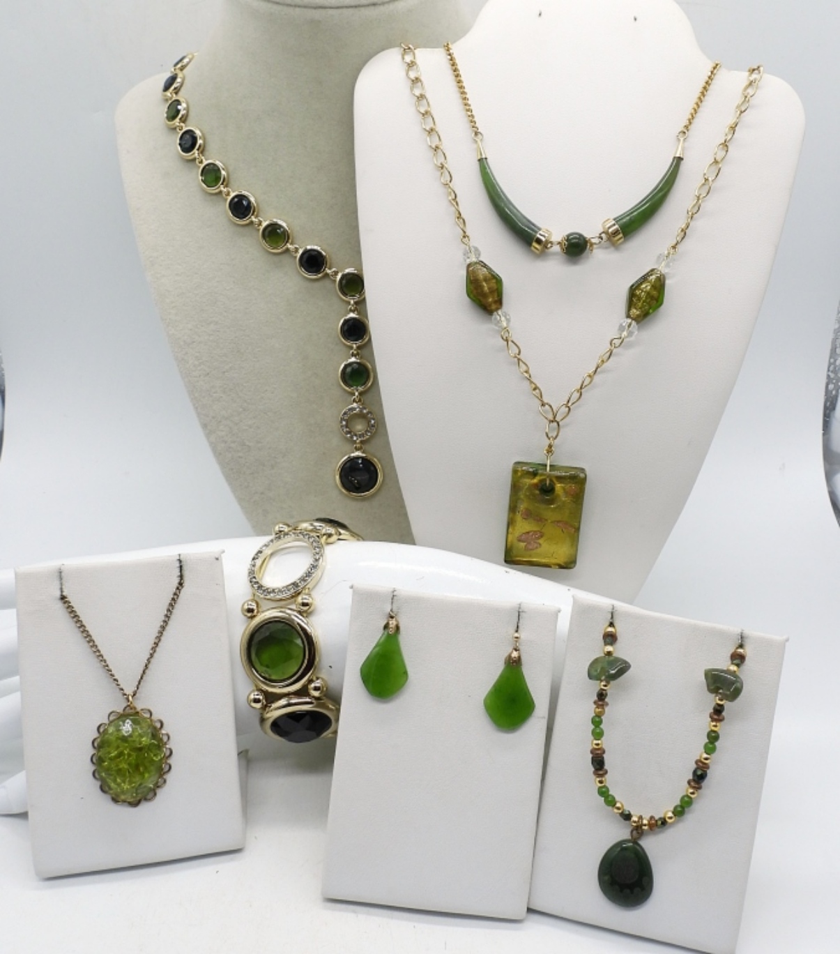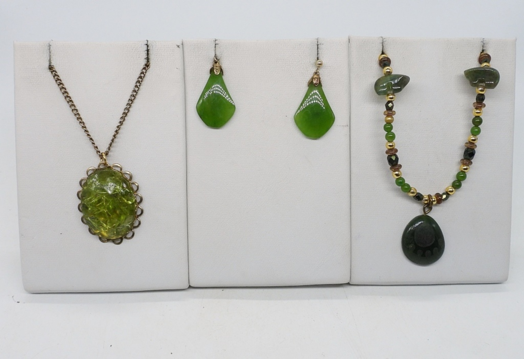 FIVE NECKLACES, 16″-26″. ONE STRETCHY BRACELET AND ONE PAIR OF JADE PIERCED EARRINGS.