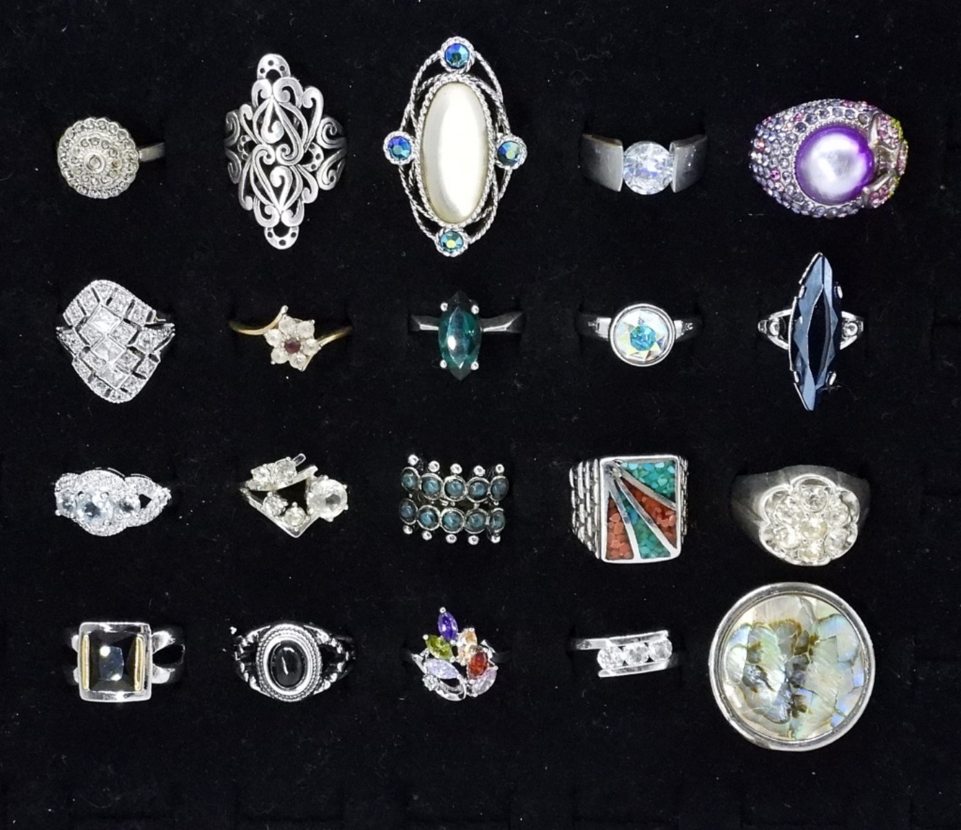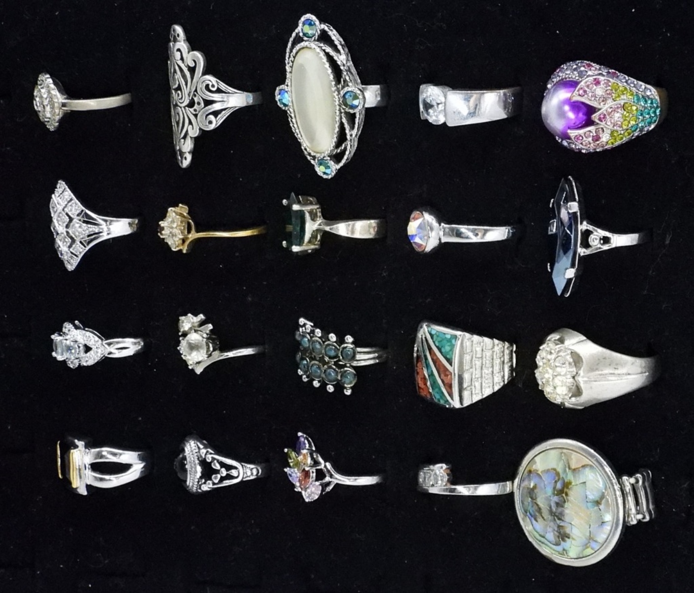 20 SILVER TONE FASHION RINGS. SIZES 5.5-10