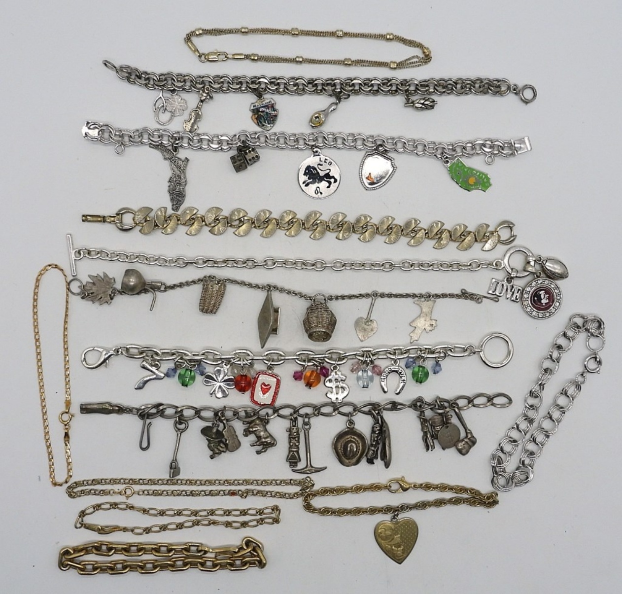FOURTEEN FASHION BRACELETS (NOTHING IS STERLING!) SIX ARE CHARM BRACELETS. 7″-8″.