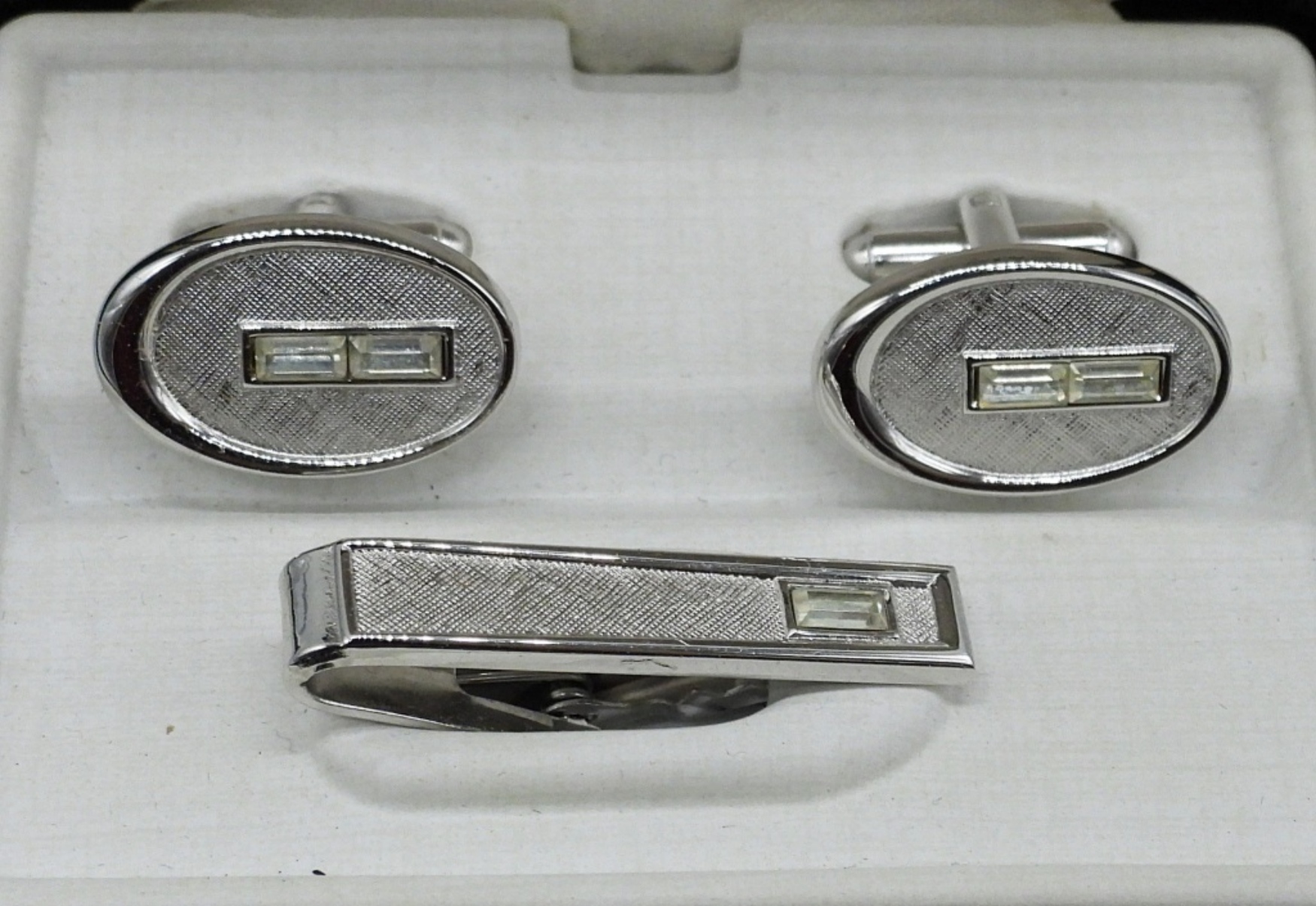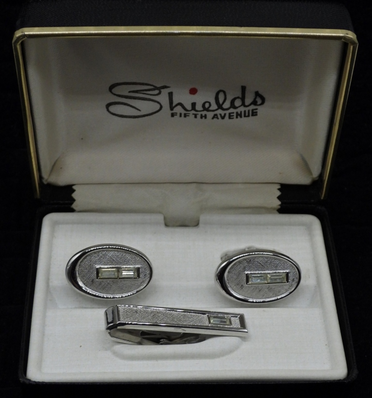 SILVER TONE, GEMSTONE CUFFLINKS & MATCHING TIE TACK FROM SHIELDS FIFTH AVENUE (ORIGINAL BOX).