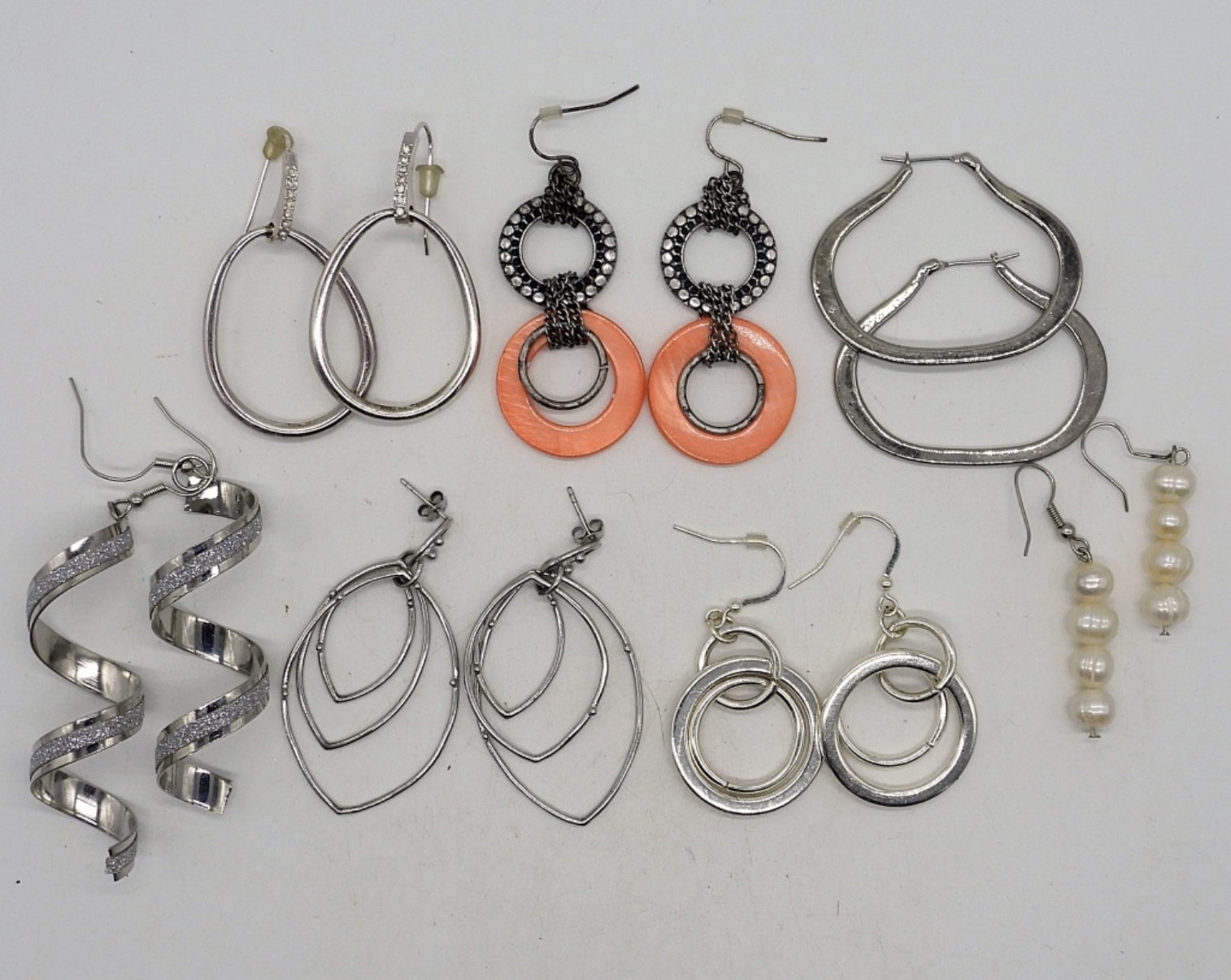 SEVEN PAIR OF CUTE SILVER TONE PIERCED EARRINGS.