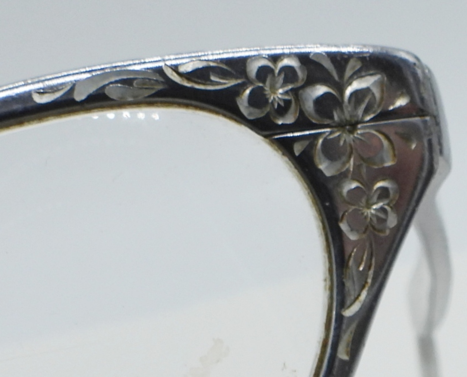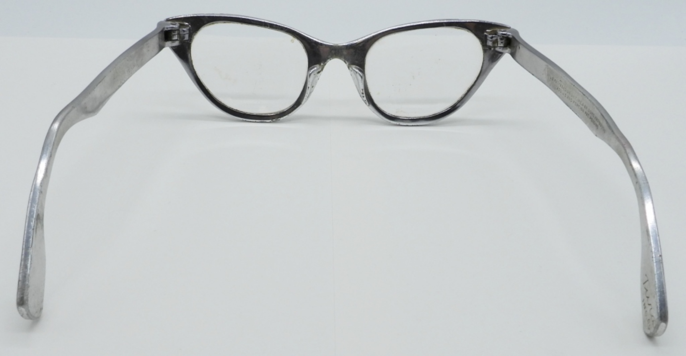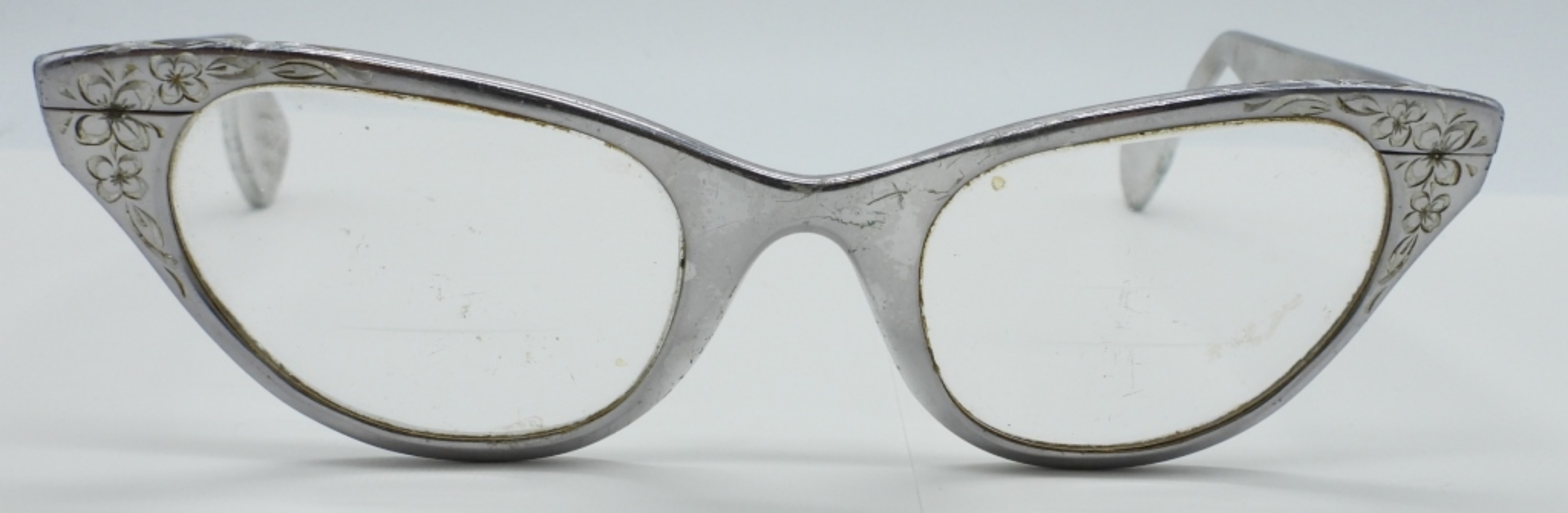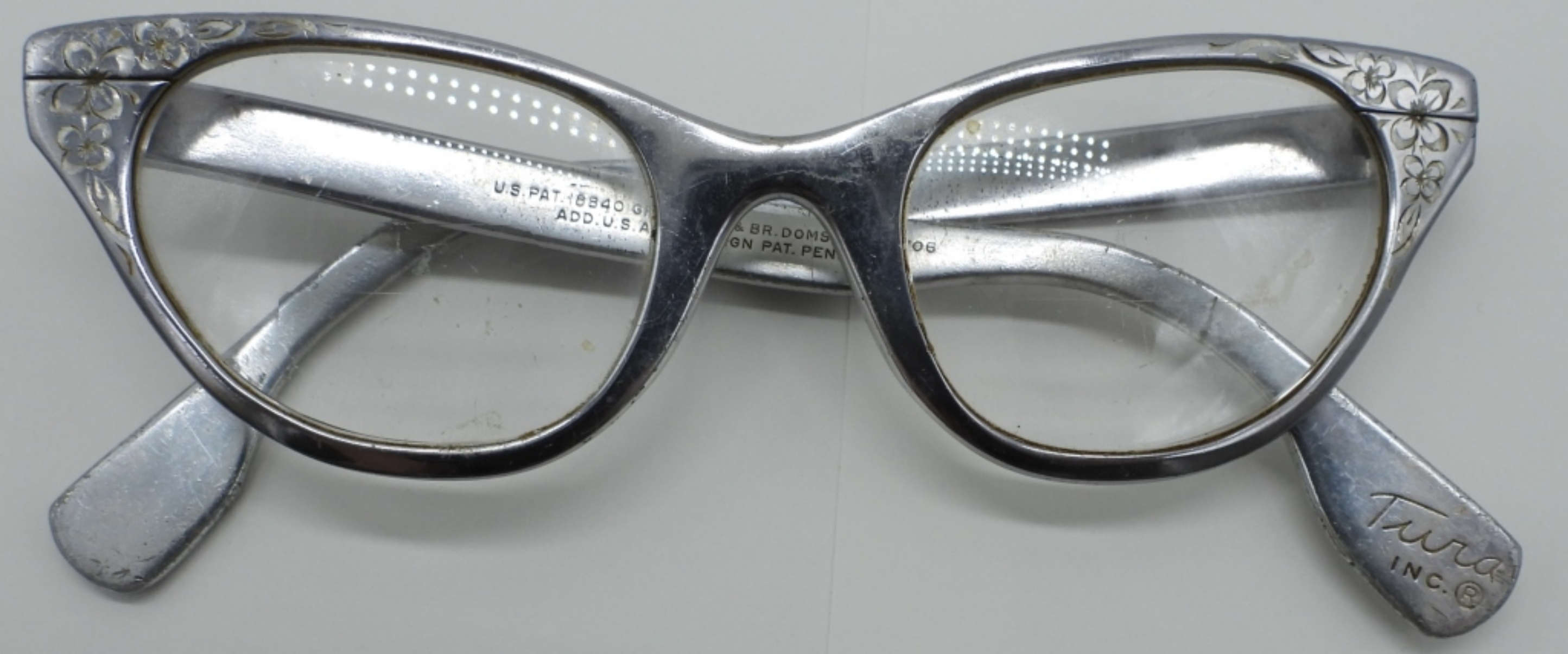 TURA BRAND,METAL FRAME CAT EYE ETCHED PRESCRIPTION GLASSES. CIRCA 1950/1960’s. 5″ WIDE.