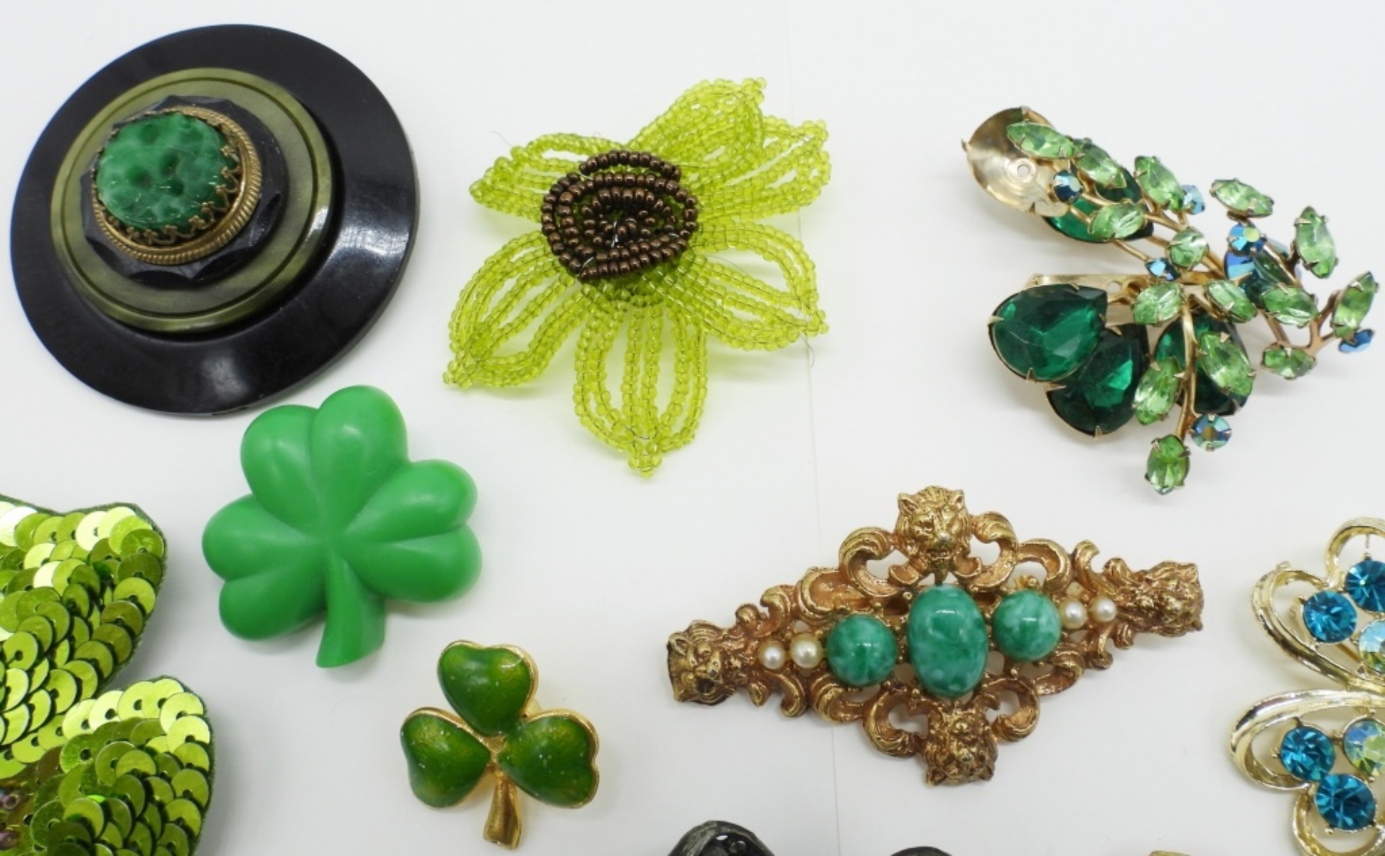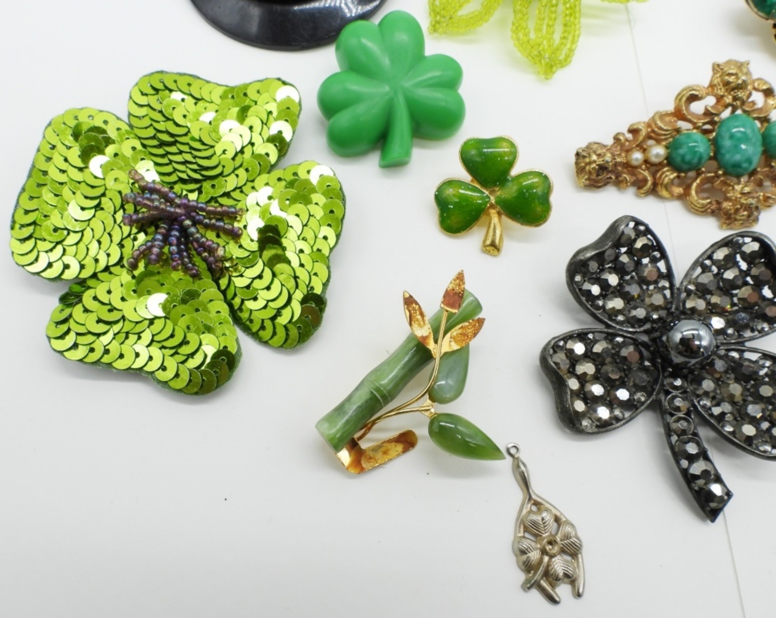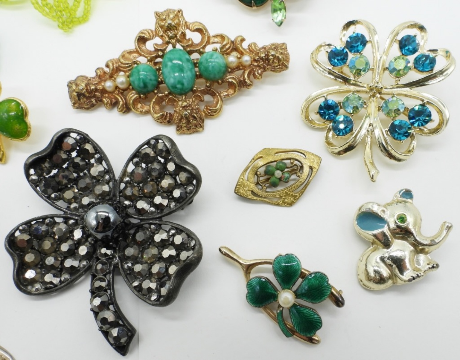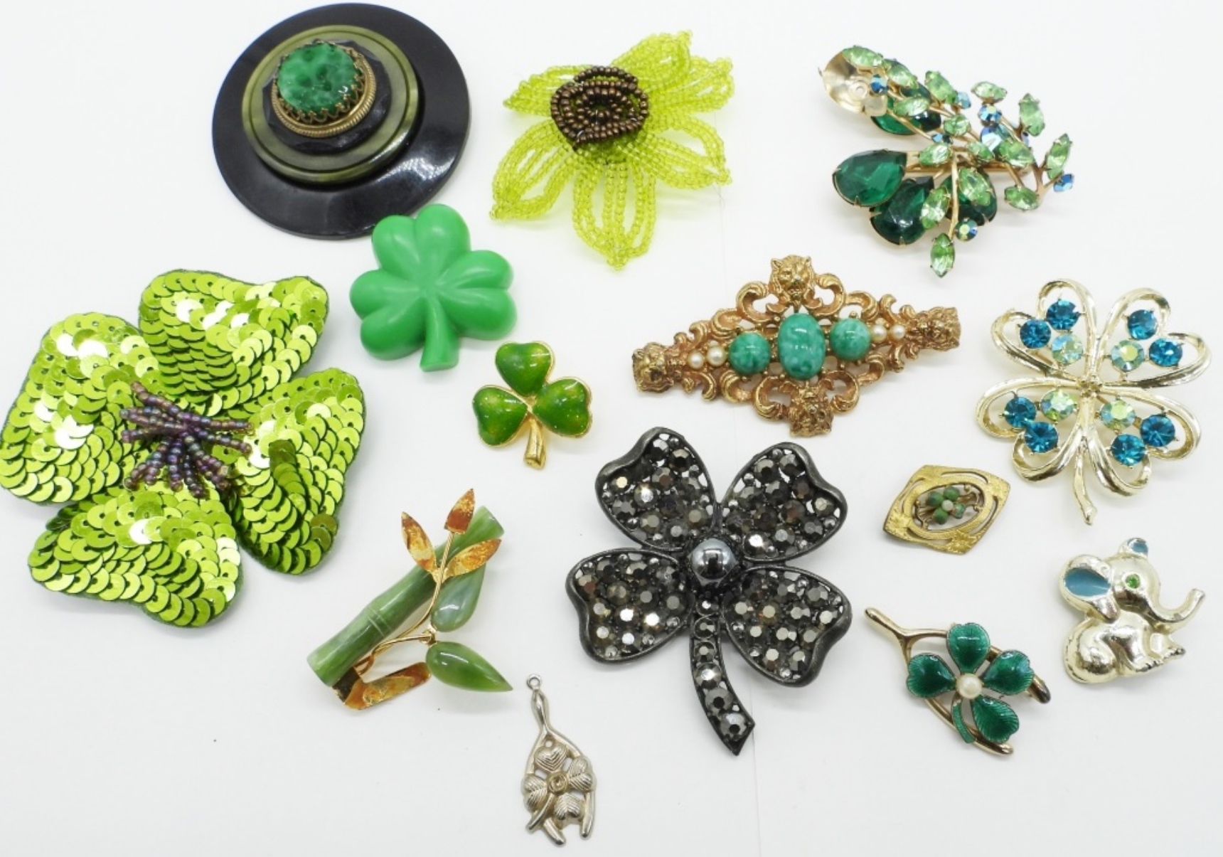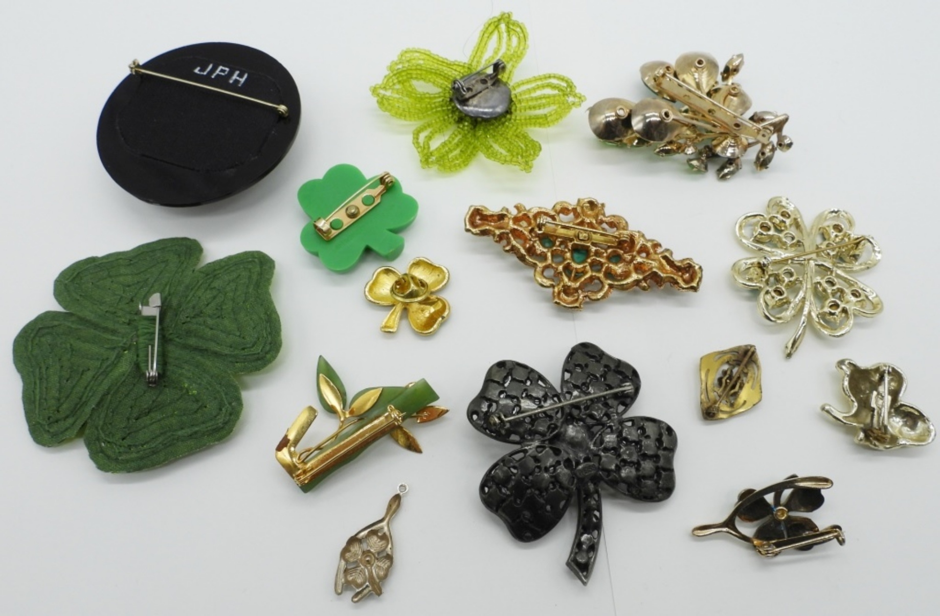 FOURTEEN PIECES. 13 BROOCHES. 1 FOUR LEAF CLOVER PENDANT.