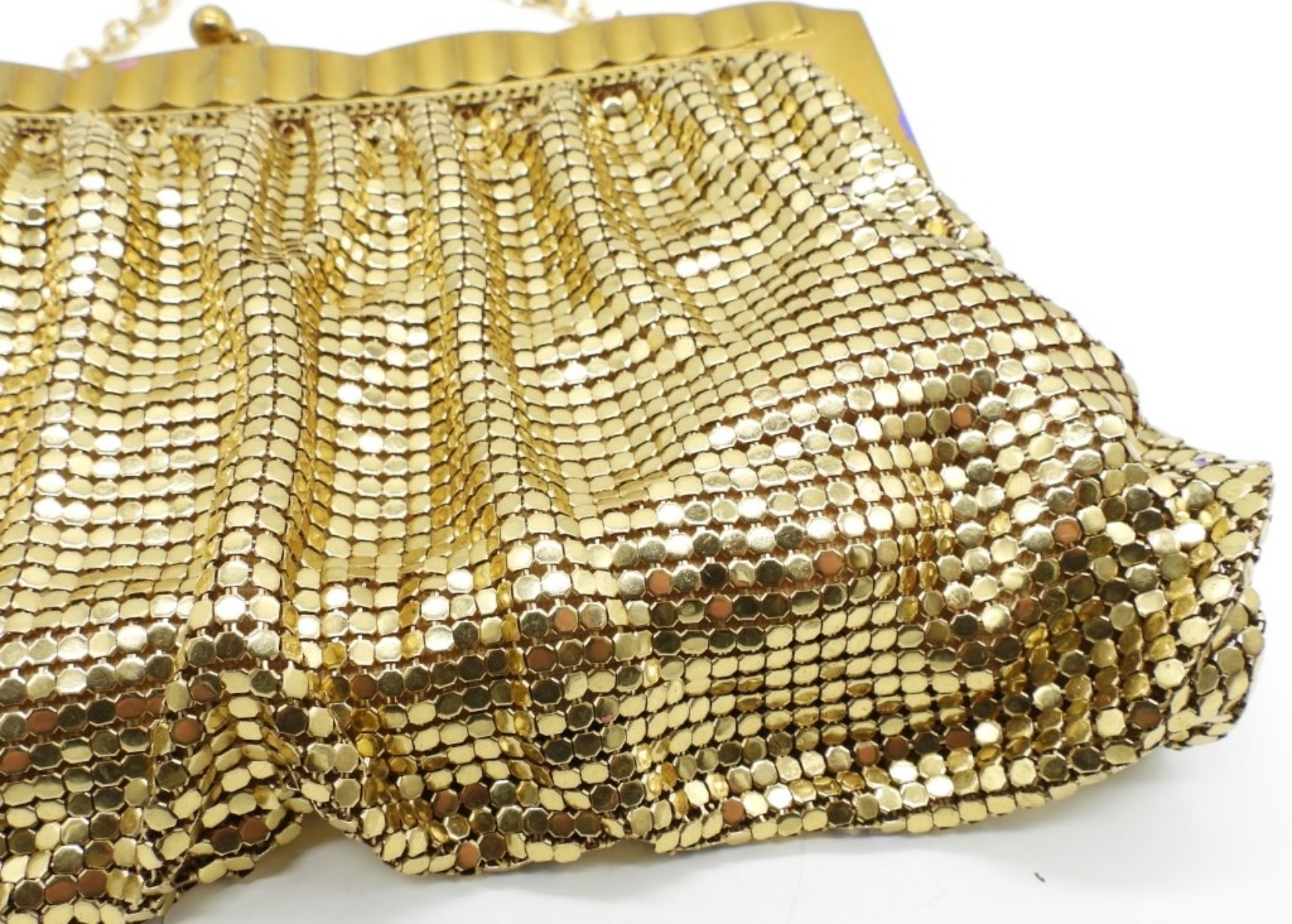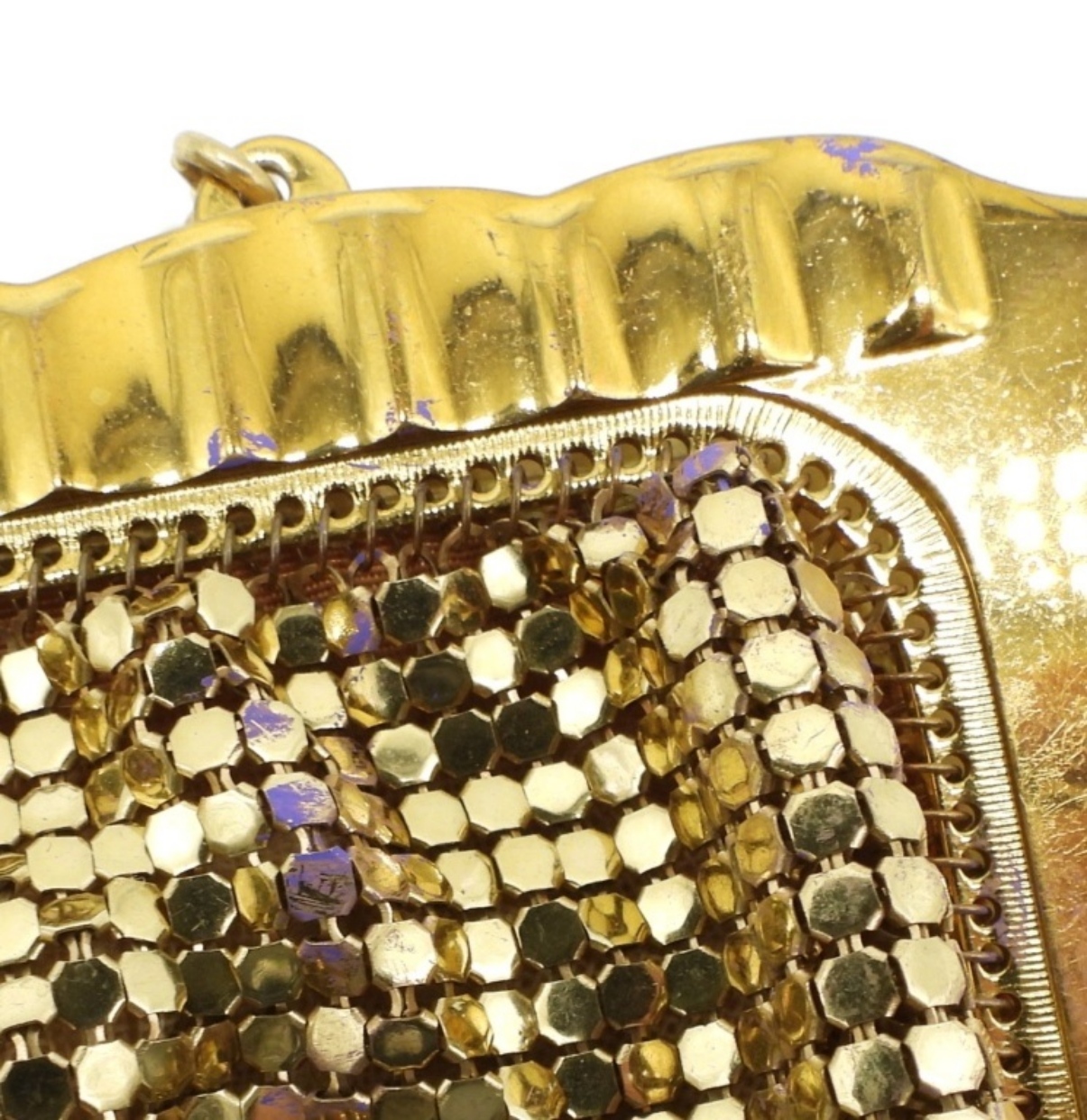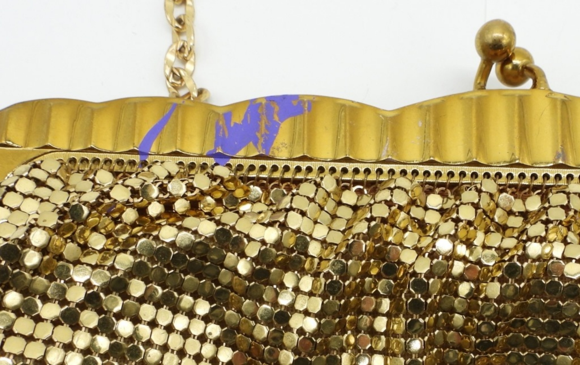 WHITING AND DAVIS MESH BAG, GOLD TONE. HAS SOME PURPLE PAINT OR NAILPOLISH ON ONE SIDE. 9″ WIDE 5″DEEP.