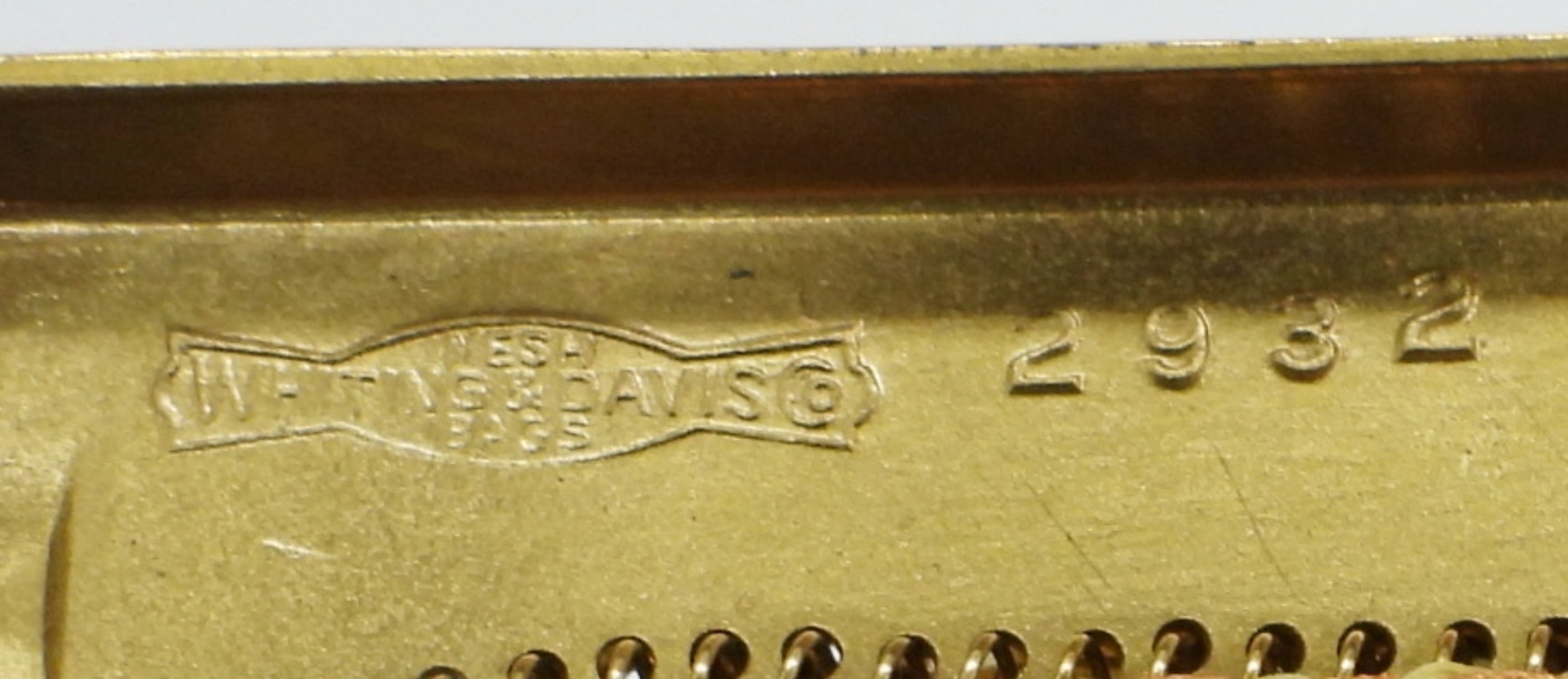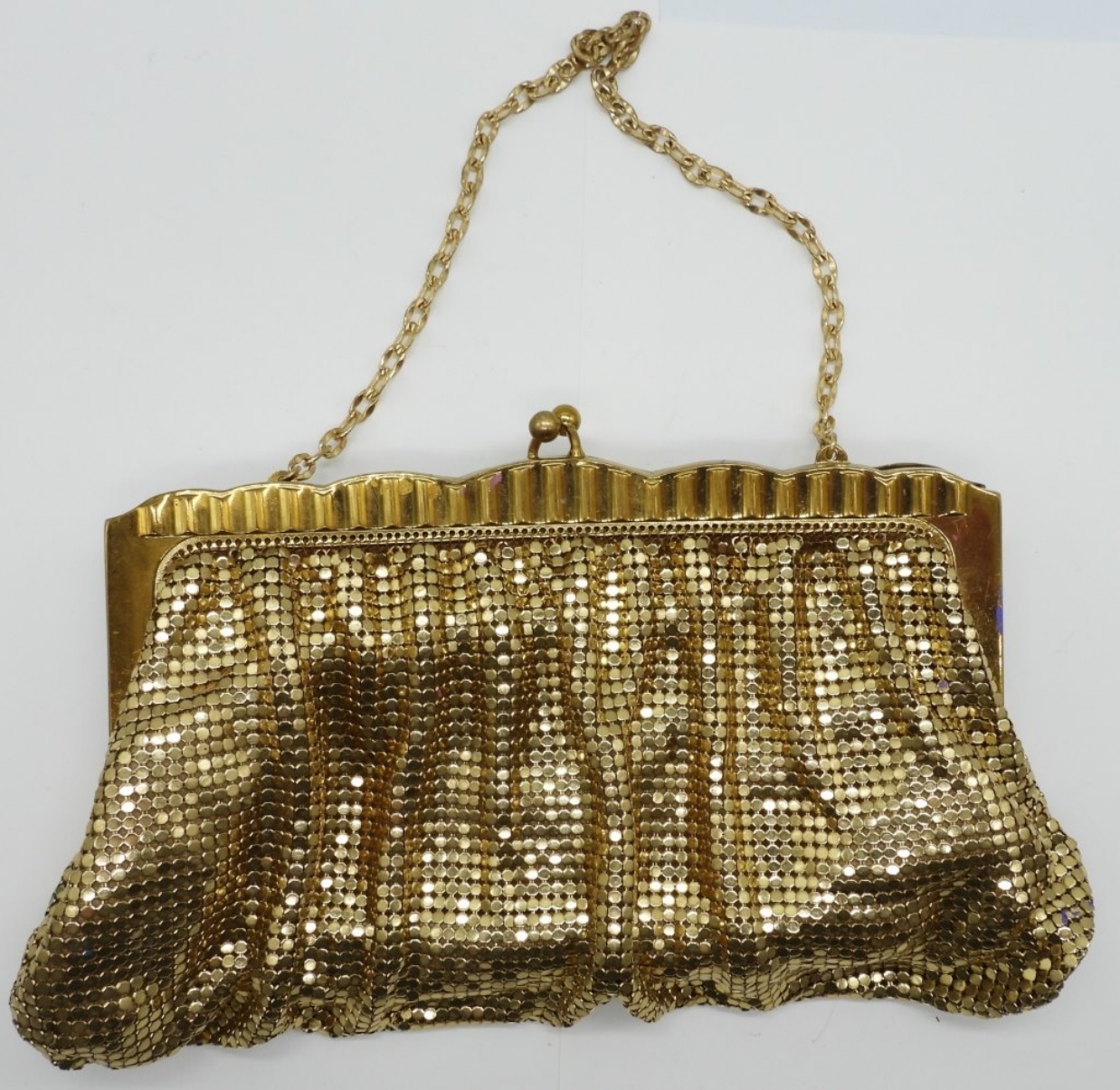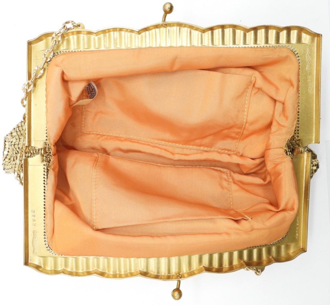 WHITING AND DAVIS MESH BAG, GOLD TONE. HAS SOME PURPLE PAINT OR NAILPOLISH ON ONE SIDE. 9″ WIDE 5″DEEP.