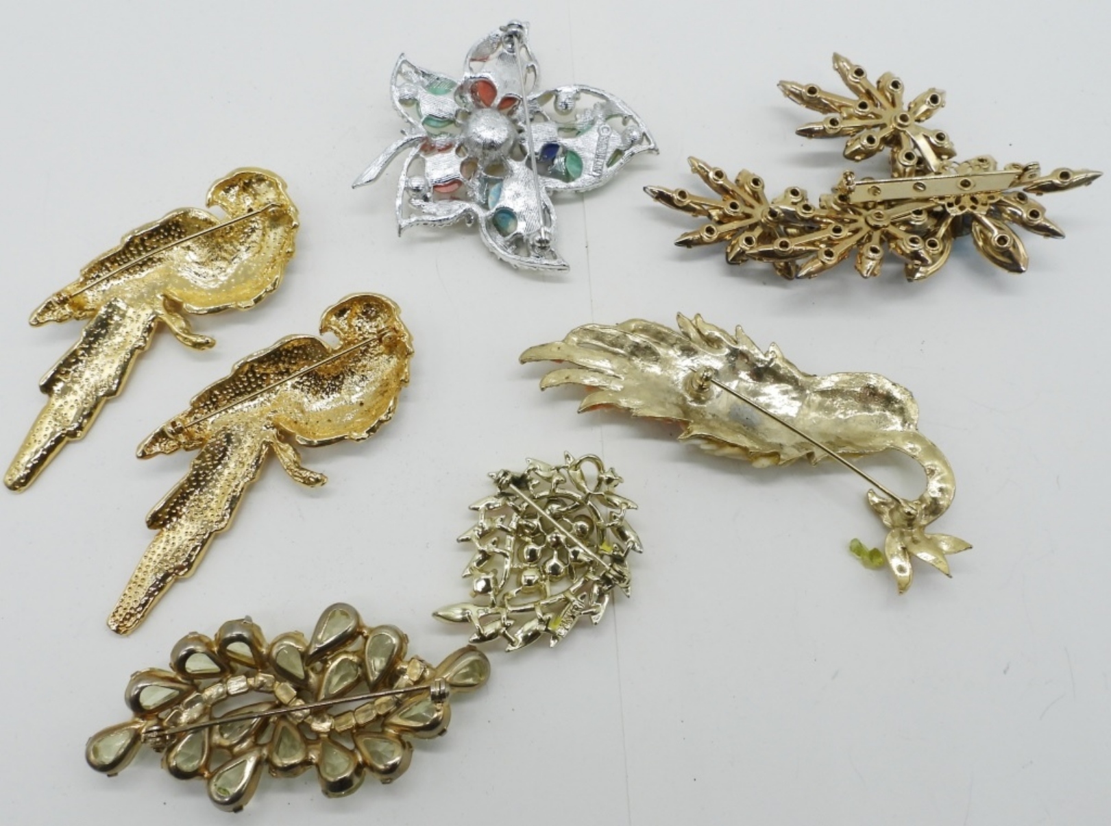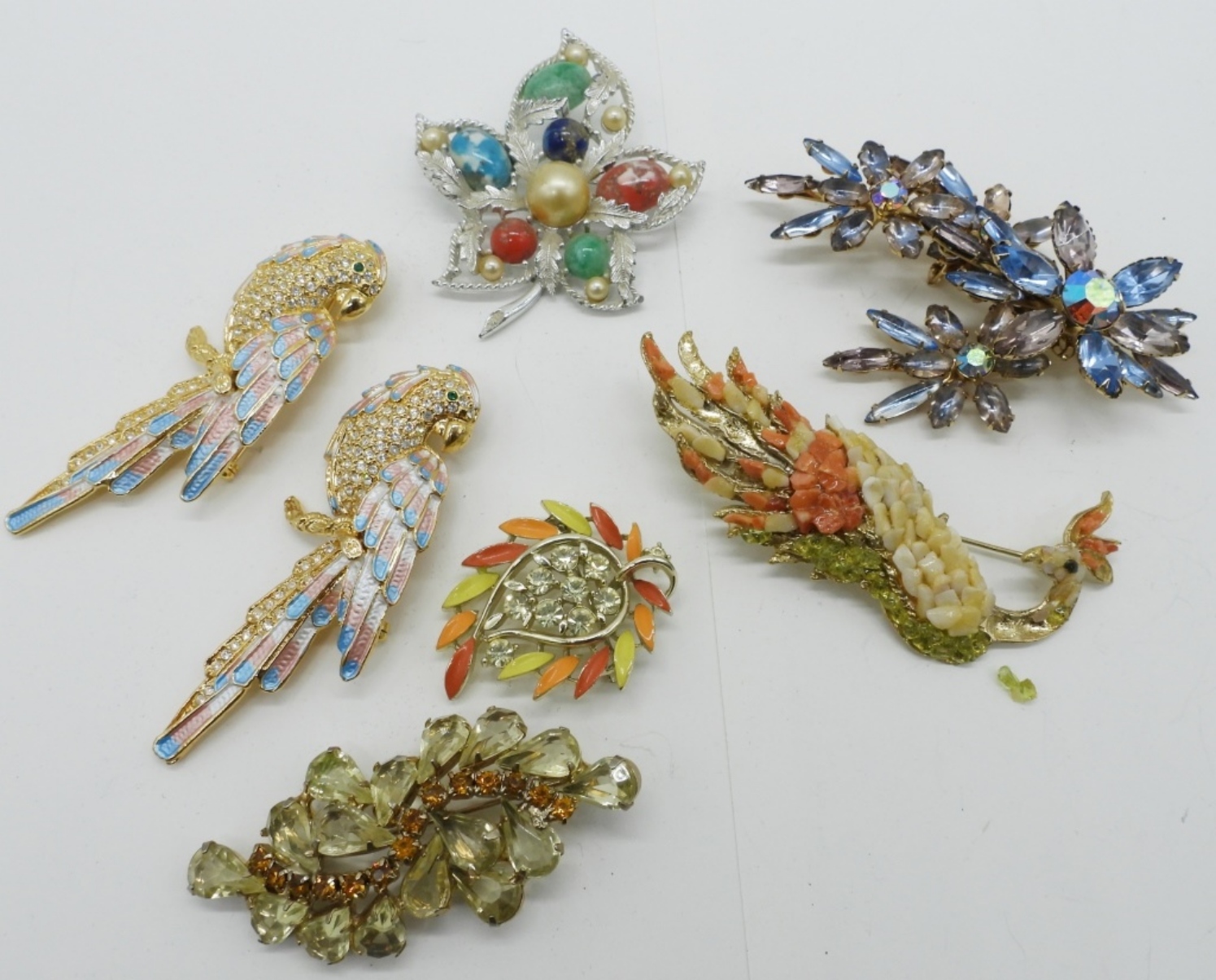 SEVEN COLORFUL RHINESTONE & GEMSTONE VINTAGE BROOCHES. 2″-4″.
