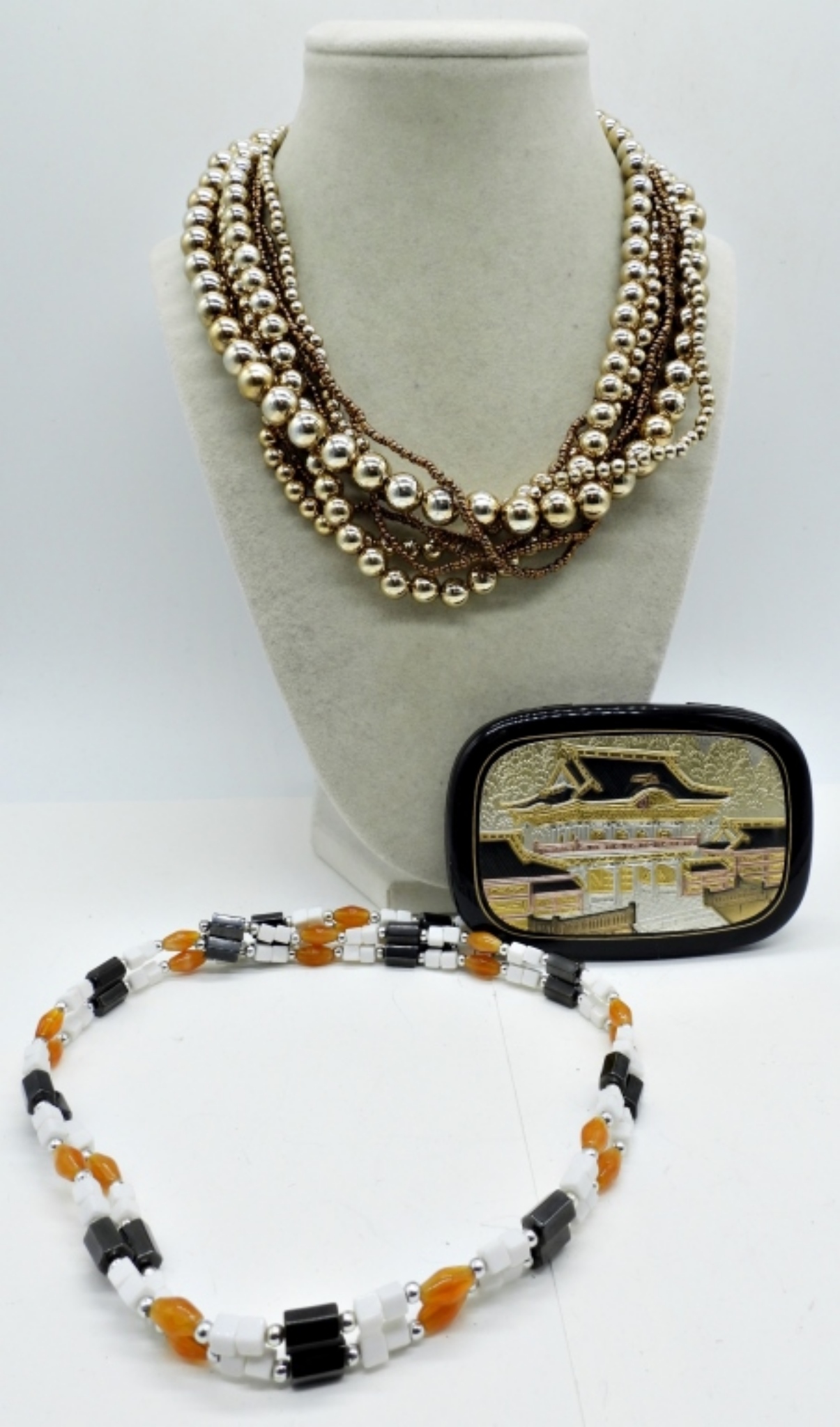 BLACK PLASTIC, GOLD TONES ETCHED SCENE, 4″x2.5″. NECKLACES ARE 20-34″.