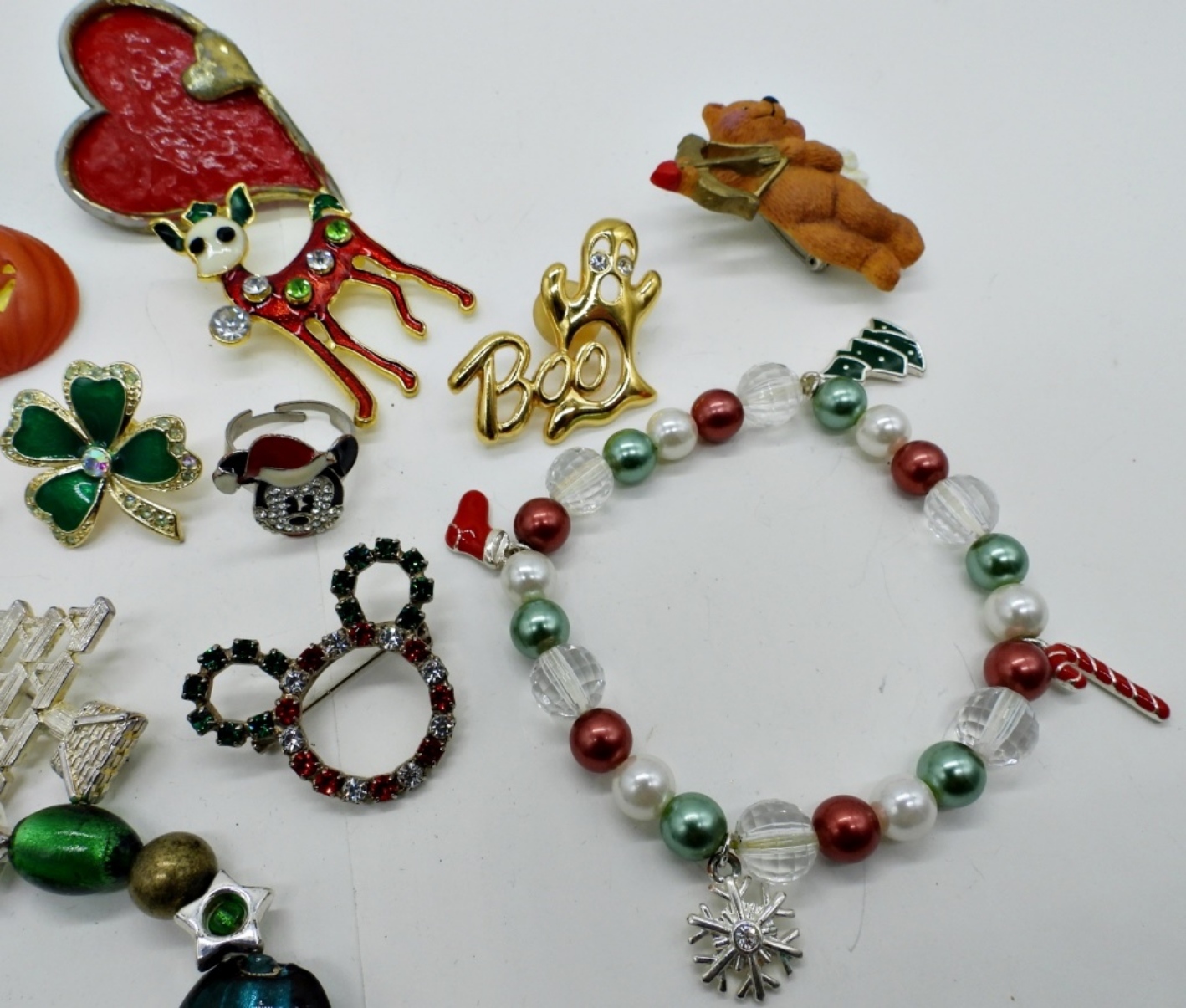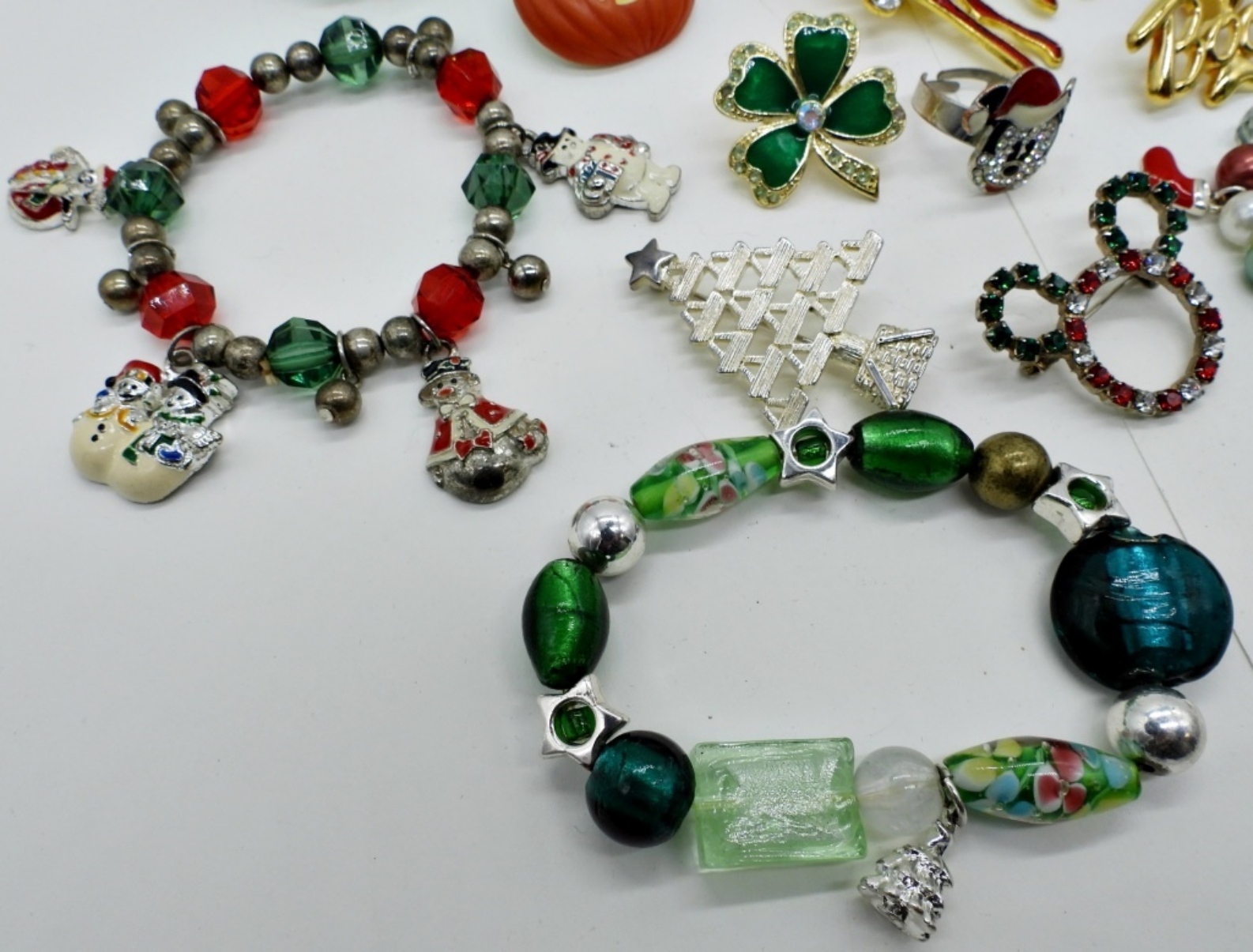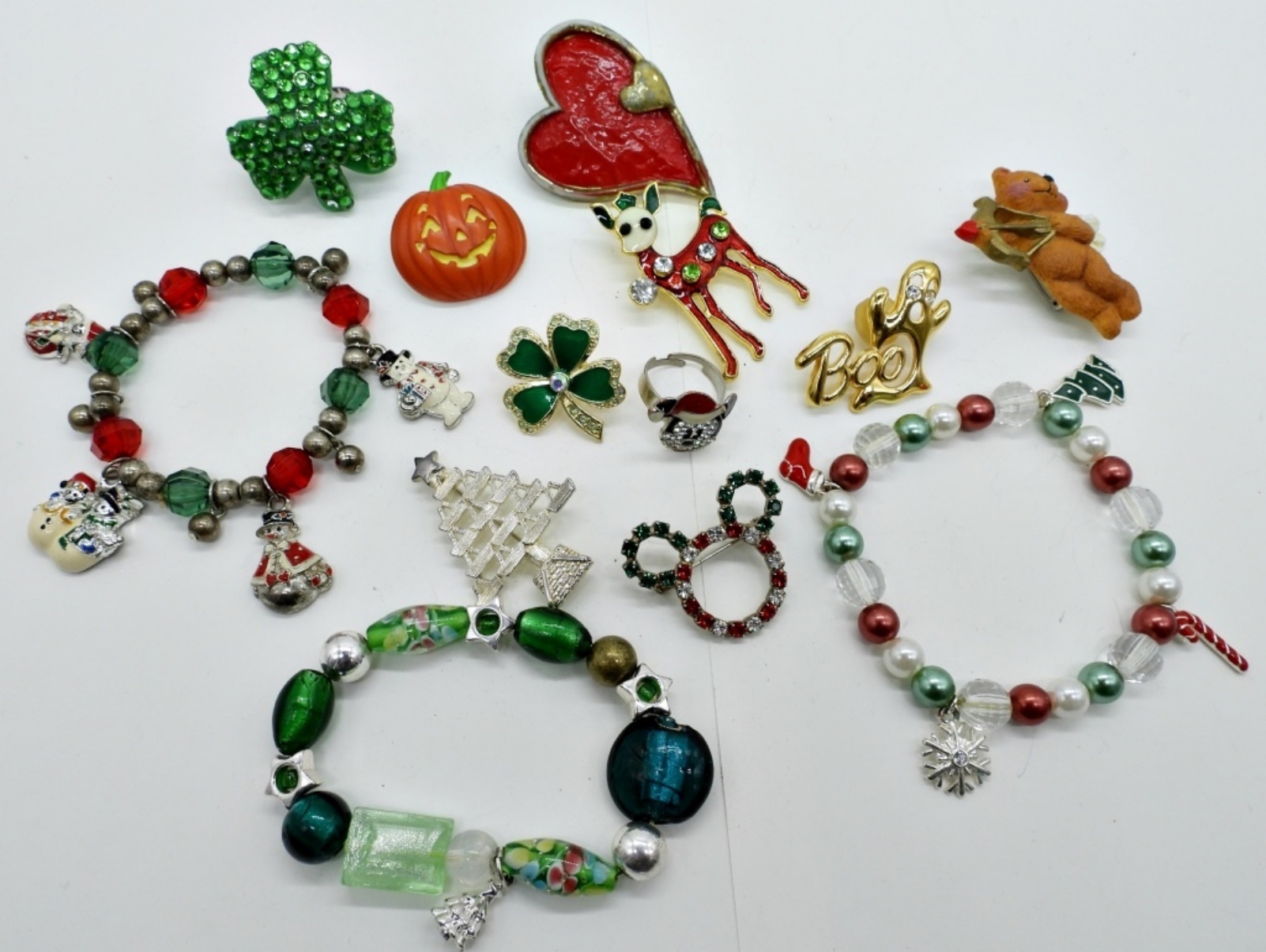 HALLOWEEN, CHRISTMAS, VALENTINES DAY, ST PATS DAY. 3 BRACELETS, TWO RINGS, 8 PINS.