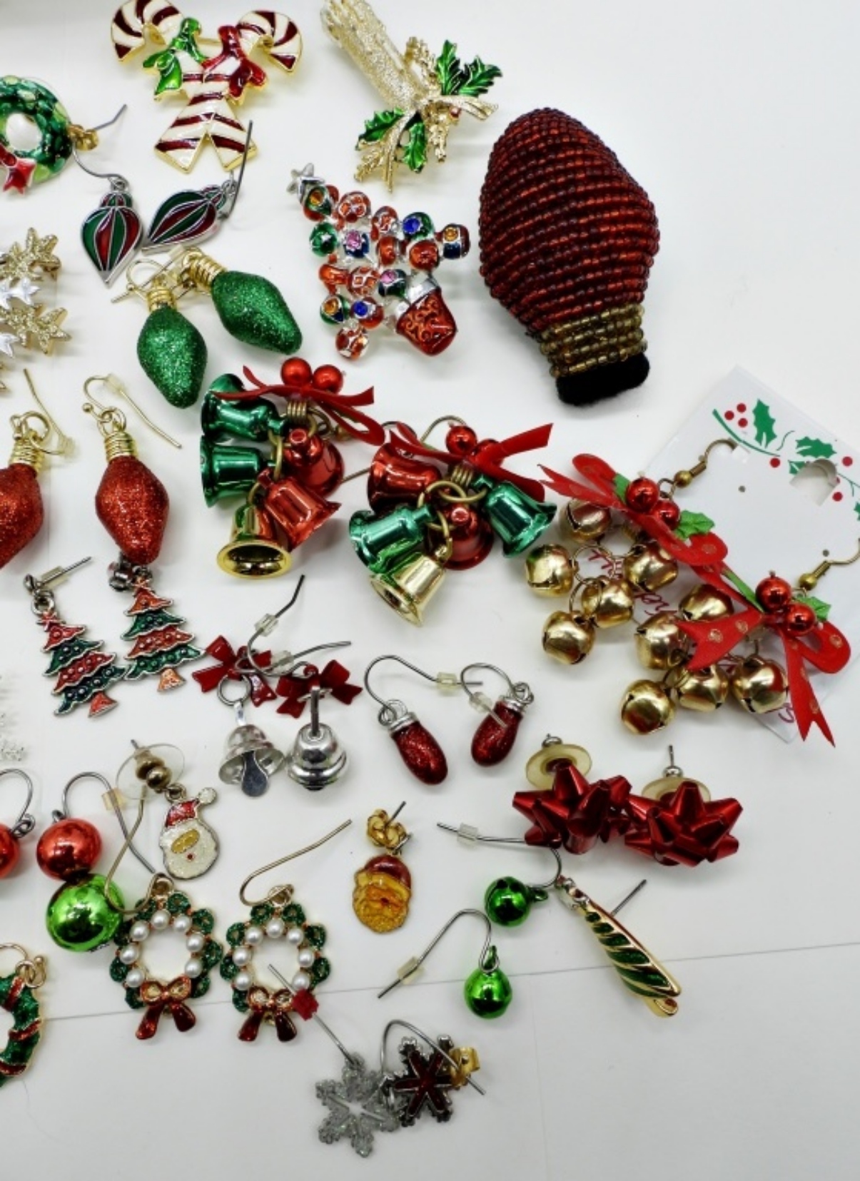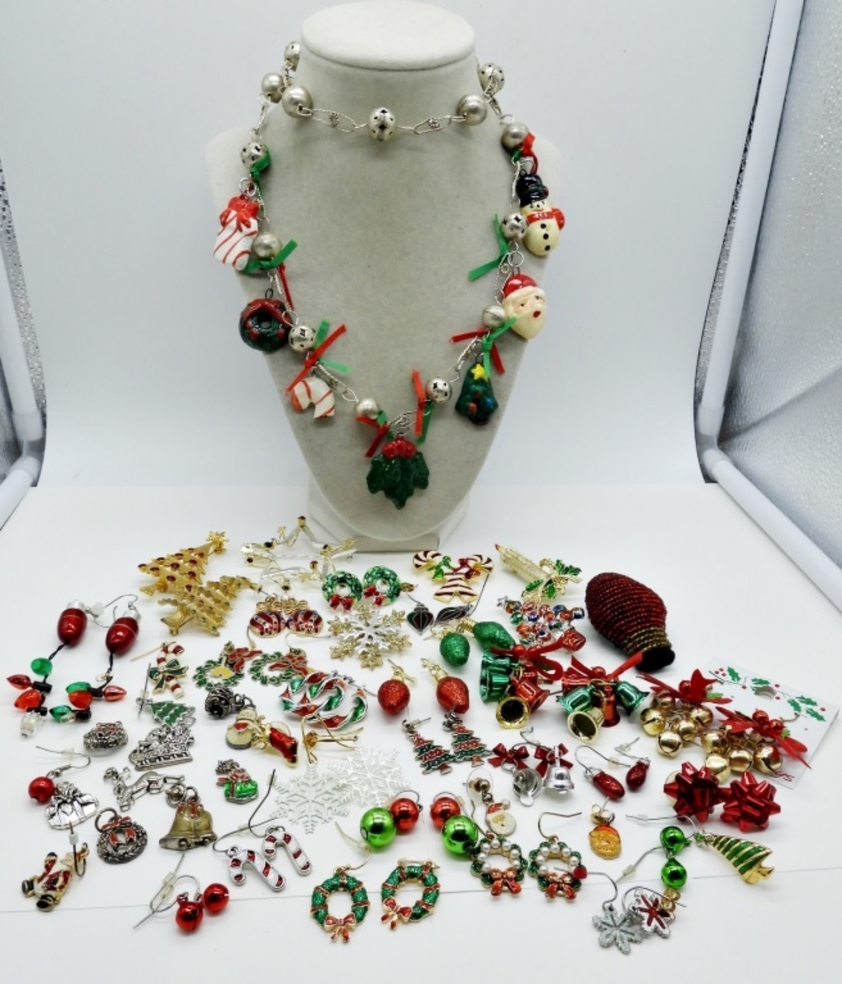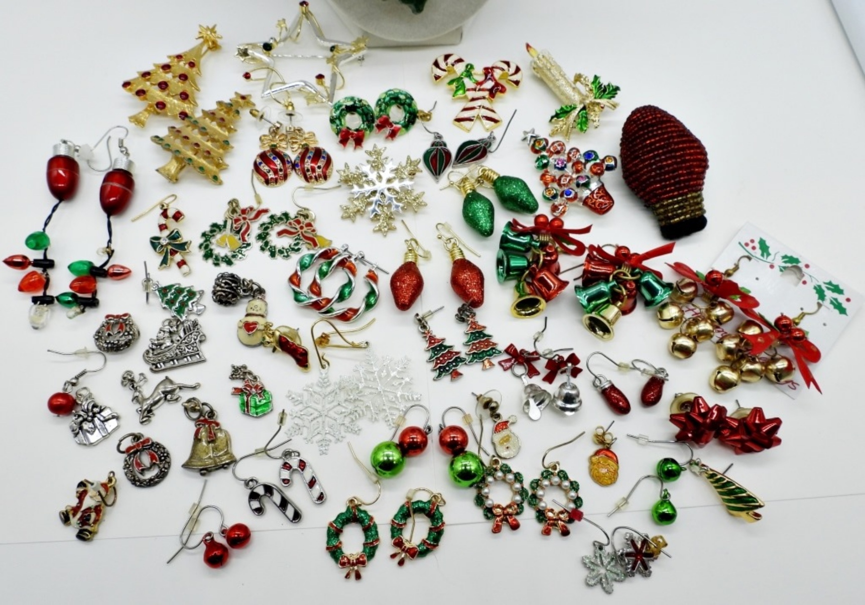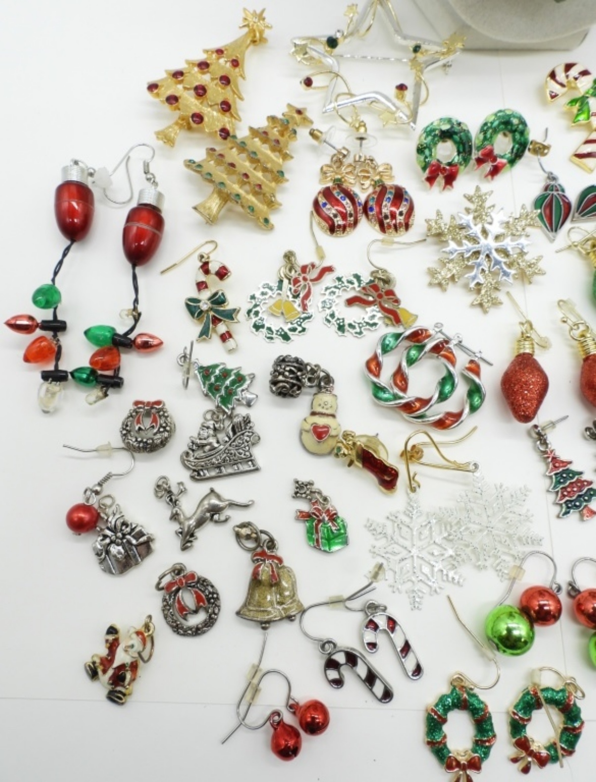 22 PAIR OF PIERCED EARRINGS. 8 UNMATCHED EARRINGS. 8 SILVER TONE PENDANTS. 8 PINS. ONE 30″ NECKLACE.