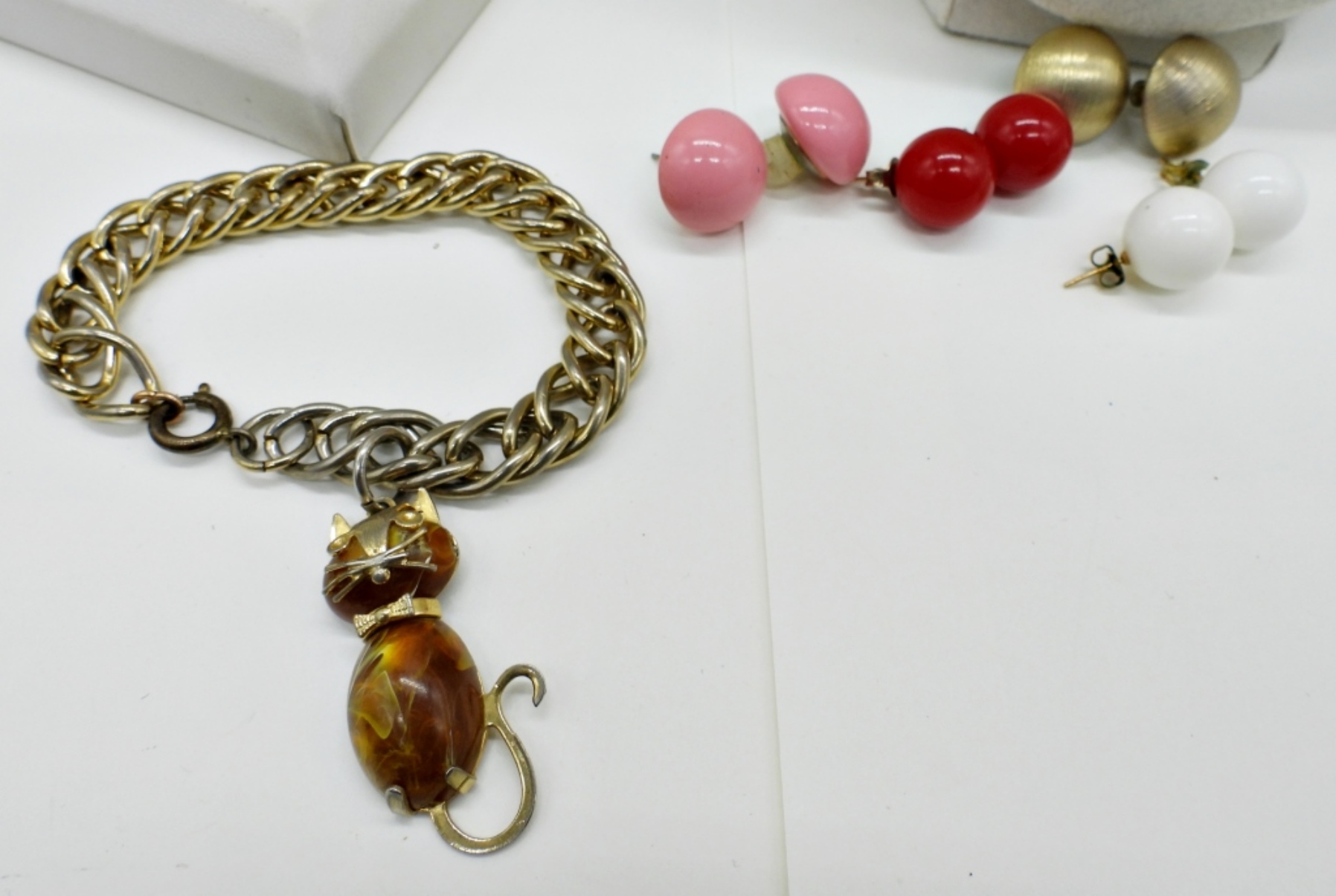 3 NECKLACES, 18-24″. CAT BRACELET, 6″. 5 PAIR OF PIERCED EARRINGS.