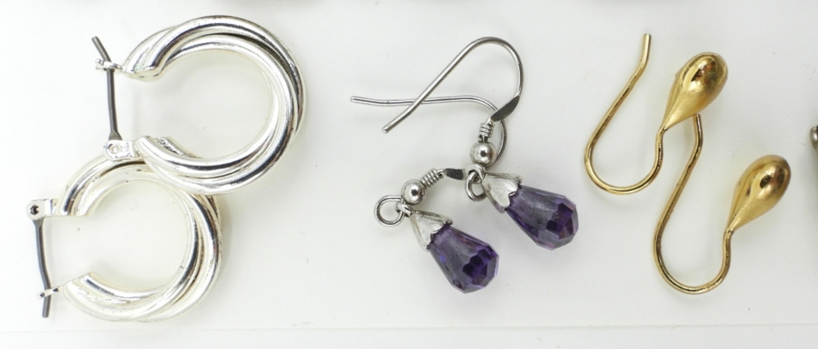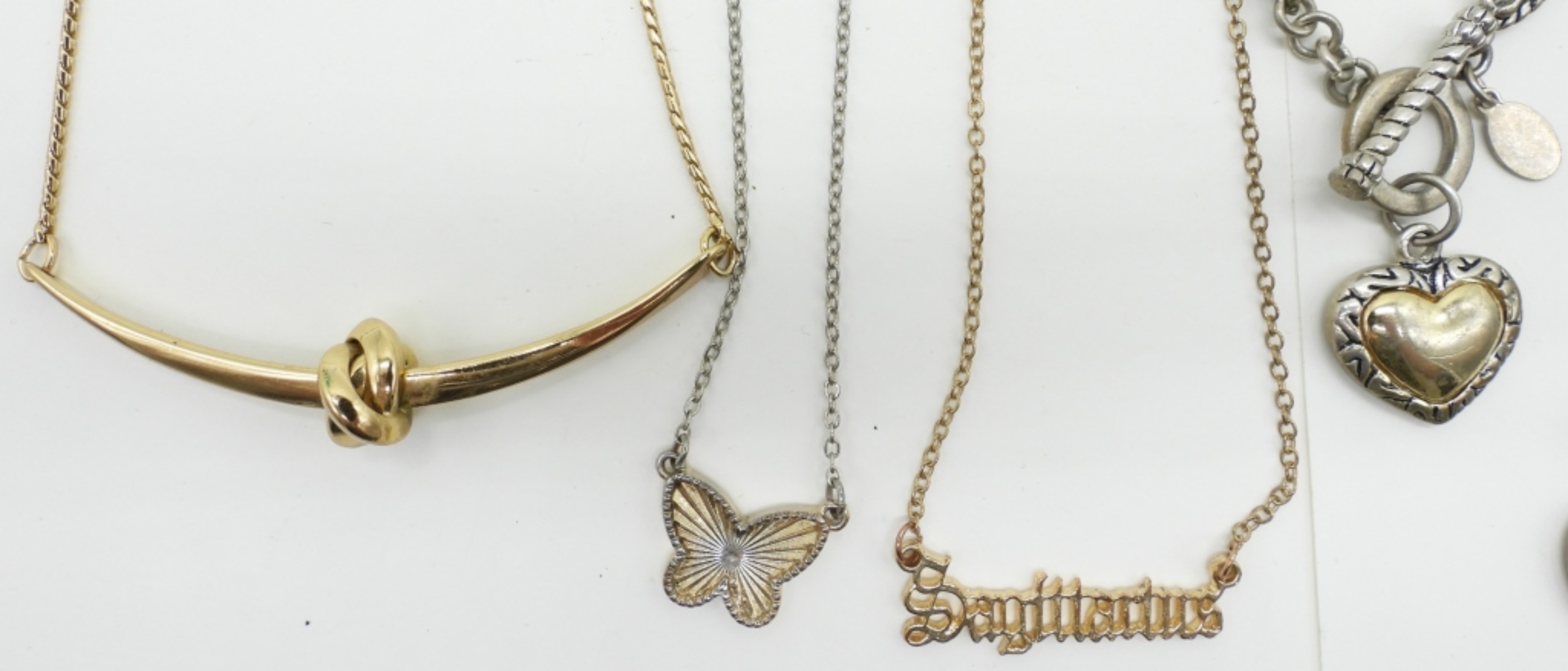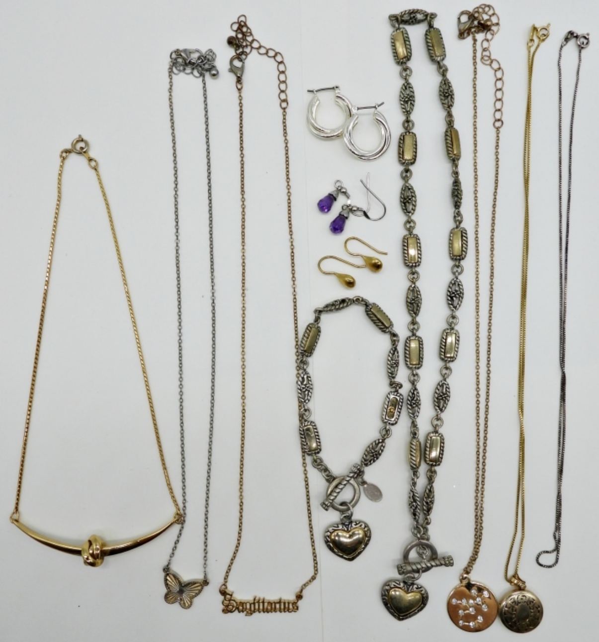 7 NECKLACES, 15-20″. 3 PAIR OF PIERCED EARRINGS. 8″ BRACELET.