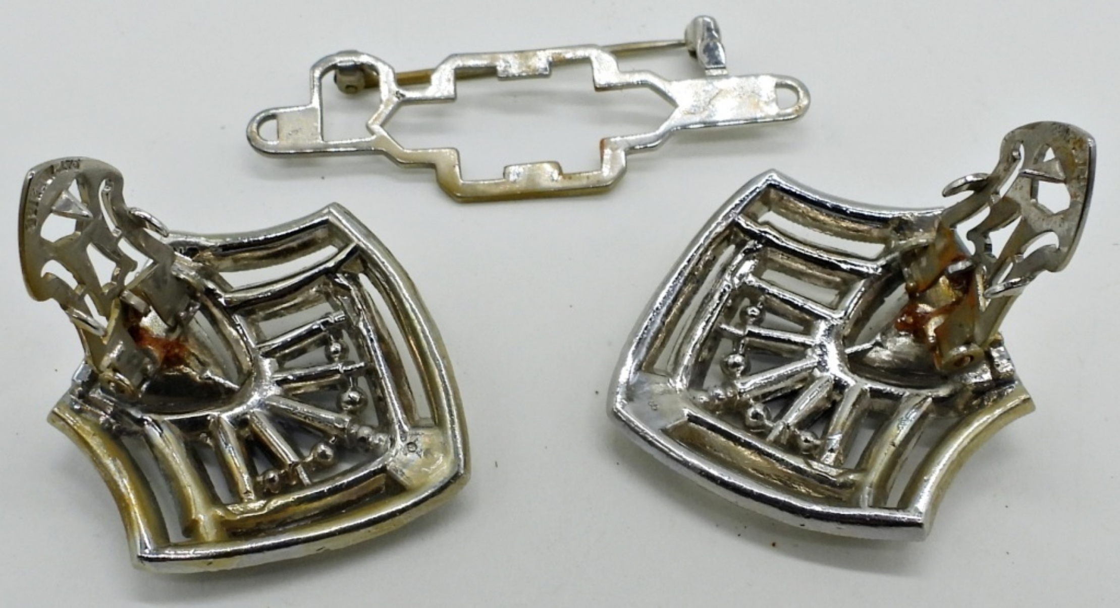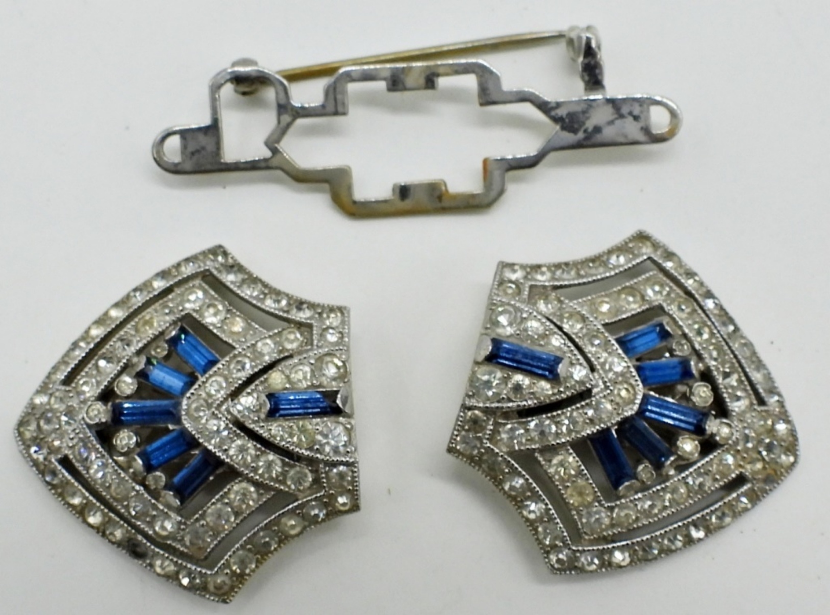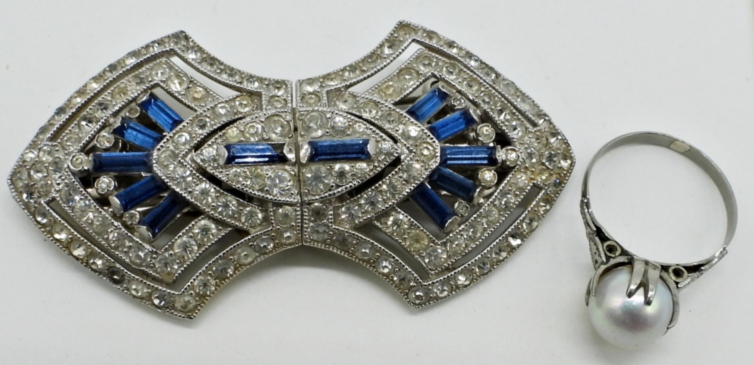 CORO DUETTE SAPPHIRE BLUE & CRYSTAL RHINESTONE BROOCH / CLIP. NO MISSING RHINESTONES. 2.5″. SILVER TONE PEARL RING SIZE 5.
