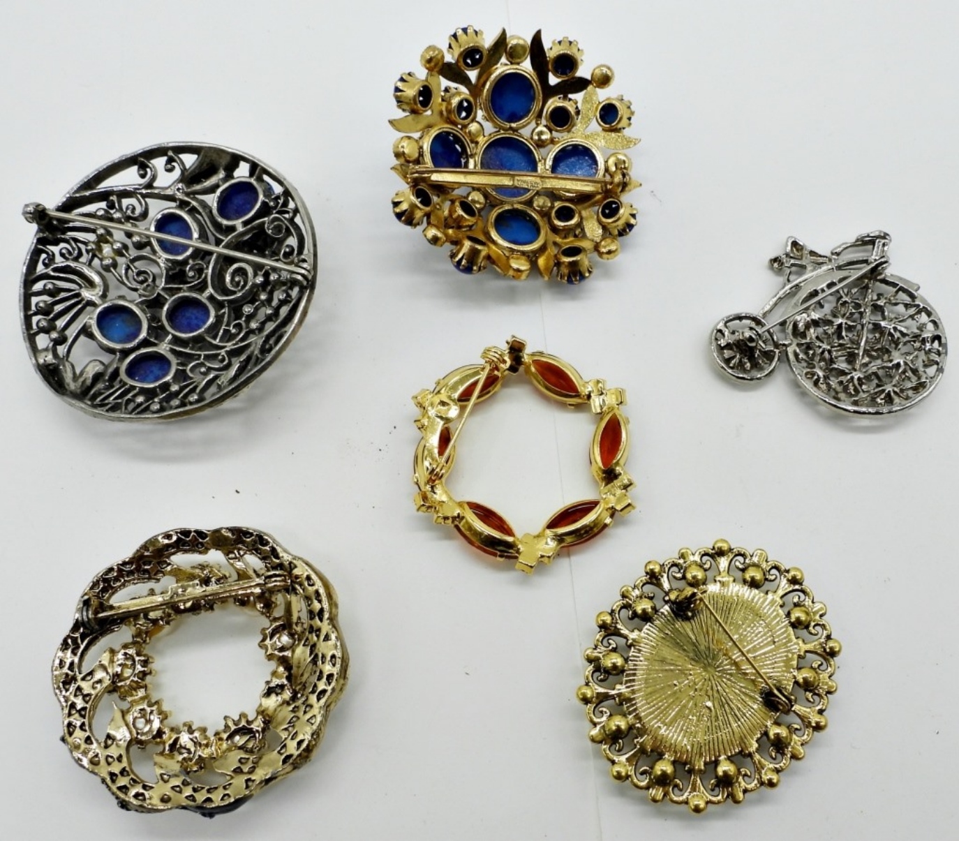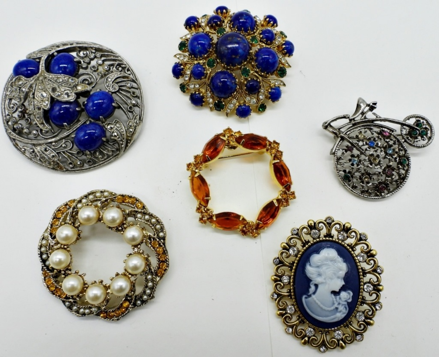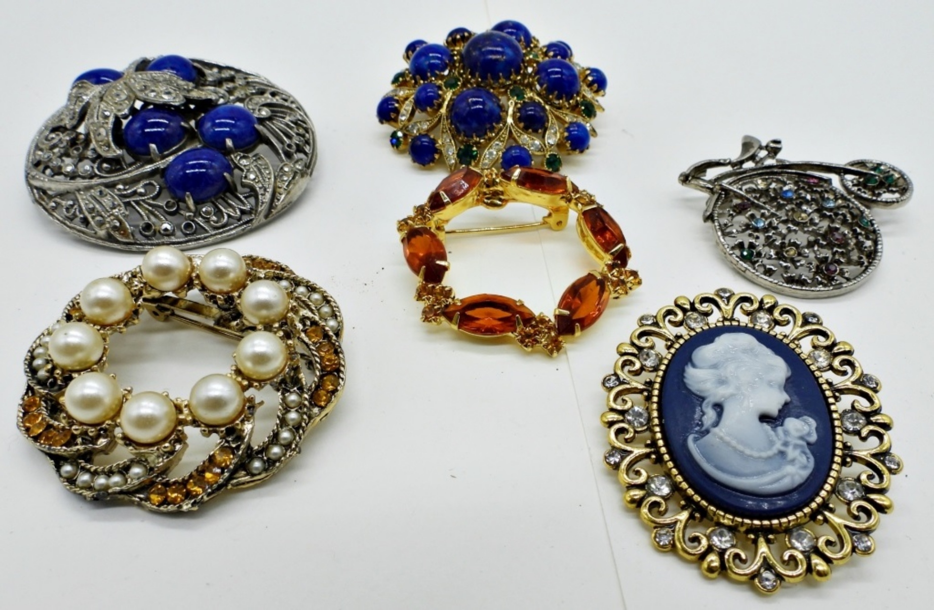 SIX GEMSTONE BROOCHES. GOLD AND SILVER TONES. 2-2.5″.