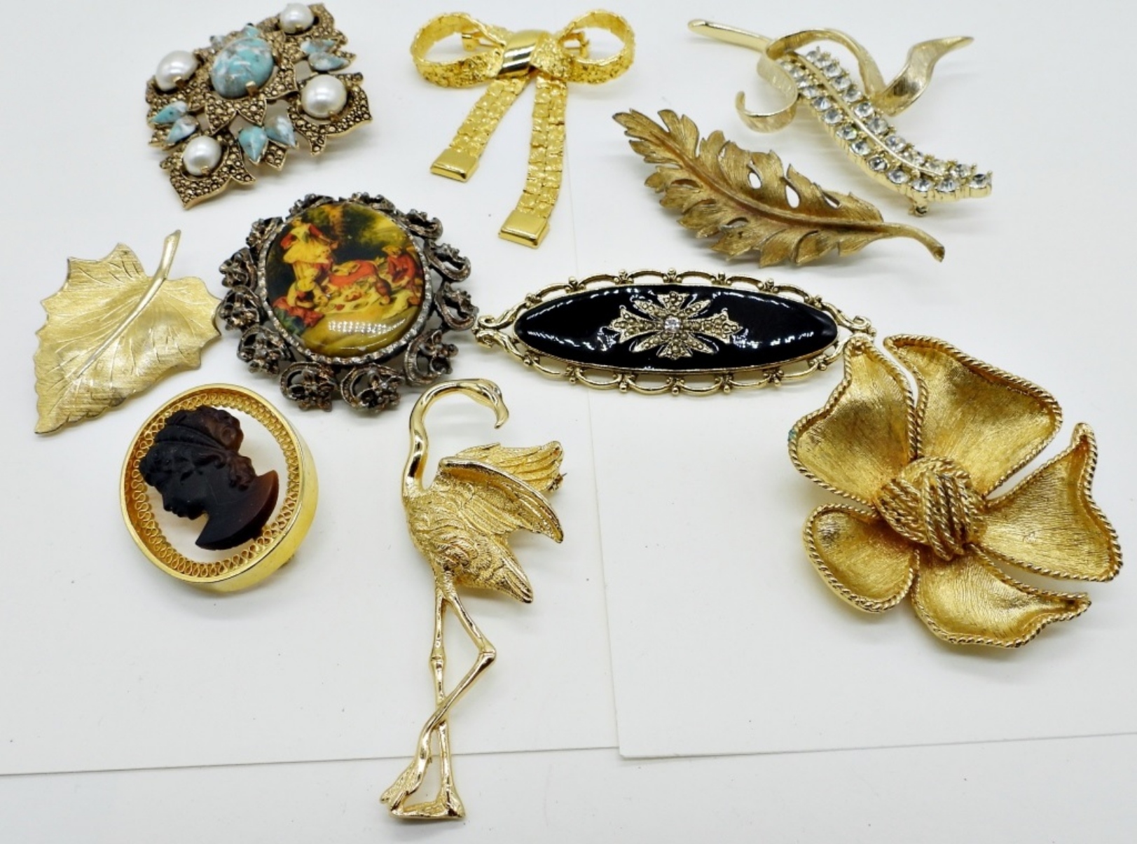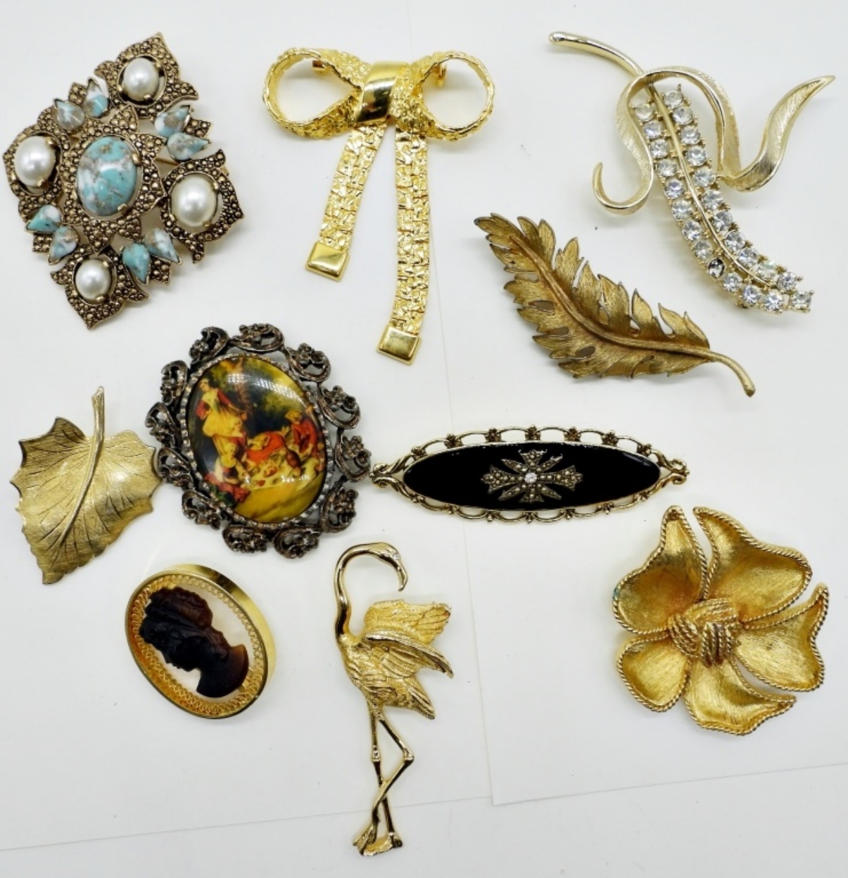 TEN GOLD TONE BROOCHES. 2″-4″.