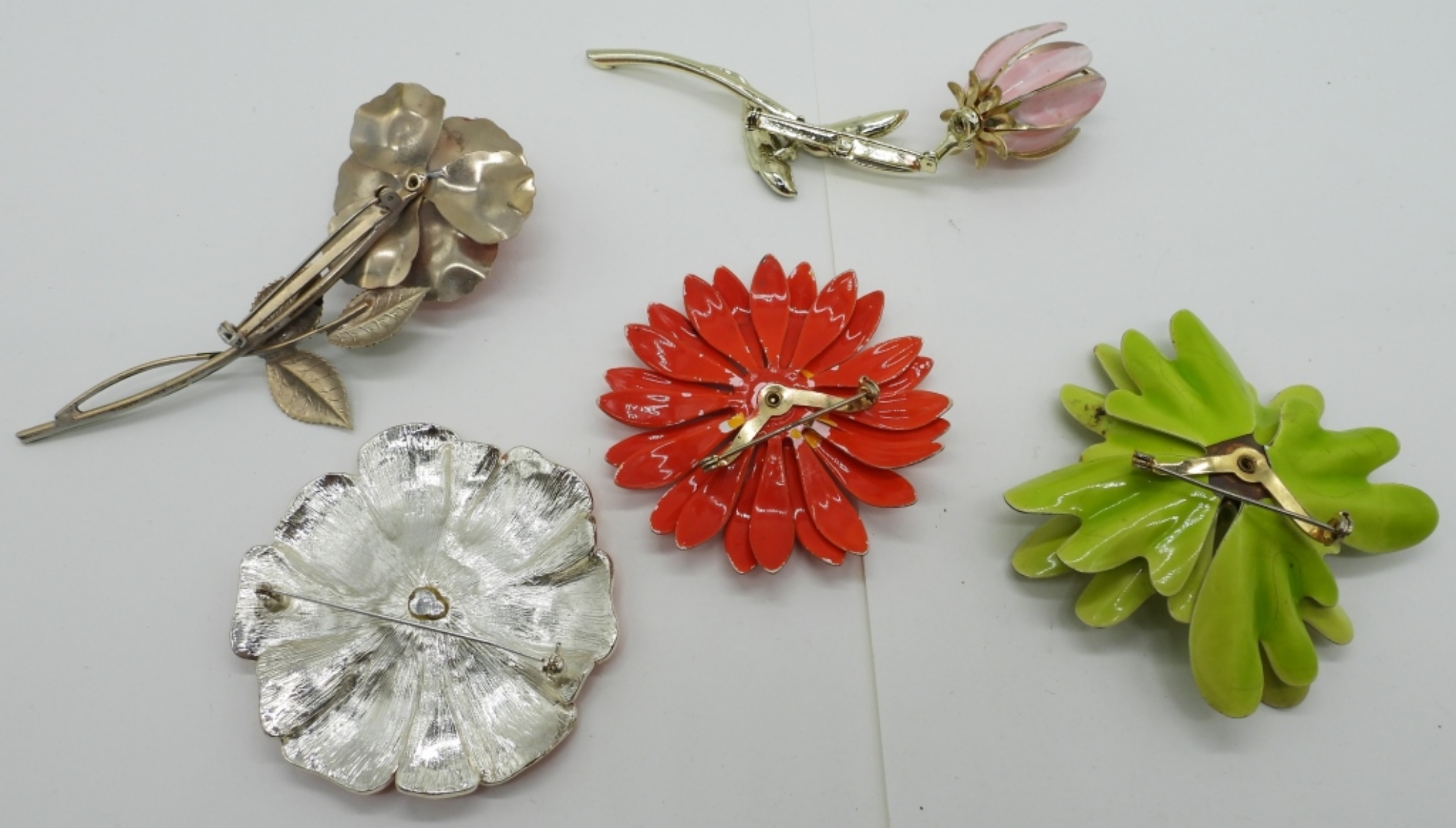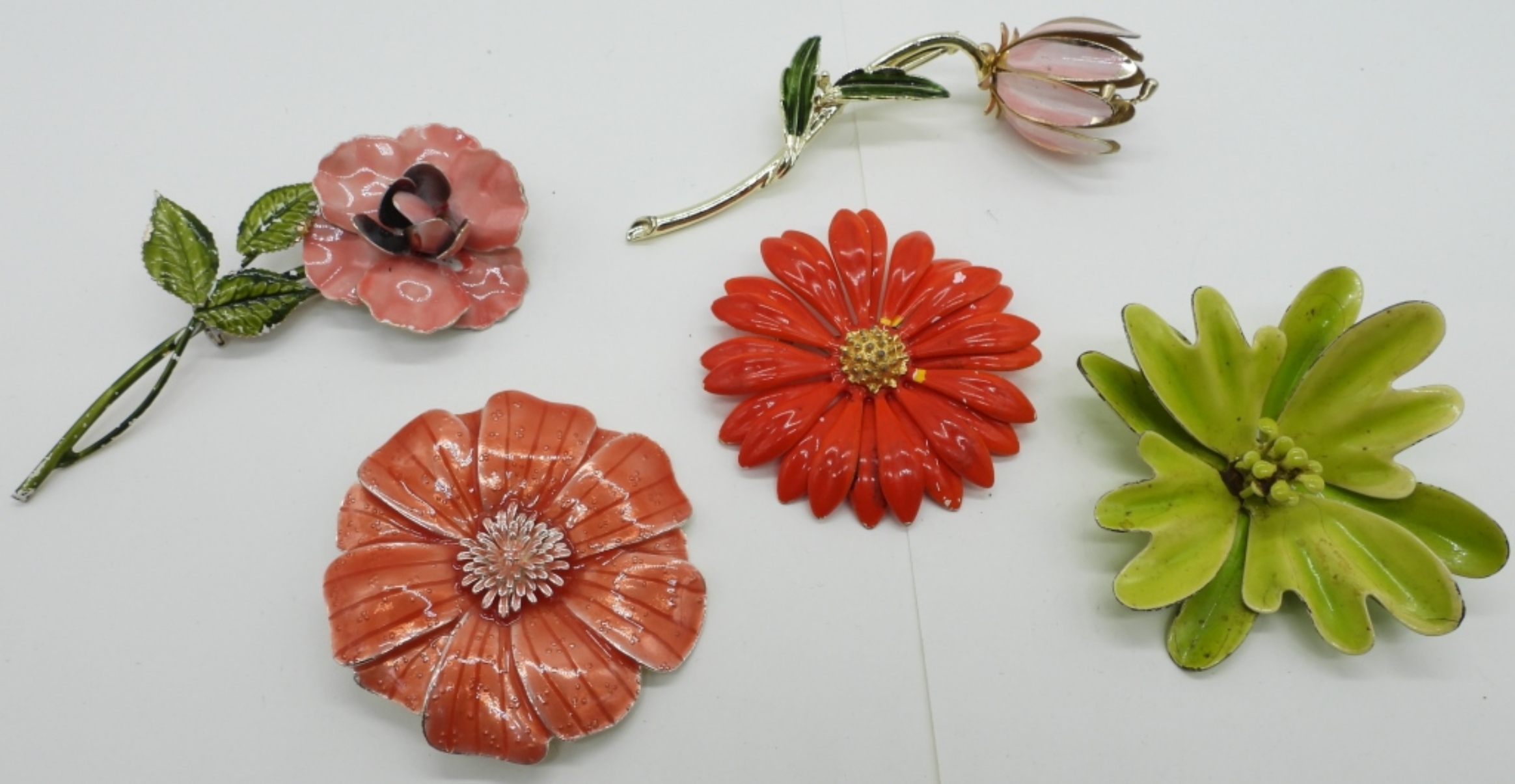 FIVE VINTAGE ENAMELED FLOWER BROOCHES. 3″-5″.