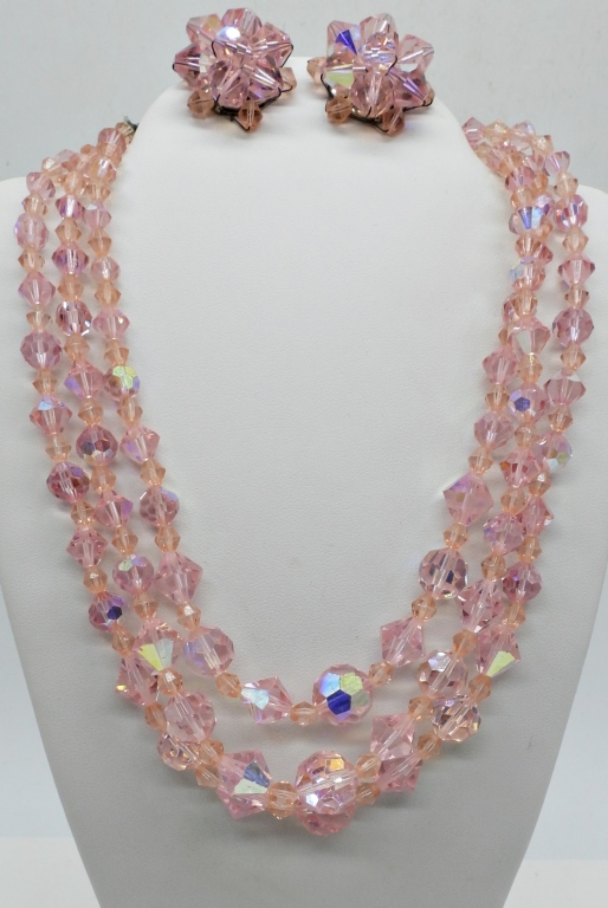 VINTAGE PRETTY PINK GLASS CRYSTAL BEADED NECKLACE, 17″. MATCHING CLIP ON EARRINGS.