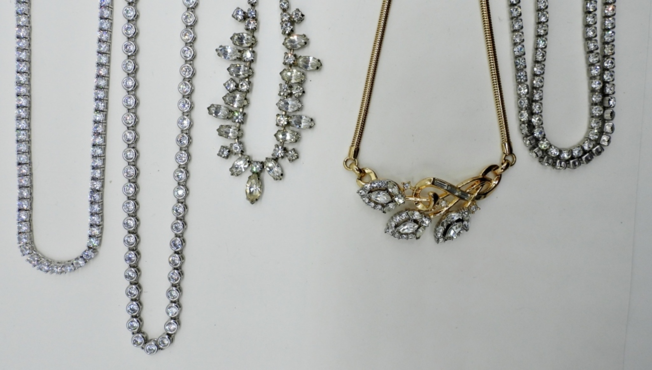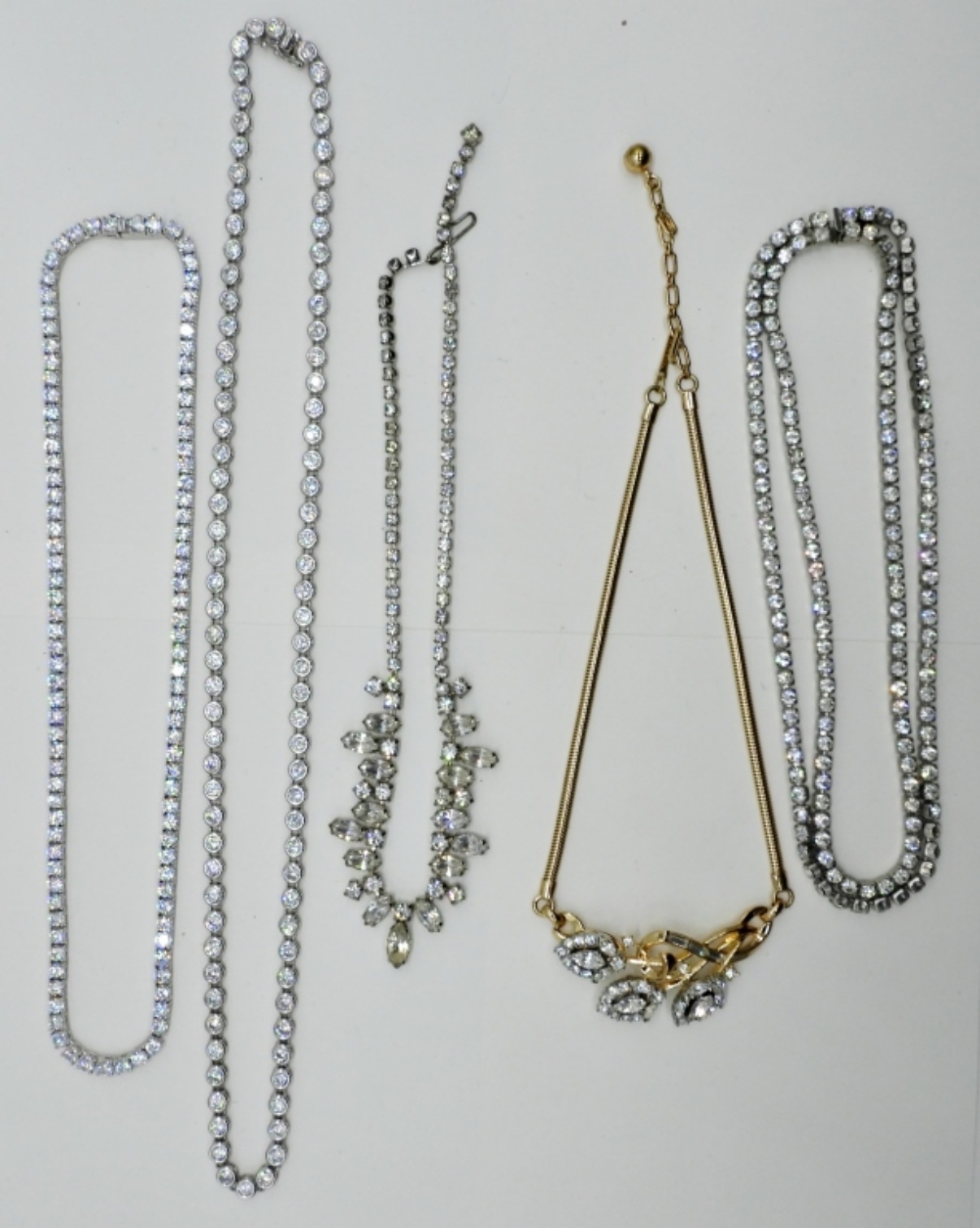 FIVE GORGEOUS RHINESTONE NECKLACES, 14-24″.