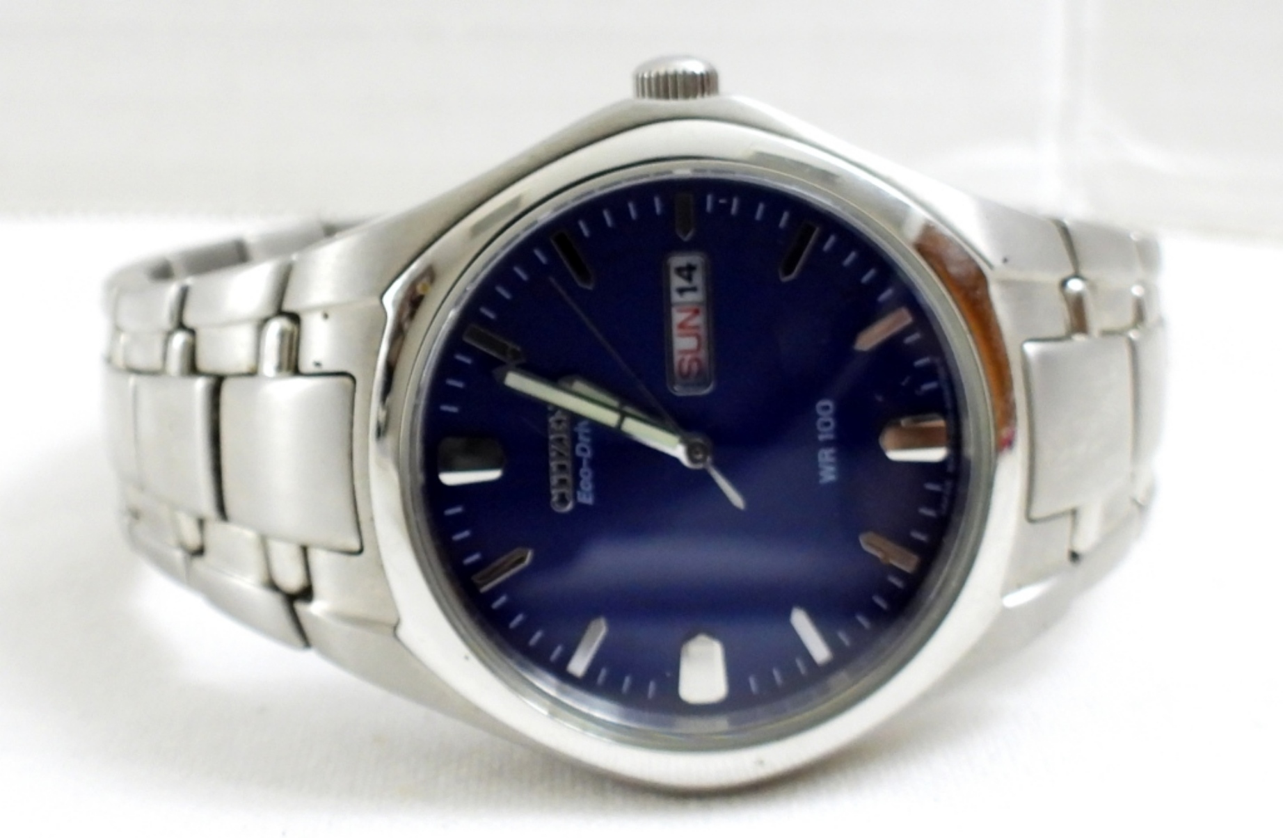 Citizen Eco Drive- Blue with Dials Silver Tone with day. Is running but may or may not keep time. “NOT TESTED AS TO WORKING OR NOT”