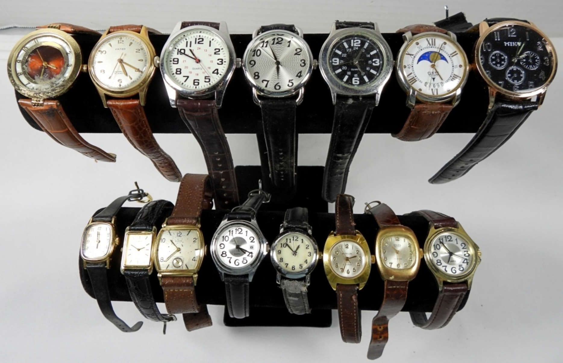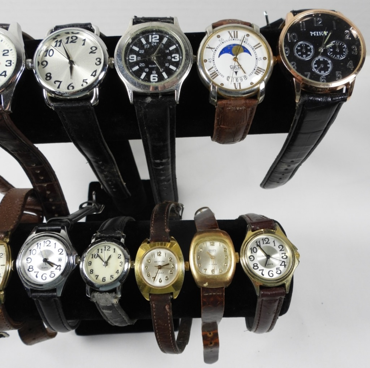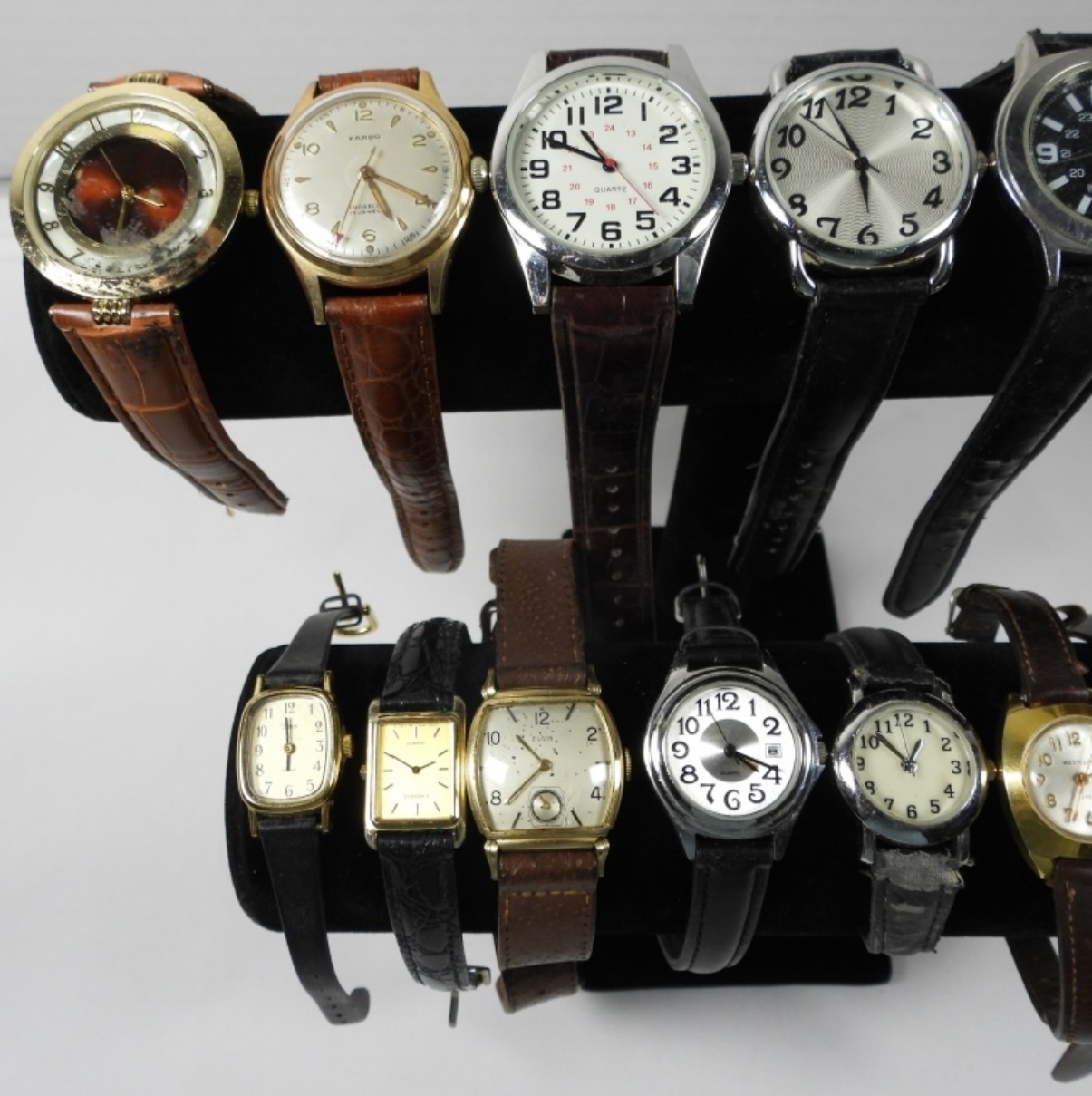 15 ASSORTED LADIES FASHION BAND WATCHES IN BROWN/BLACK SHADES, ALL UNTESTED. SOME BRANDS INCLUDE: GRUEN, FARGO, WESTCLOX, LASSALE & MORE!