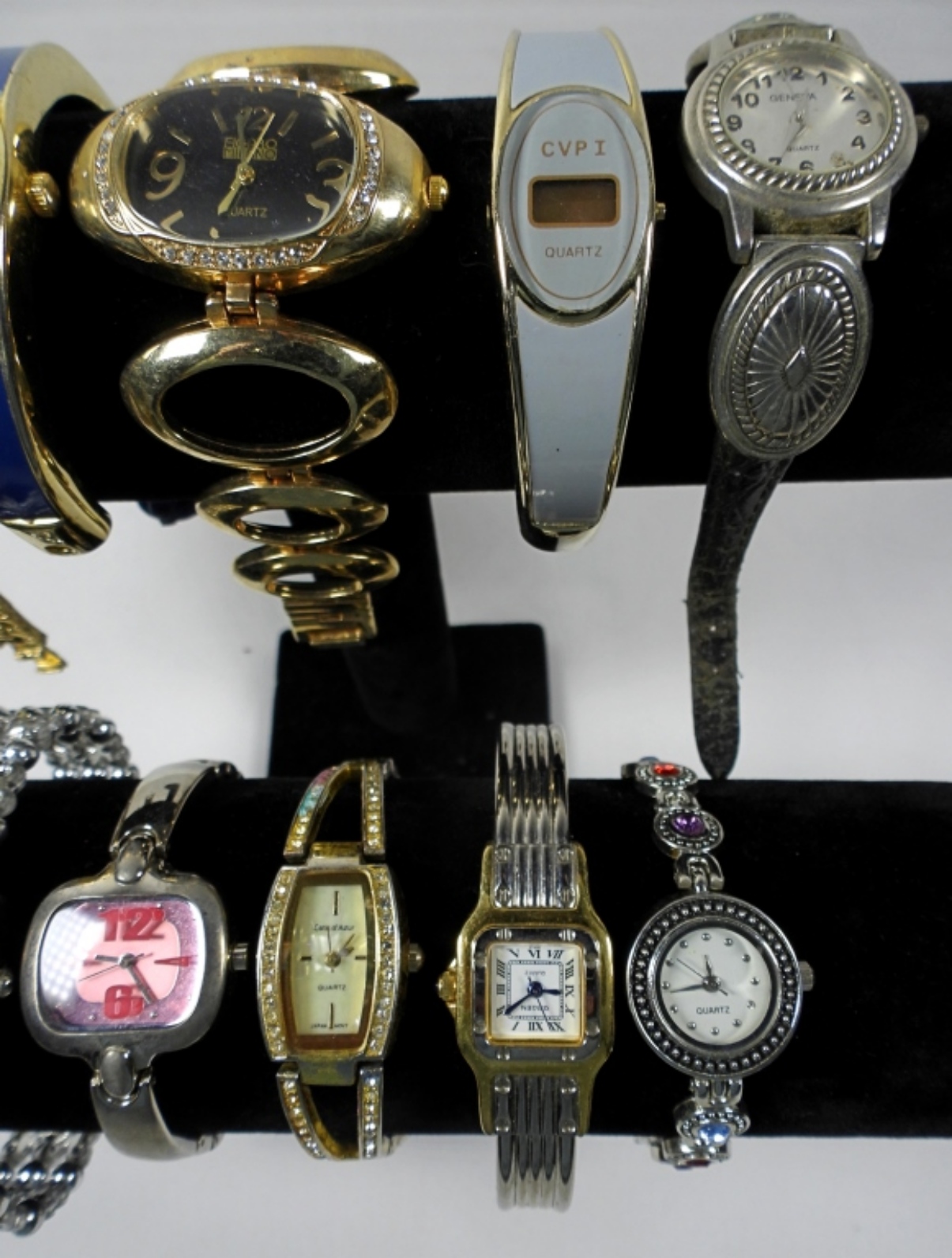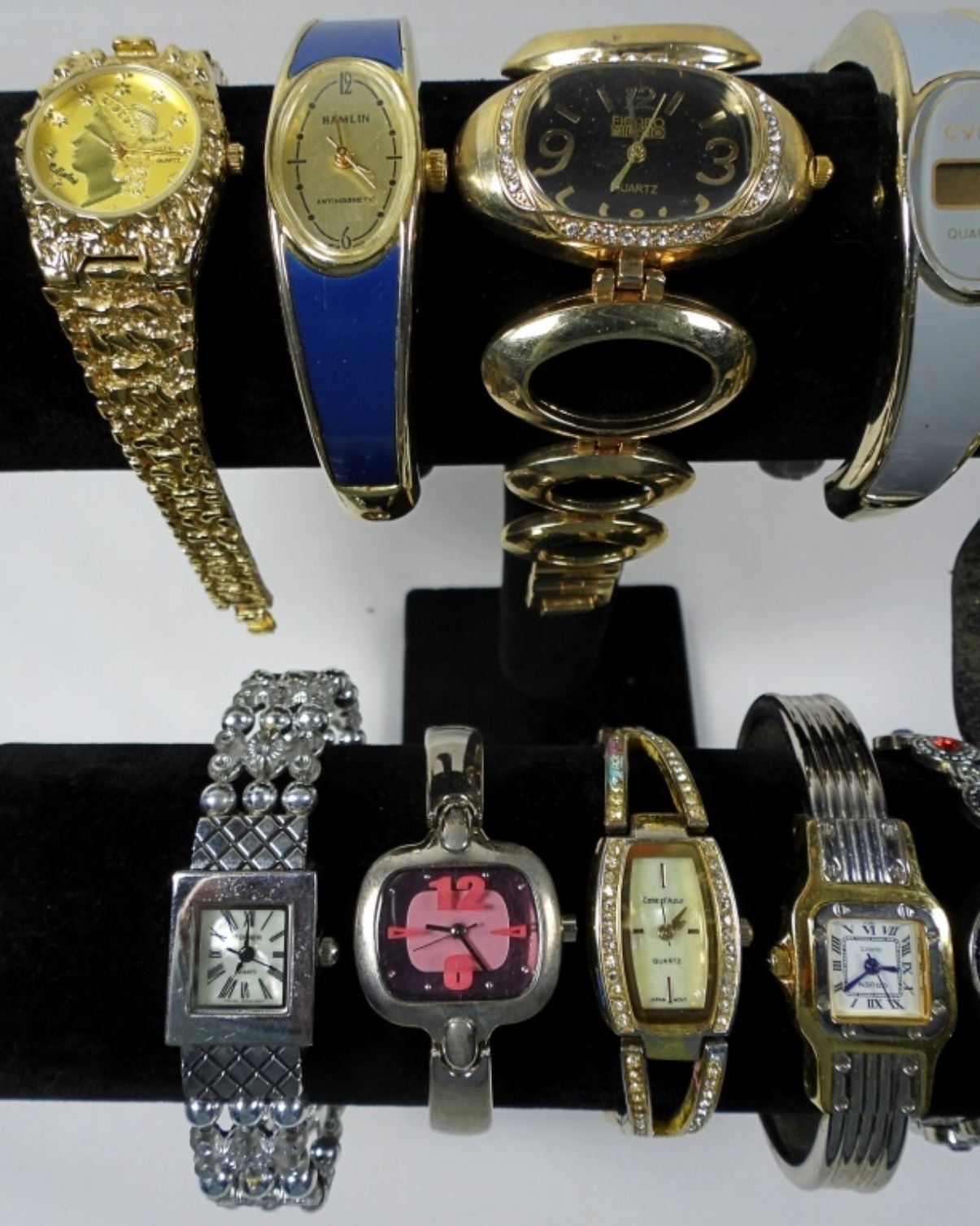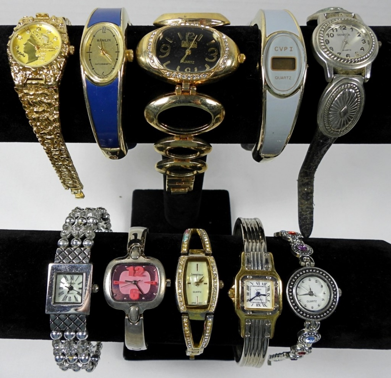 10 ASSORTED LADIES FASHION WATCHES IN VARIOUS COLORS. UNTESTED FOR WORKING ORDER/BRANDS UNVERFIED. SOME BRANDS IN LOT INCLUDE: GRUEN, HAMLIN, GENEVA, AND MORE!