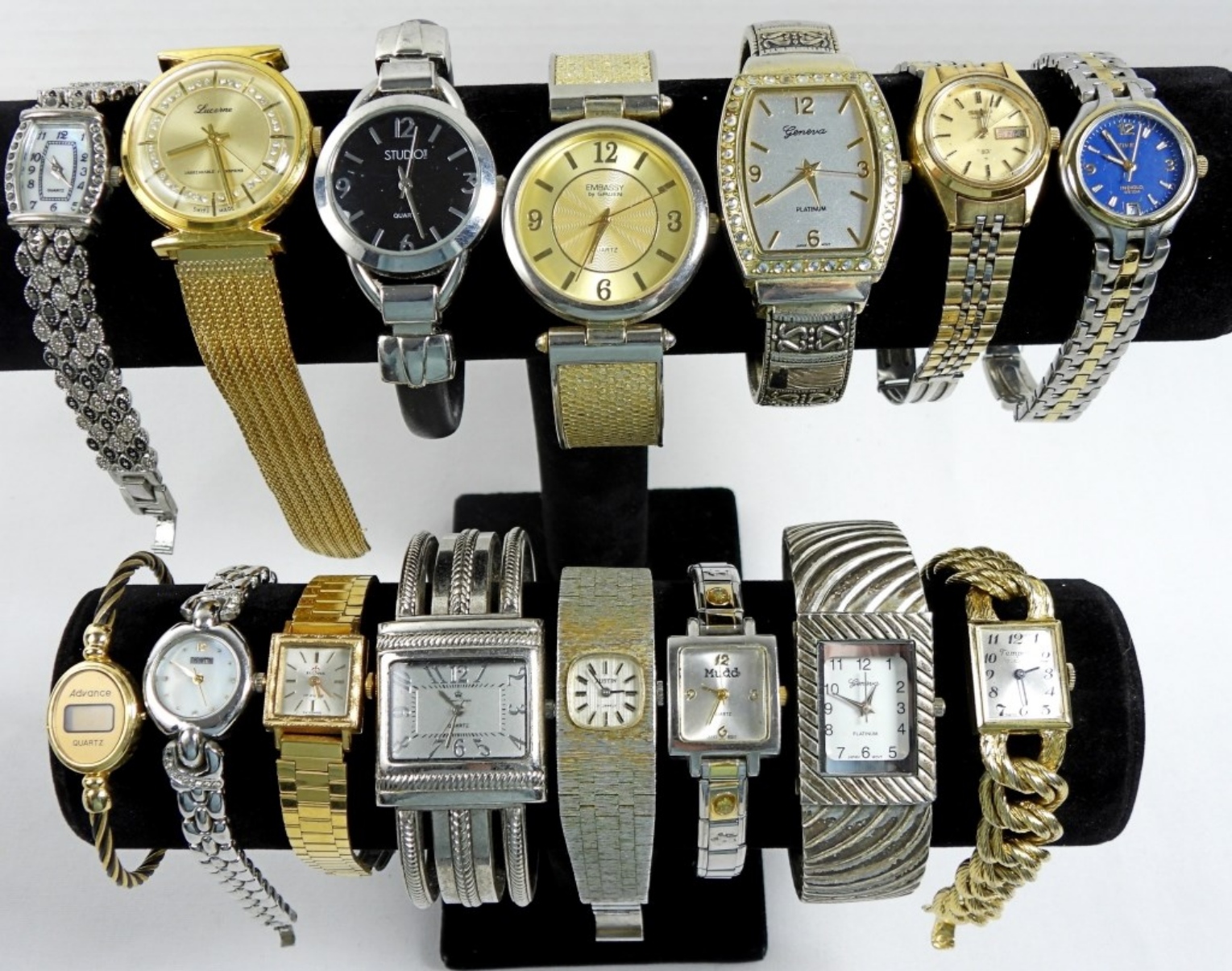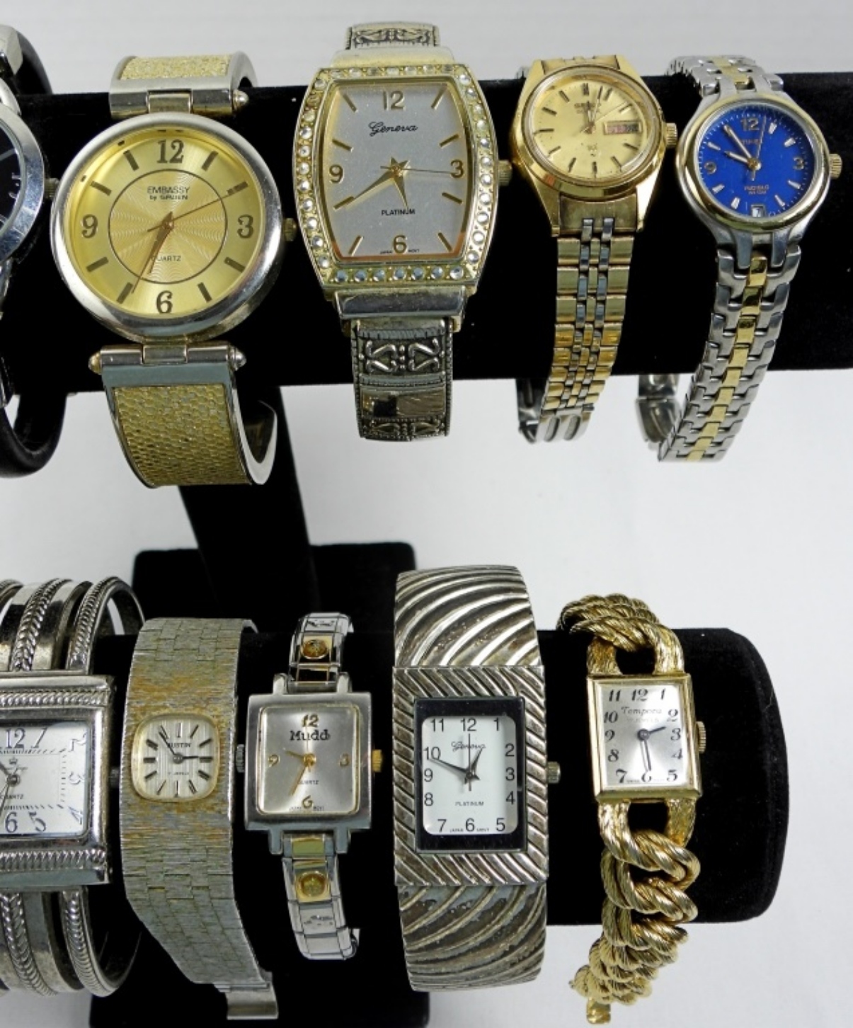 15 ASSORTED LADIES GOLD AND SILVER TONE FASHION WATCHES. ALL WATCHES UNTESTED IF WORKING/BRANDS UNVERIFIED. SOME BRANDS IN LOT INCLUDE: MUDD, GRUEN, GENEVA, AND MORE!