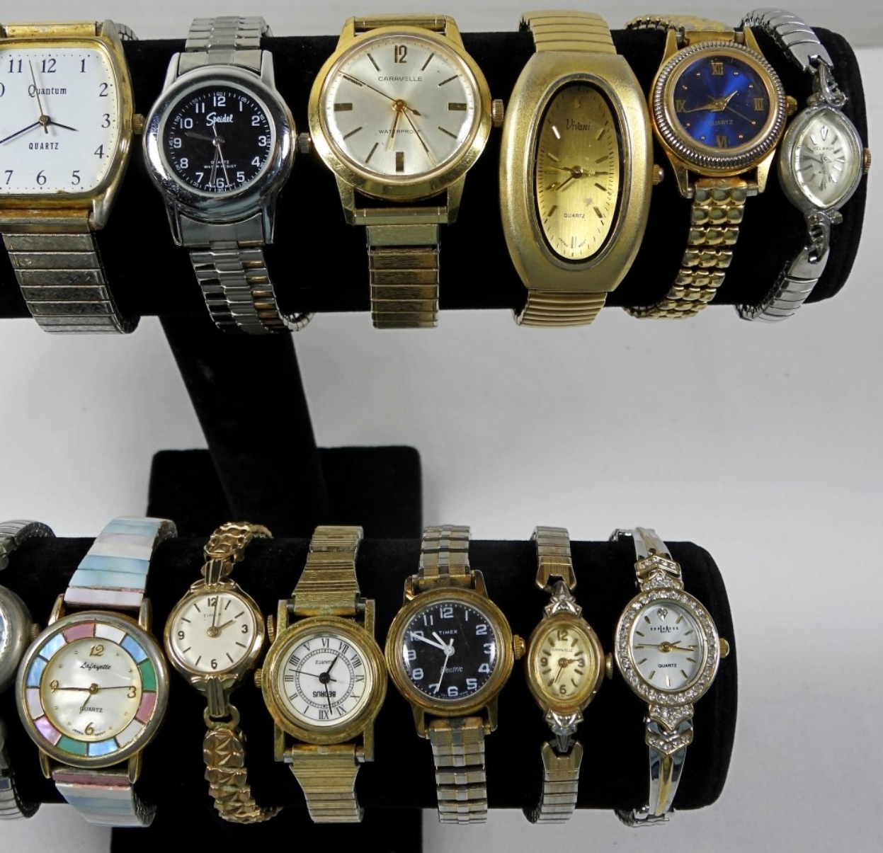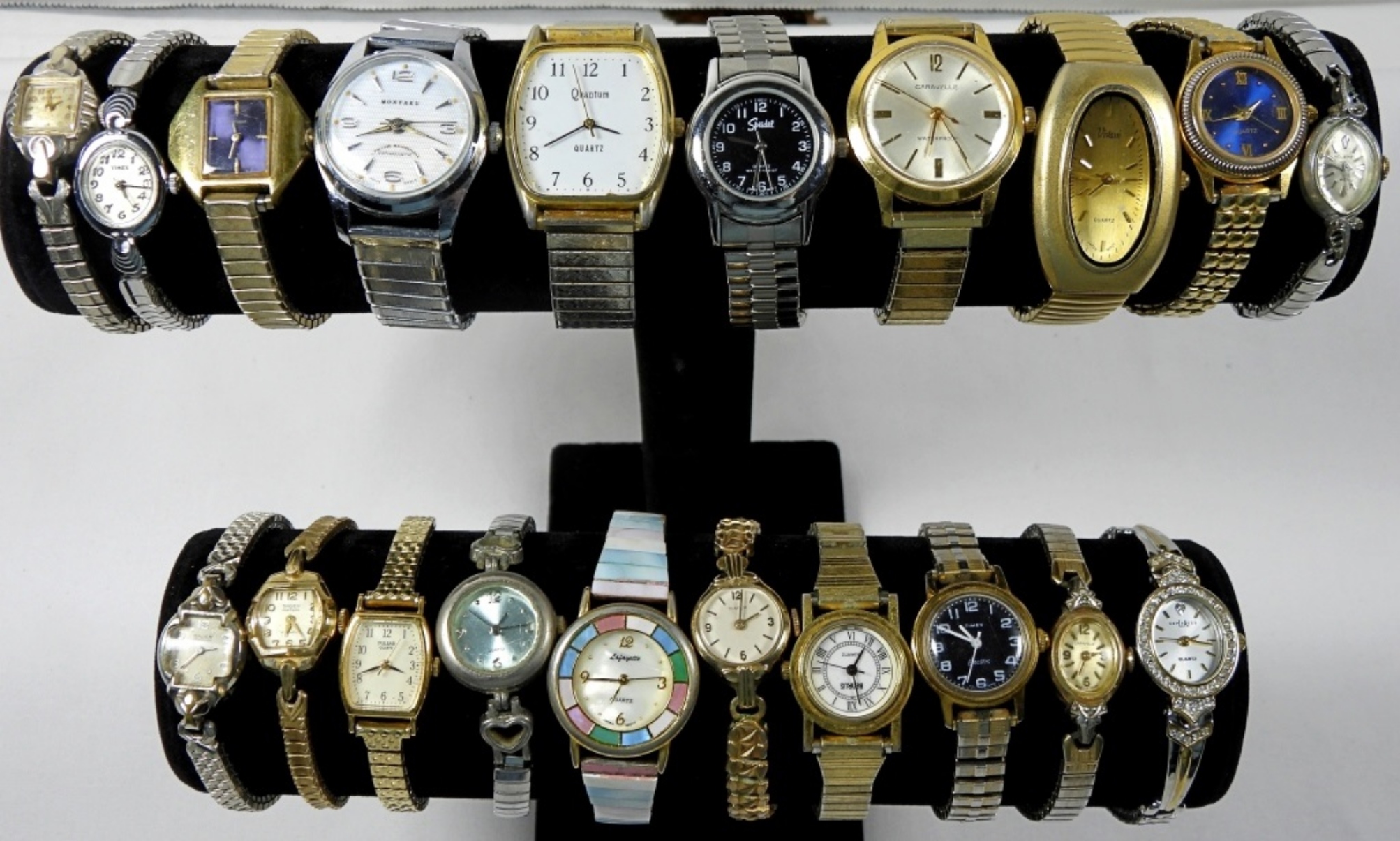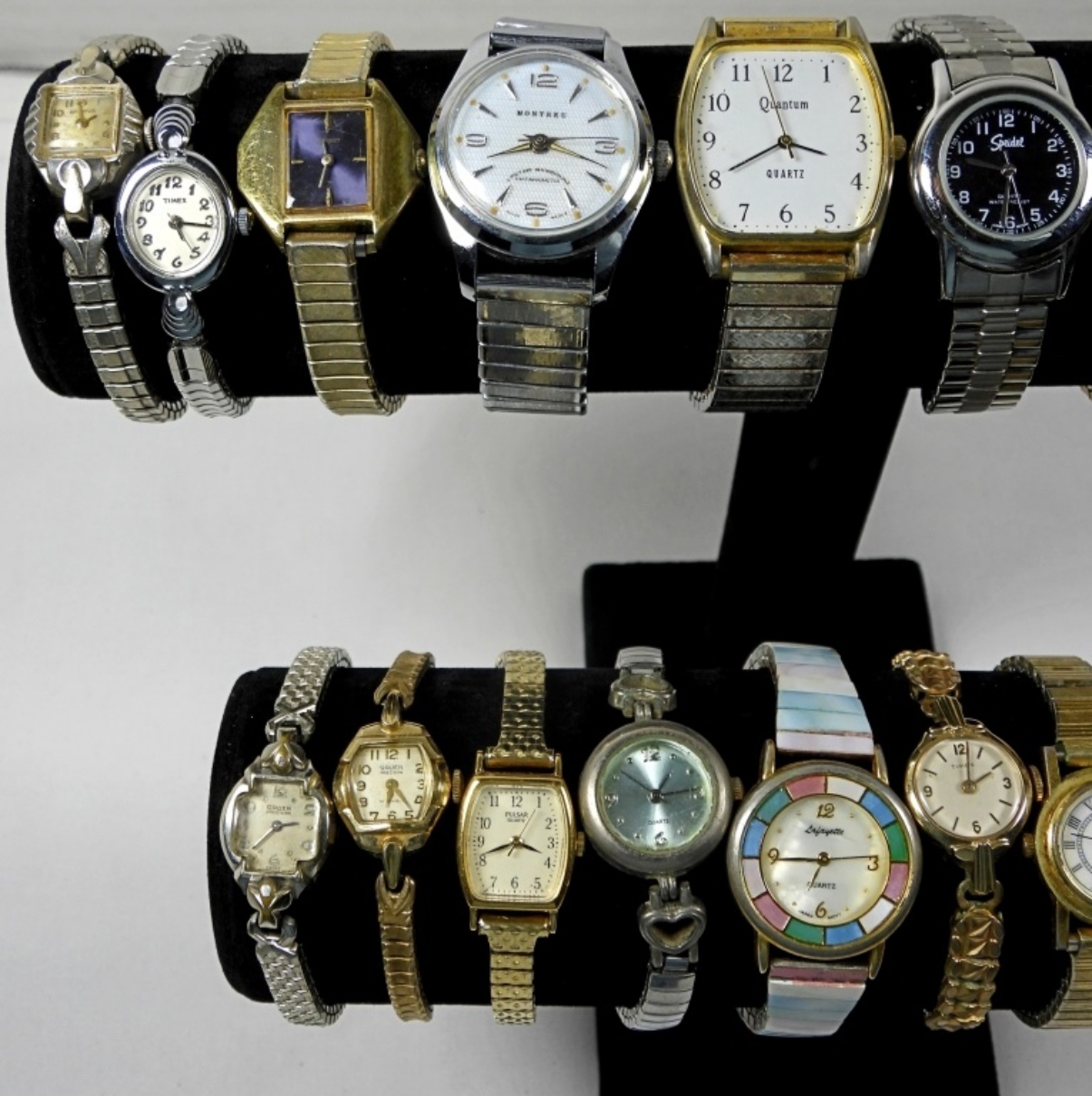 20 ASSORTED LADIES FASHION WATCHES (GOLD TONE, SILVER TONE, AND VARIETY OF COLORS) ALL WATCHES ARE UNTESTED/ BRANDS UNVERIFIED. SOME BRANDS IN LOT INCLUDE: TIMEX, GRUEN, AVON, PULSAR AND MORE!