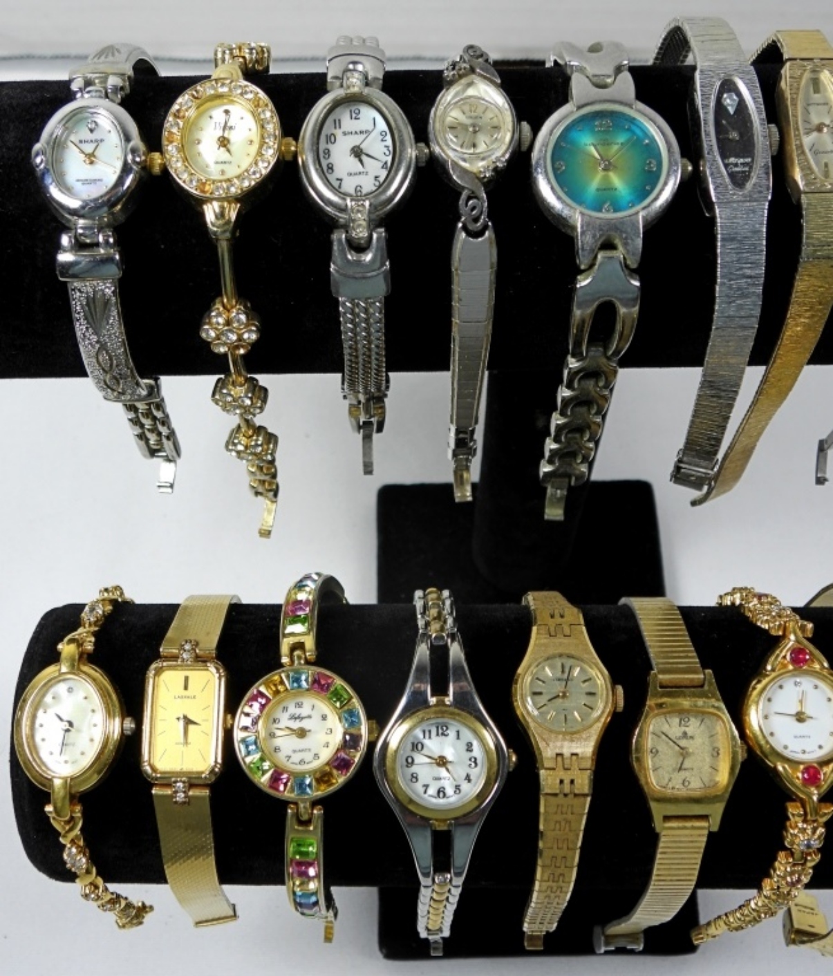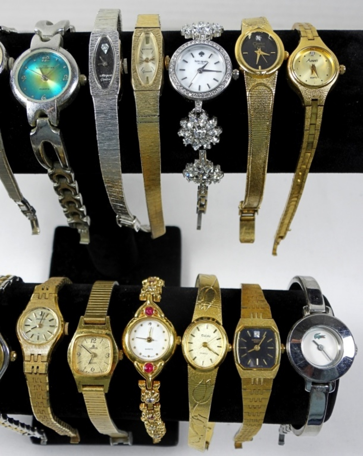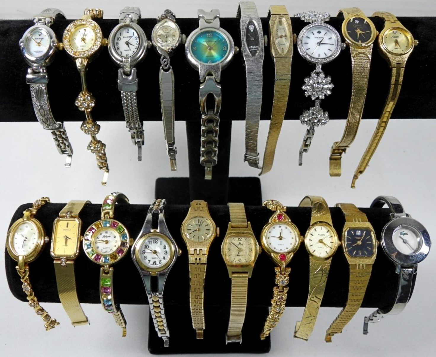 20 ASSORTED, DAINTY/THINNER LADIES FASHION WATCHES (GOLD AND SILVER TONES). ALL WATCHES ARE UNTESTED IF IN WORKING ORDER/BRANDS UNVERIFIED. SOME BRANDS IN LOT INCLUDE: BULOVA, SHARP, ELGIN, LACOSTE, AND MORE!
