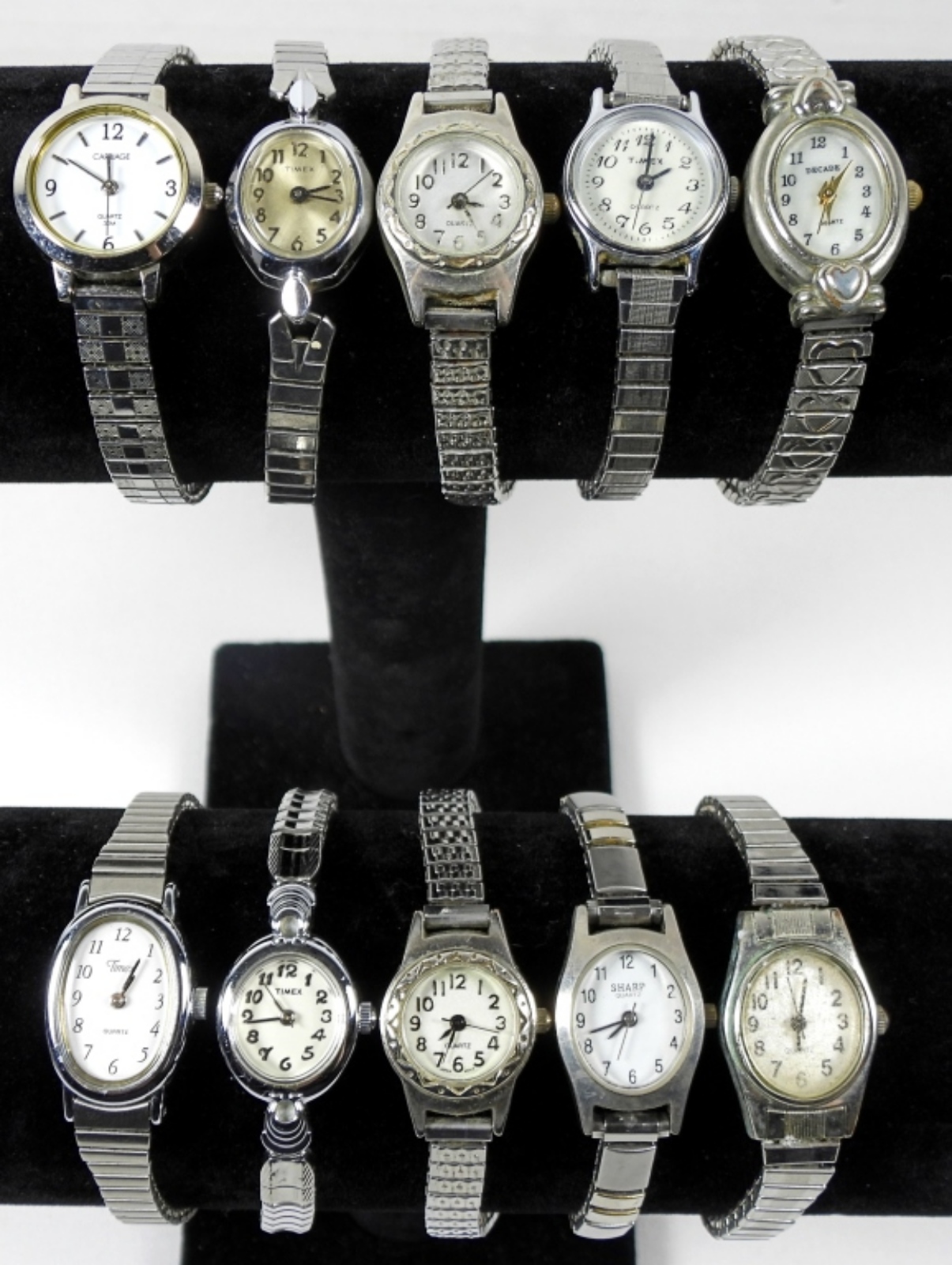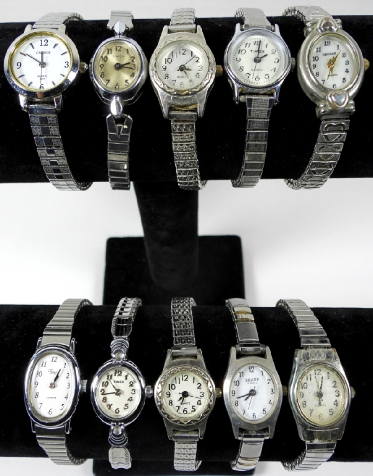 10 ASSORTED LADIES STRETCH WATCHES. ALL WATCHES ARE UNTESTED/BRANDS UNVERIFIED. SILVER TONE, SOME BRANDS INCLUDE: SHARP, TIMEX, DECADE, AND MORE!