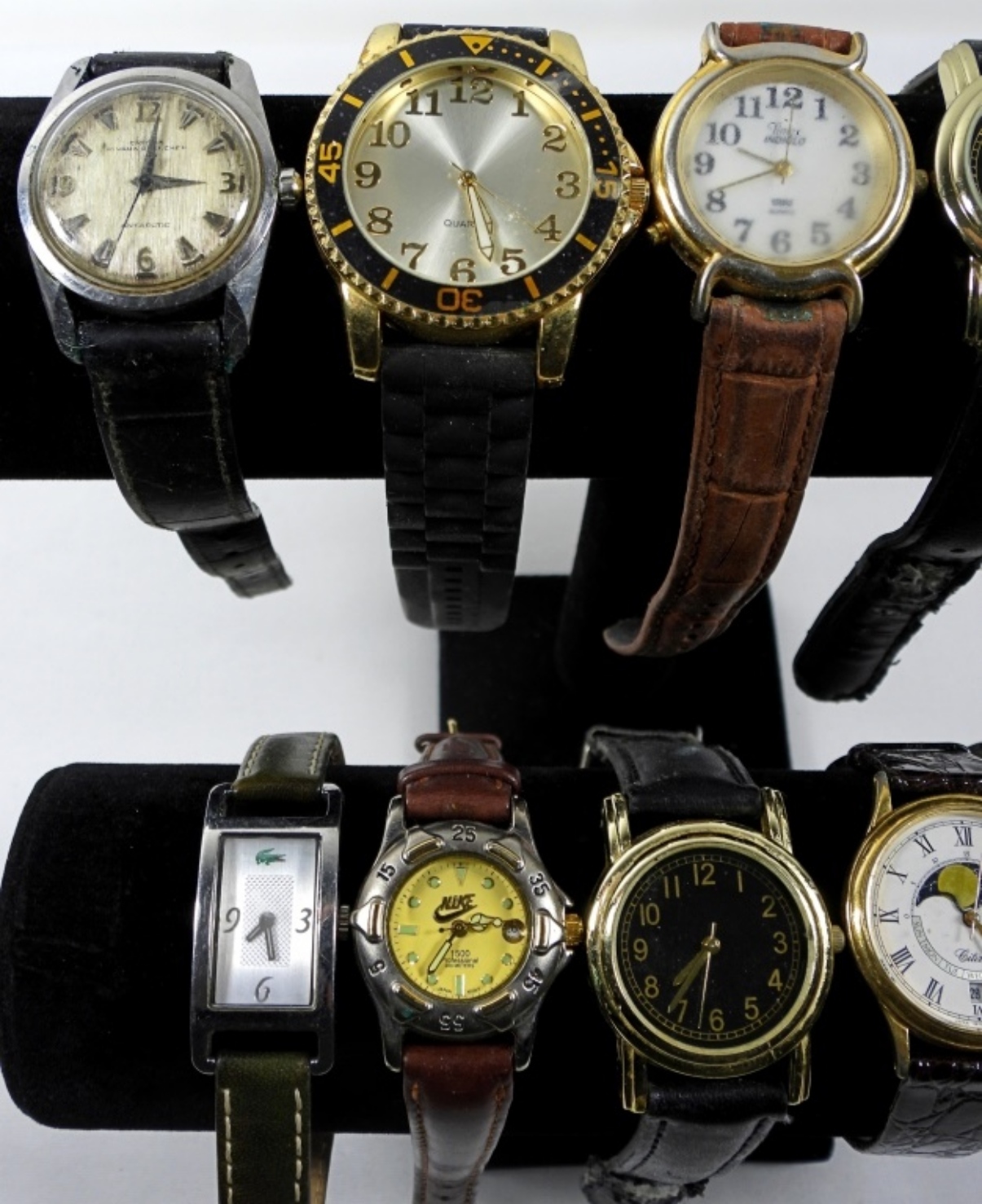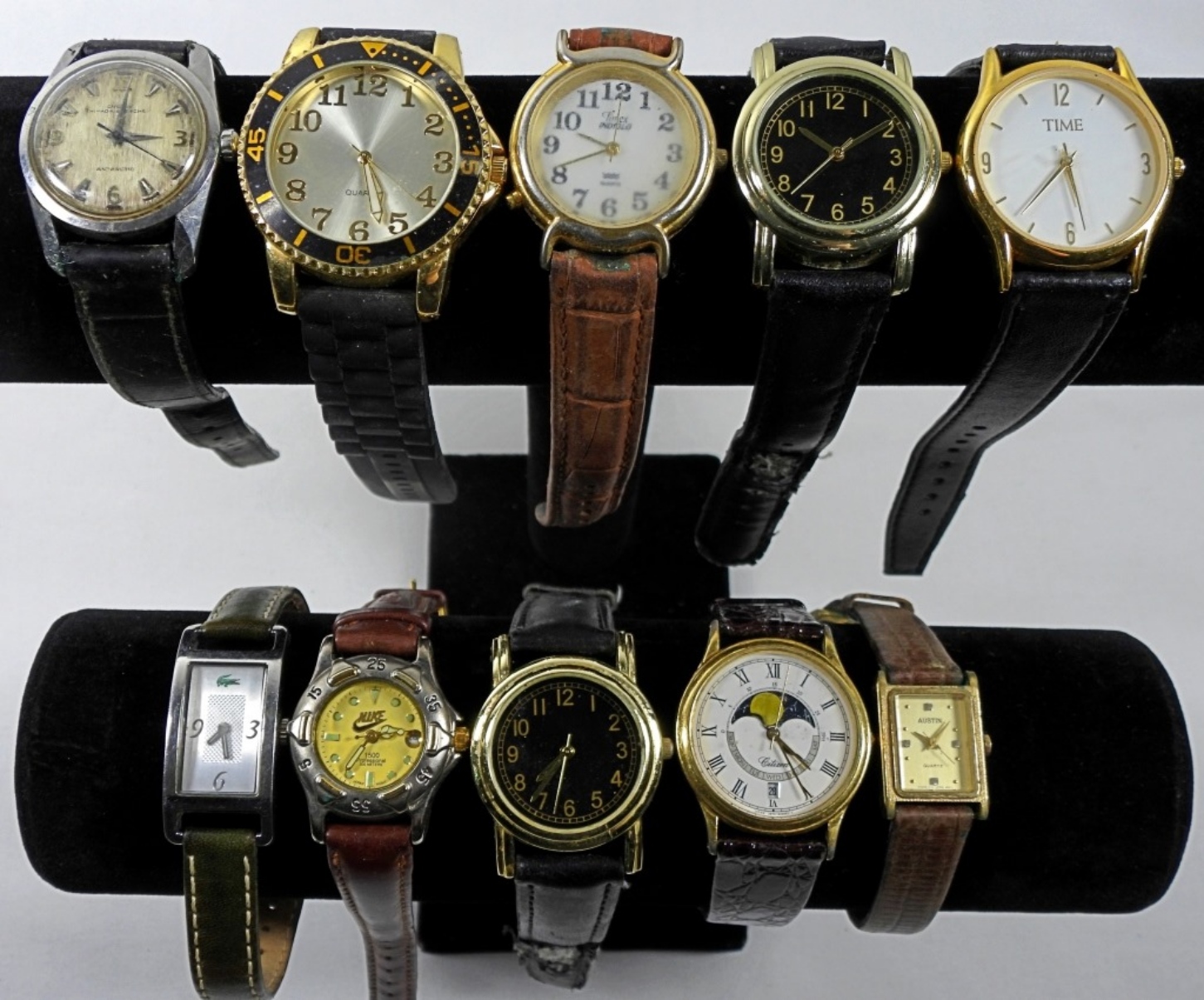 10 ASSORTED LADIES BAND WATCHES (DIFFERENT STYLES AND MOSTLY BROWN/BLACK BANDS). ALL WATCHES ARE UNTESTED/BRANDS UNVERIFIED. SOME BRANDS IN LOT INCLUDE: NIKE, TIME, LACOSTE, AND MORE!