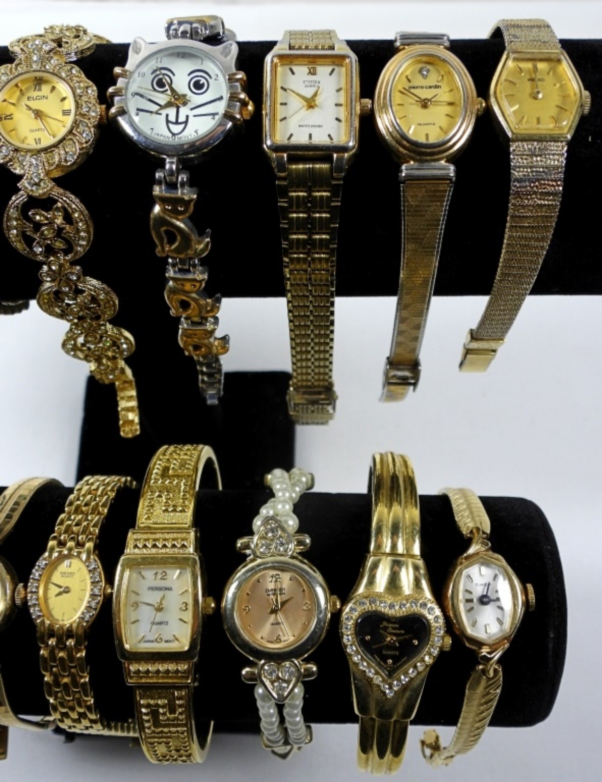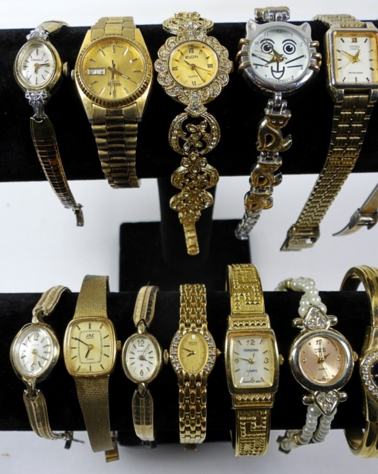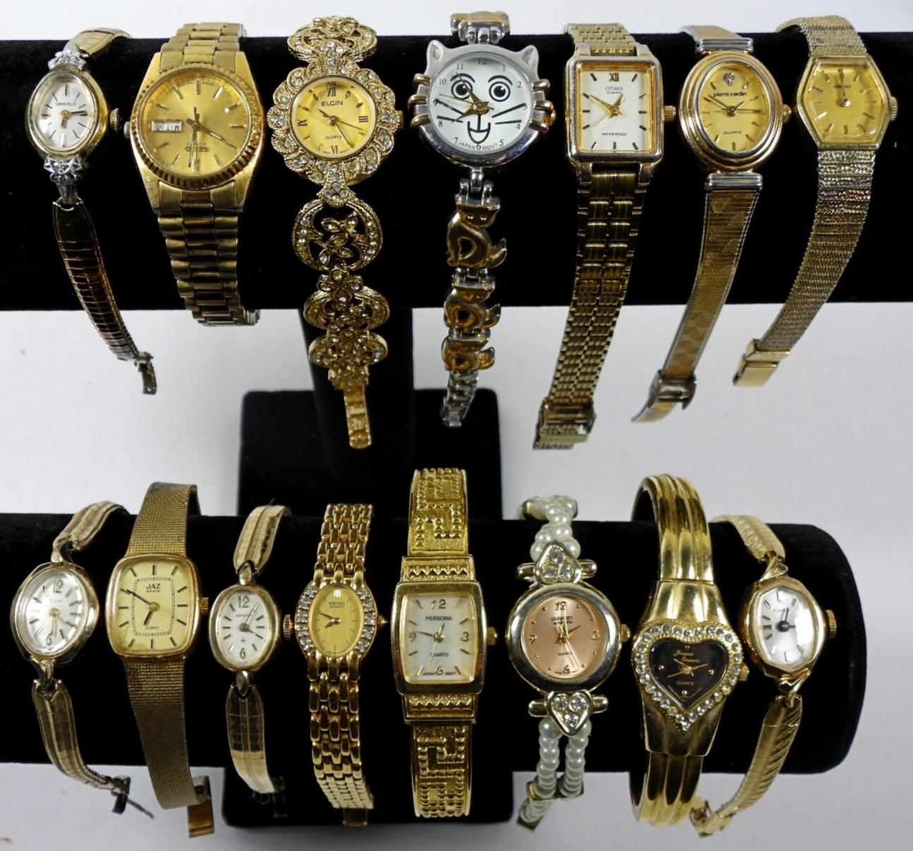 15 ASSORTED PRETTY LADIES FASHION WATCHES IN BOTH GOLD TONES. ALL WATCHES ARE UNTESTED/BRANDS UNVERIFIED. SOME BRANDS IN LOT INCLUDE: GRUEN, CITIZEN, SEIKO, AND MORE!