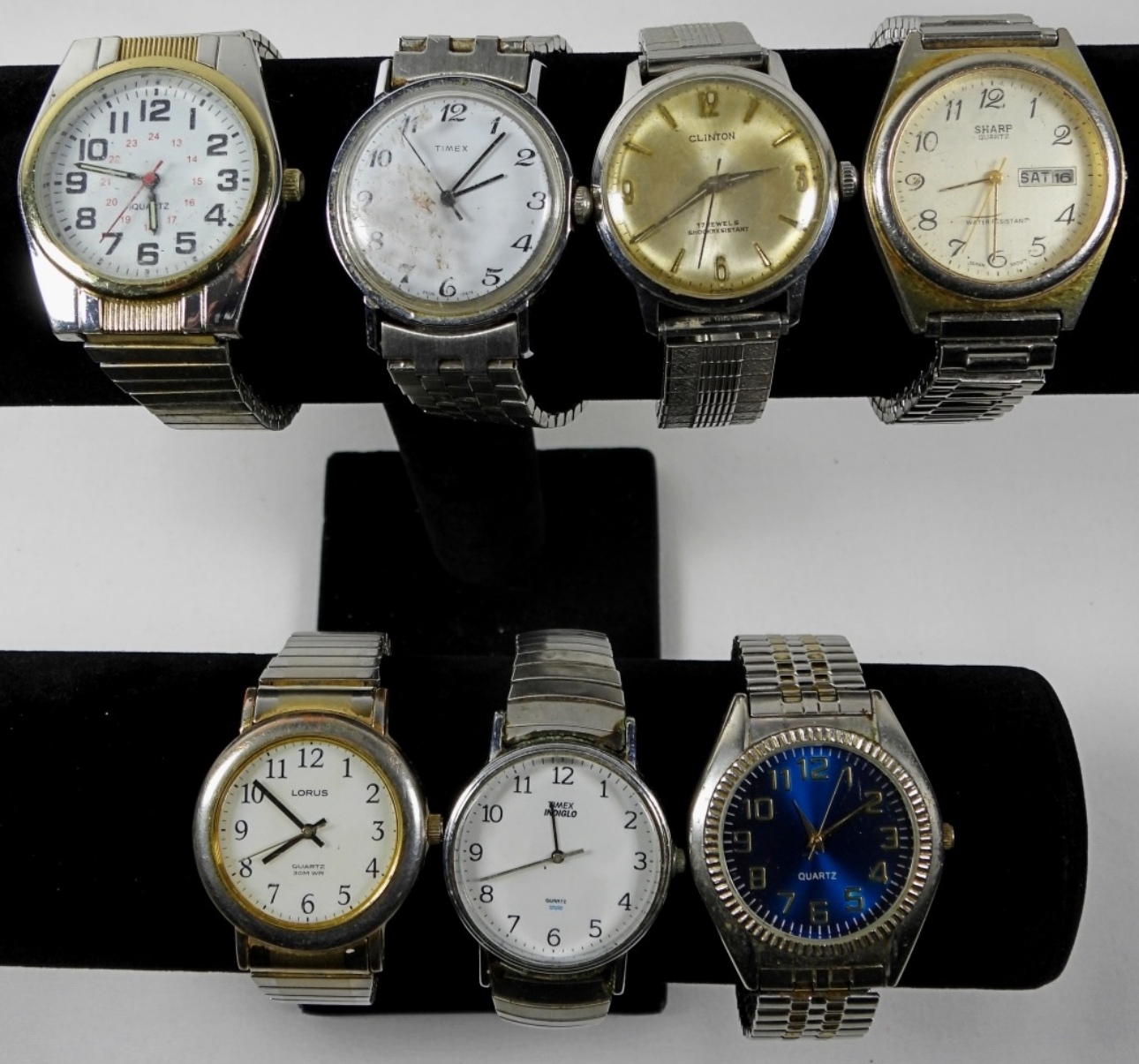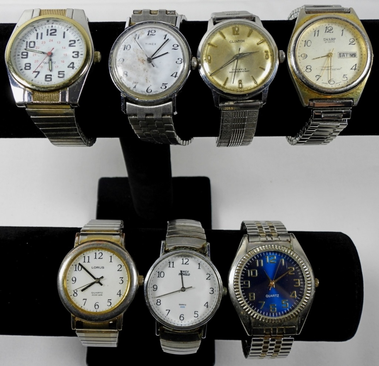 6 ASSORTED SILVER TONE MENS STRETCH WATCH LOT. ALL WATCHES ARE UNTESTED/BRANDS UNVERIFIED. SOME BRANDS IN LOT INCLUDE: LORUS, SHARP, TIMEX AND MORE!