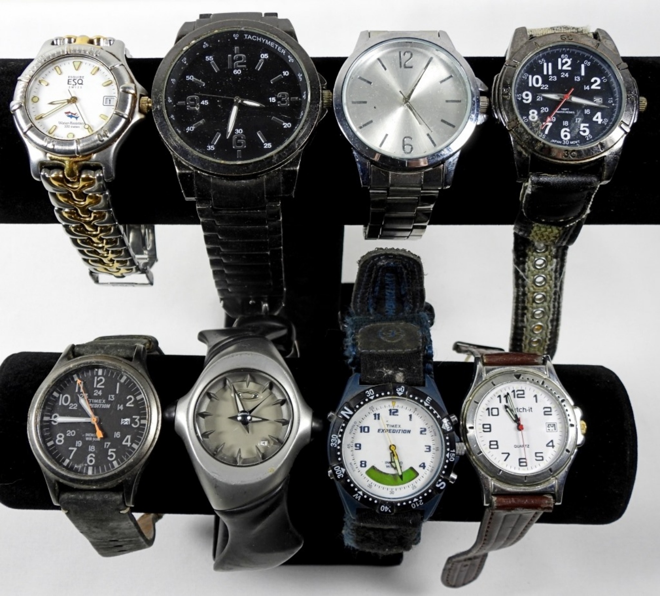 8 UNIQUE MENS WATCHES, VARIETY OF STYLES/DESIGNS. NOT TESTED AS TO WORKING OR NOT, MAY NEED REPAIR TO WORK. BRANDS UNVERIFIED.