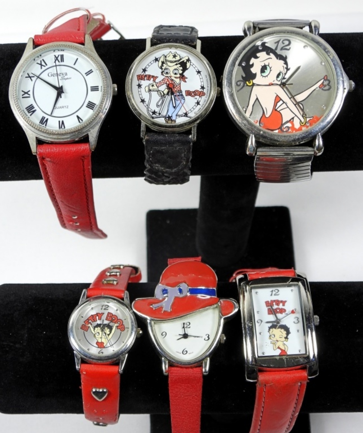4 BETTY BOOP LADIES FASHION WATCHES, 3 RED ASSORTED LADIES FASHION WATCHES (1 VINTAGE SHEFFIELD IN ORIGINAL PACKAGING). WATCHES ARE UNTESTED: MAY NEED REPAIR OR PARTS TO WORK. BRANDS UNVERIFIED.