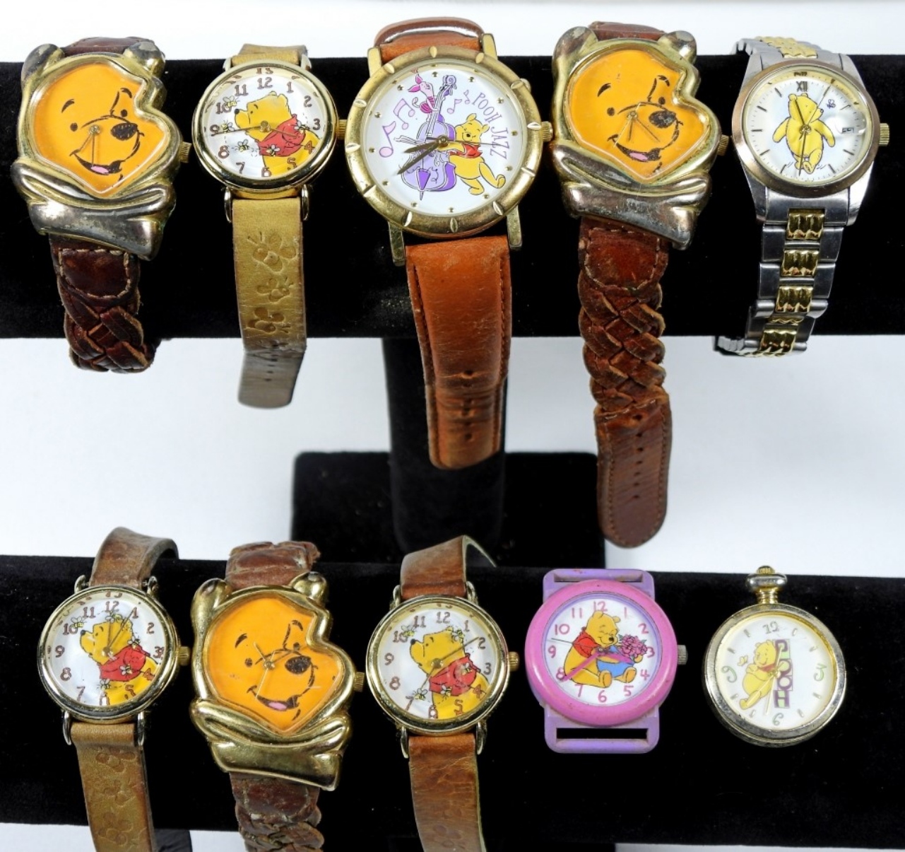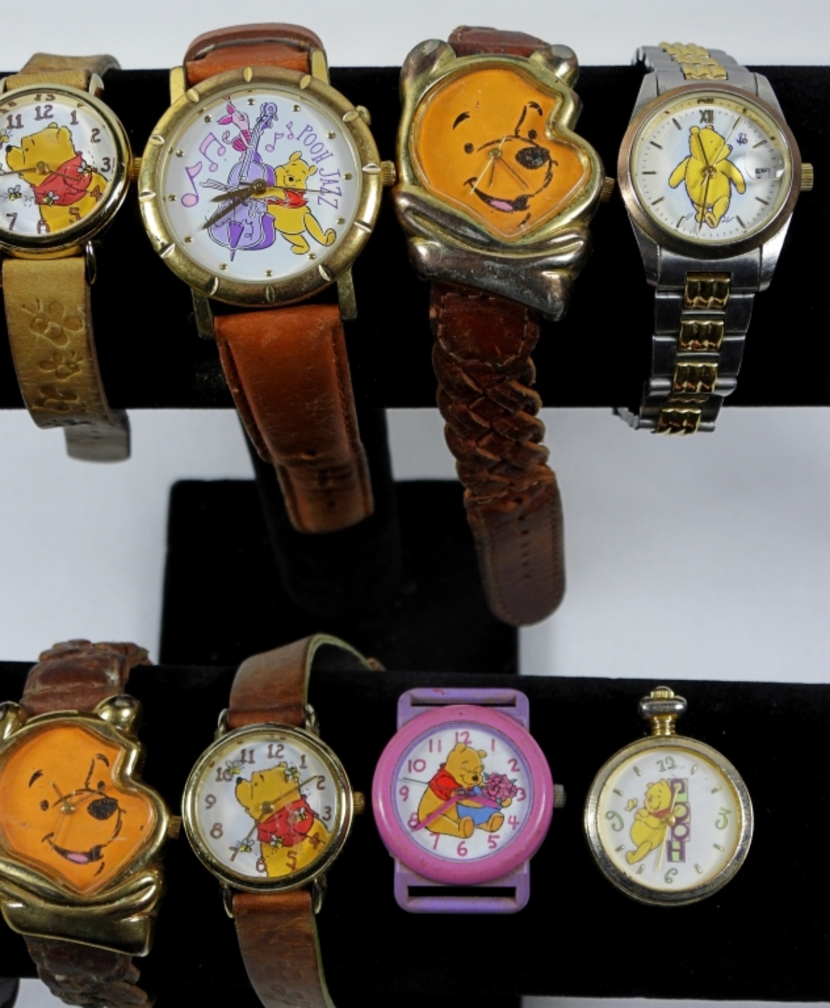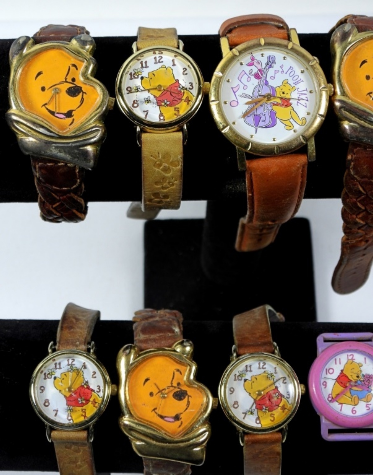 8 TIMEX WINNIE THE POOH WATCH (ONE MISSING WRISTBAND) AND 2 DISNEY WINNIE THE POOH WATCHES. WATCHES ARE UNTESTED AND MAY NEED PARTS OR REPAIR TO WORK.