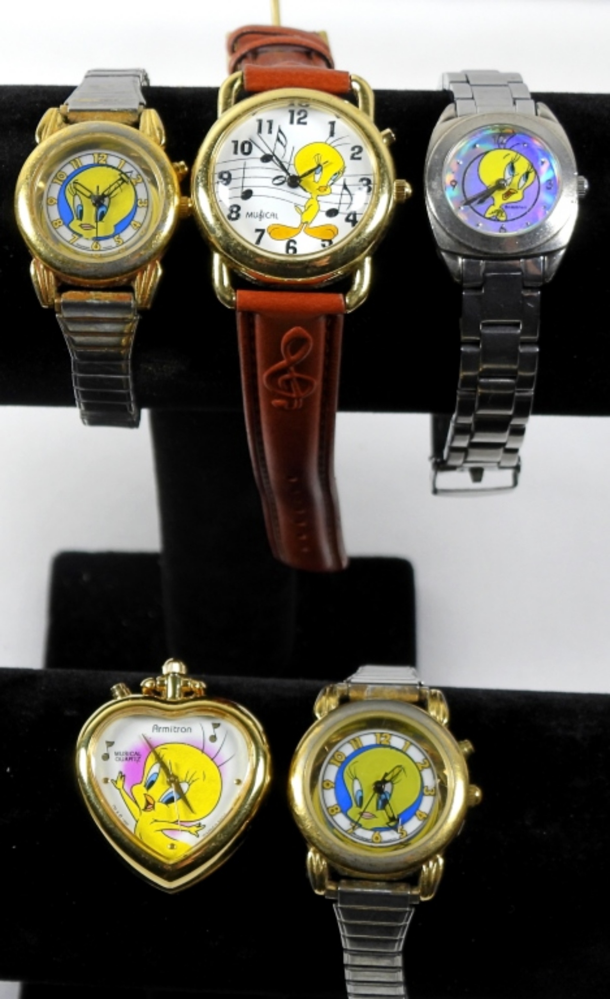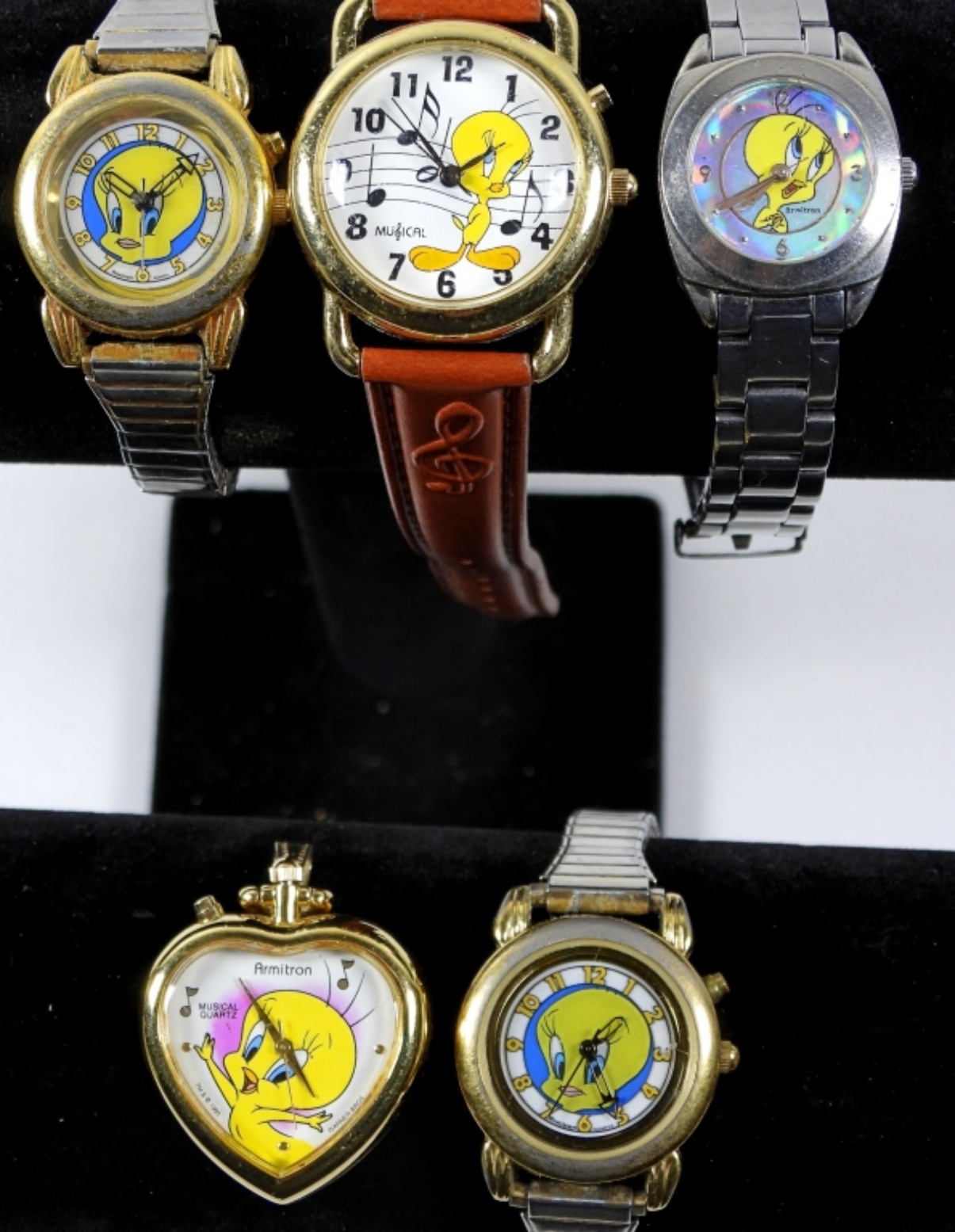 5 VINTAGE TWEETY BIRD LADIES WATCH LOT: 1995/1996/2000, 4 WATCHES AND 1 WATCH PENDANT. WATCHES ARE UNTESTED, MAY NEED PARTS OR REPAIR TO WORK.