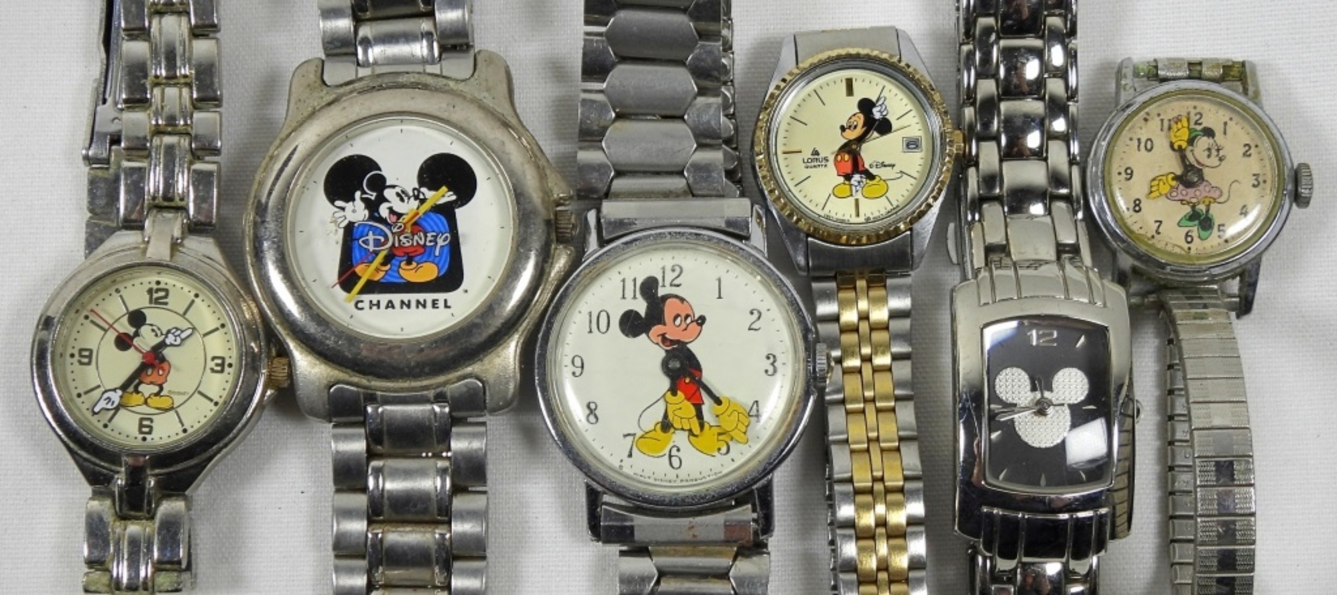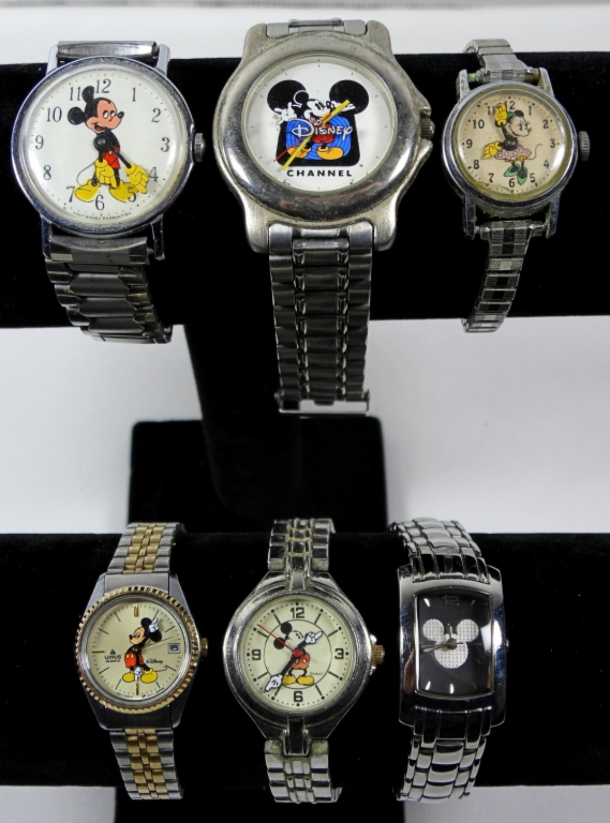 6 ASSORTED SILVER TONE MICKEY AND MINNIE MOUSE WATCHES, WATCHES UNTESTED MAY NEED REPAIR OR PARTS TO WORK