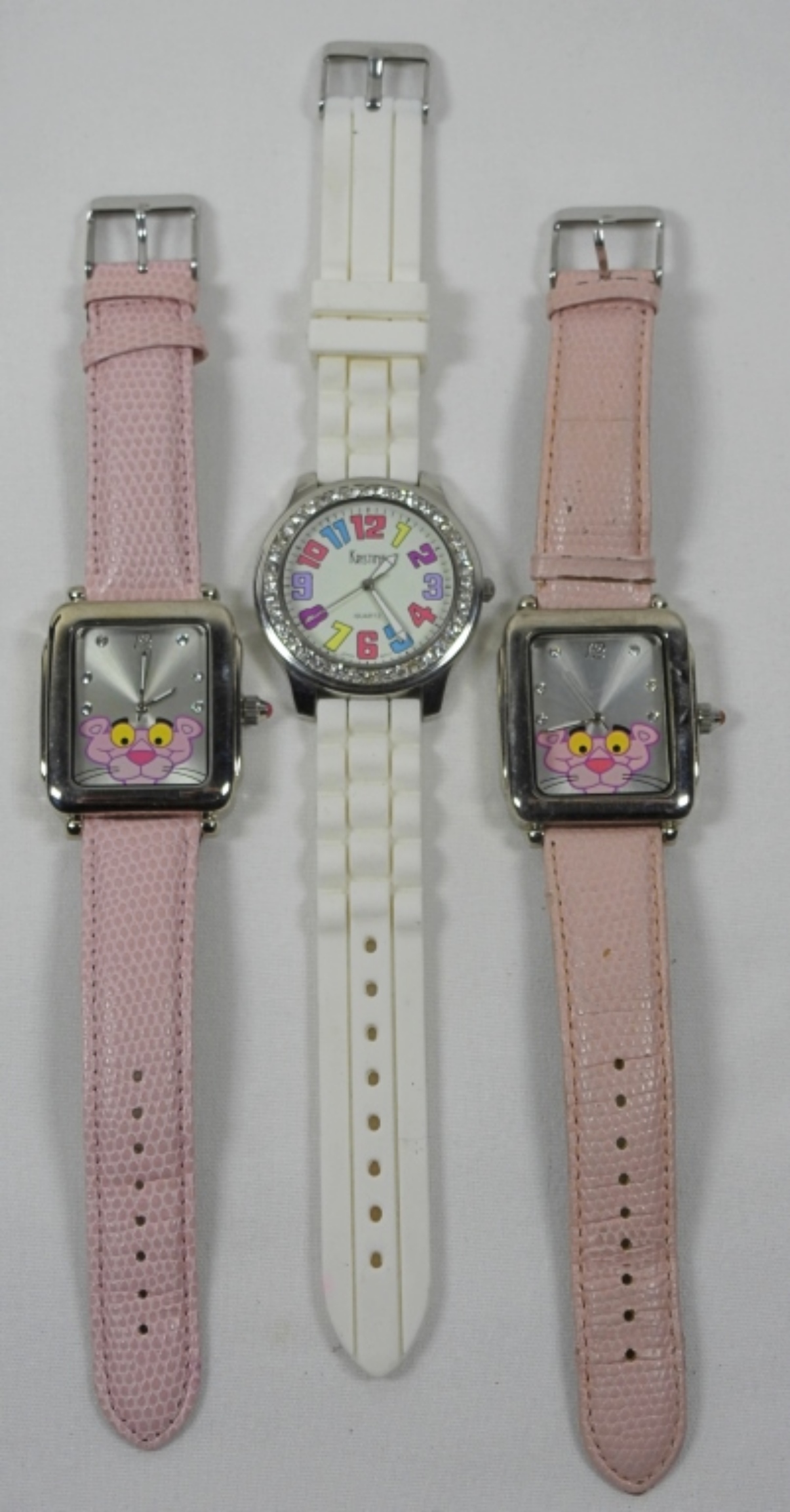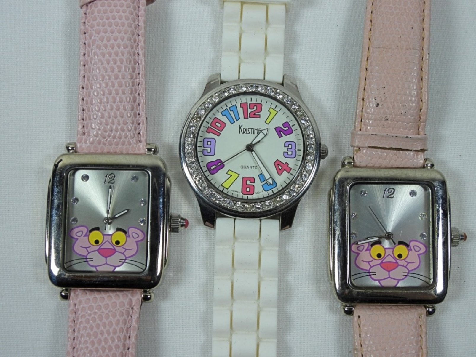 2 PINK WRISTBANDS PINK PANTHER WATCHES, VARIED CONDITIONS. AND 1 WHITE WRISTBAND LADIES FASHION WATCH. WATCHES ARE UNTESTED/MAY NEED PARTS OR REPAIR TO WORK