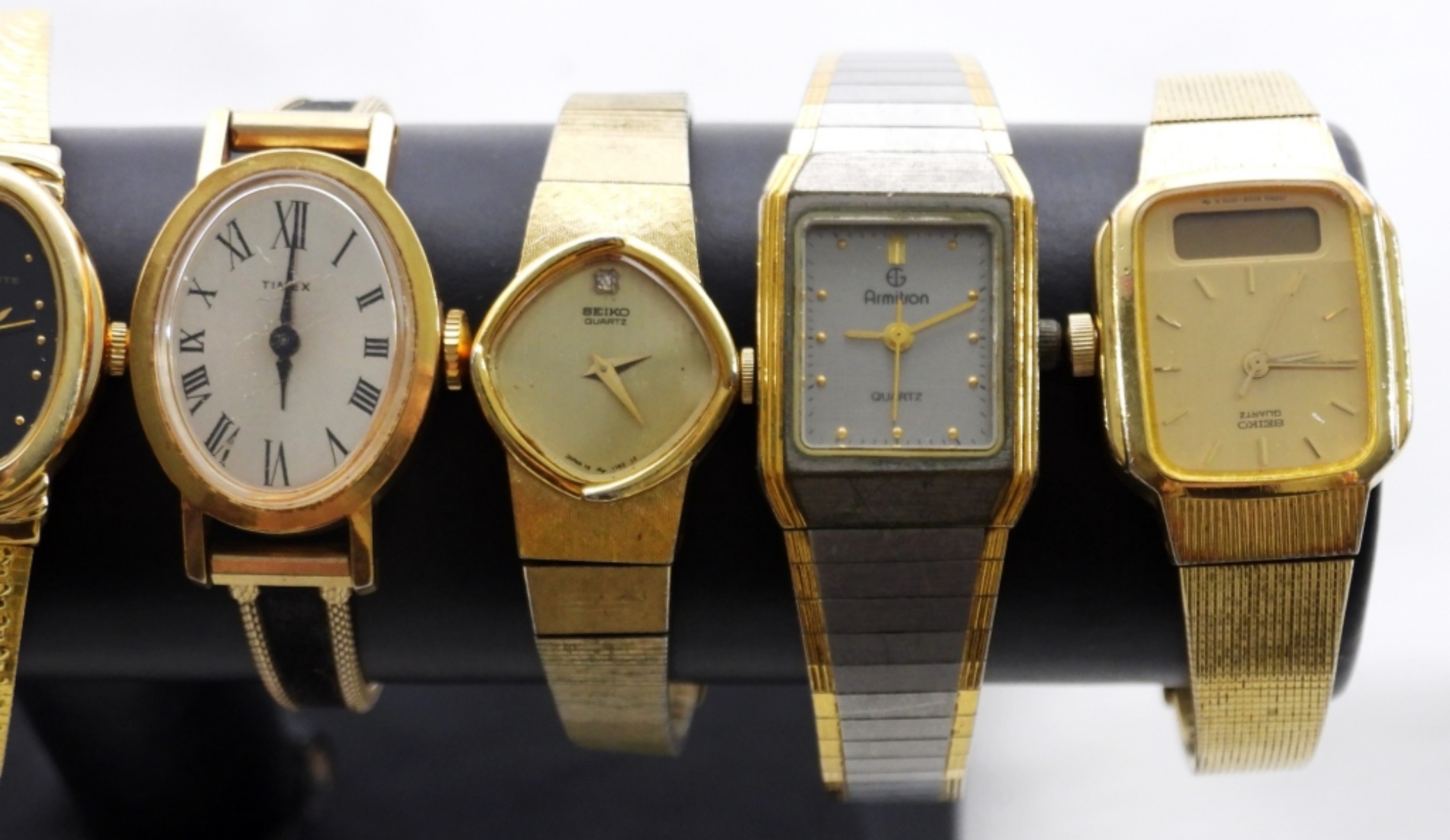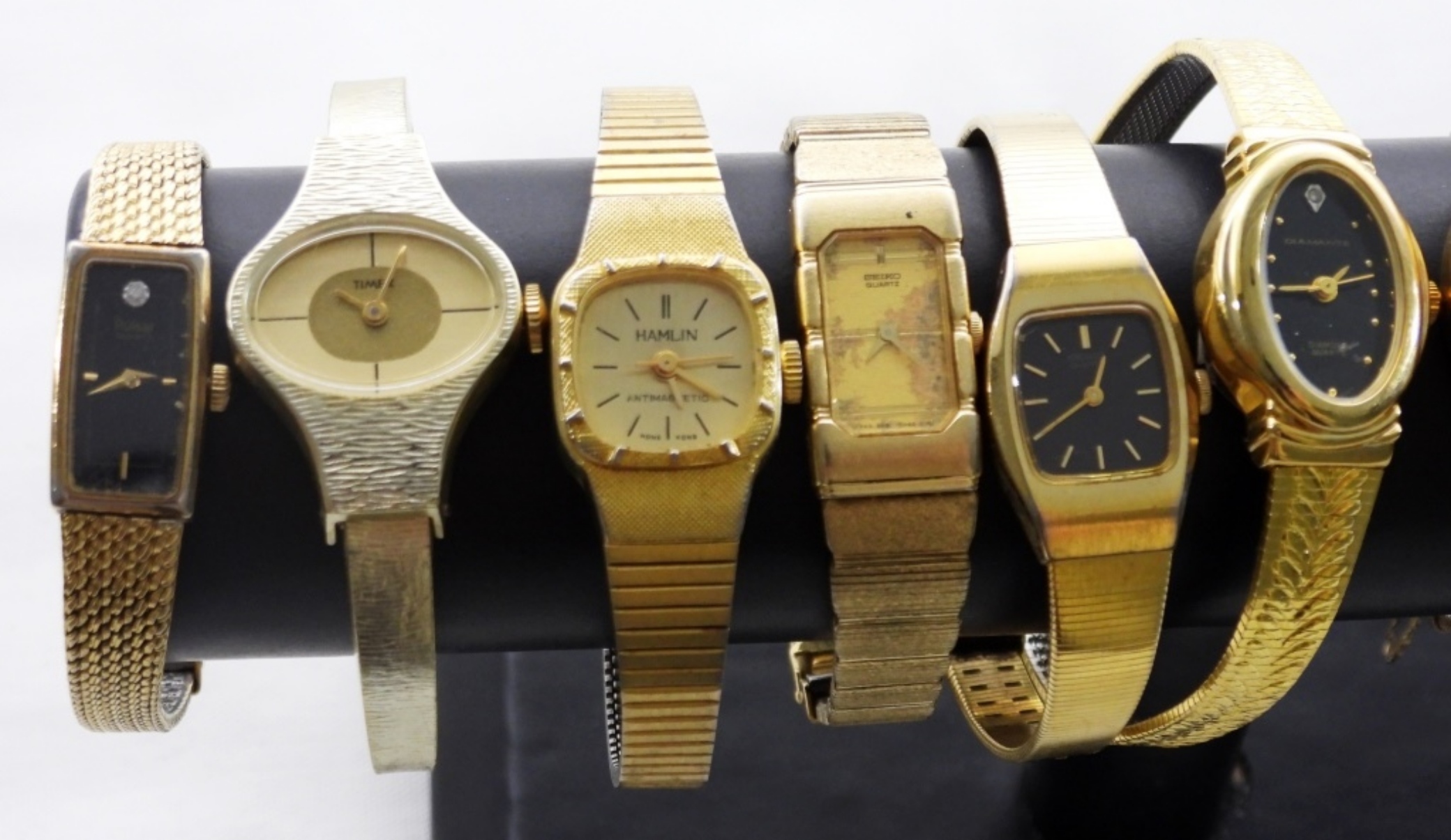 10 WOMEN’S PETITE GOLD TONE WATCHES- ARMITRON, HAMLIN, TIMEX, SEIKO ARE SOME OF THE BRANDS (UNSEARCHED & UNVERIFIED). NOT TESTED AS TO WORKING OR NOT. THESE WATCHES DO SHOW WEAR. PREOWNED.