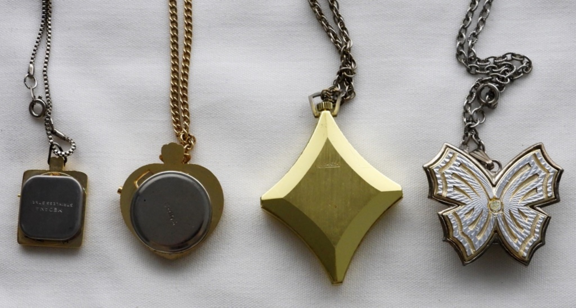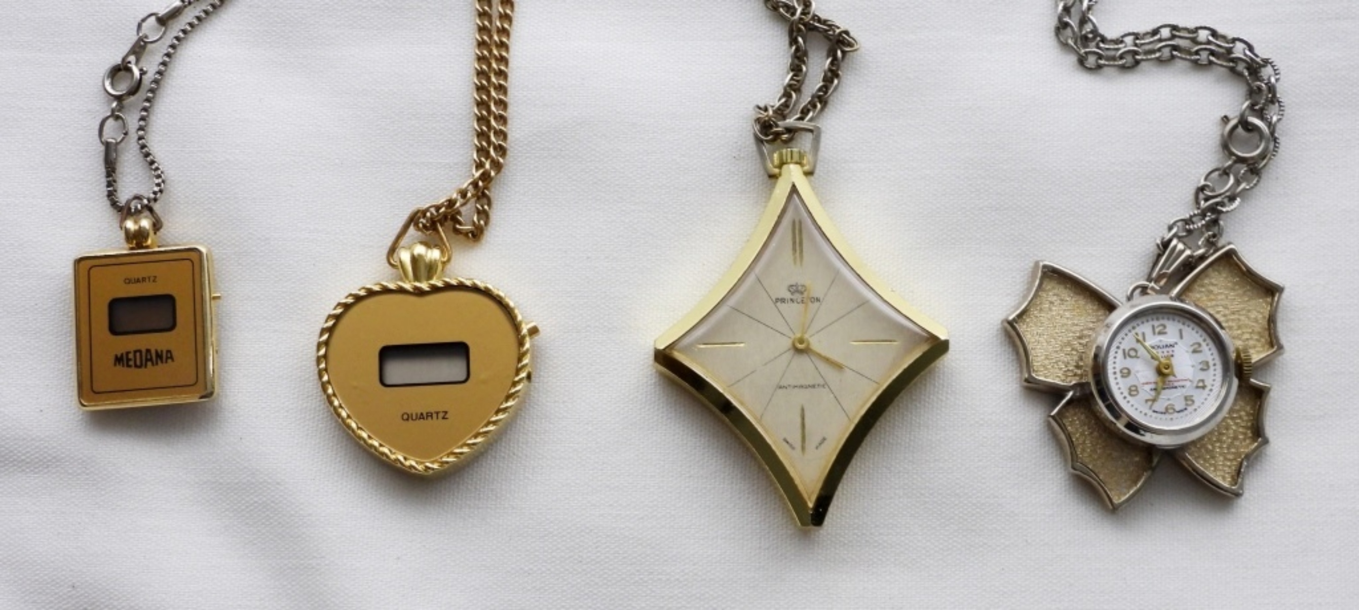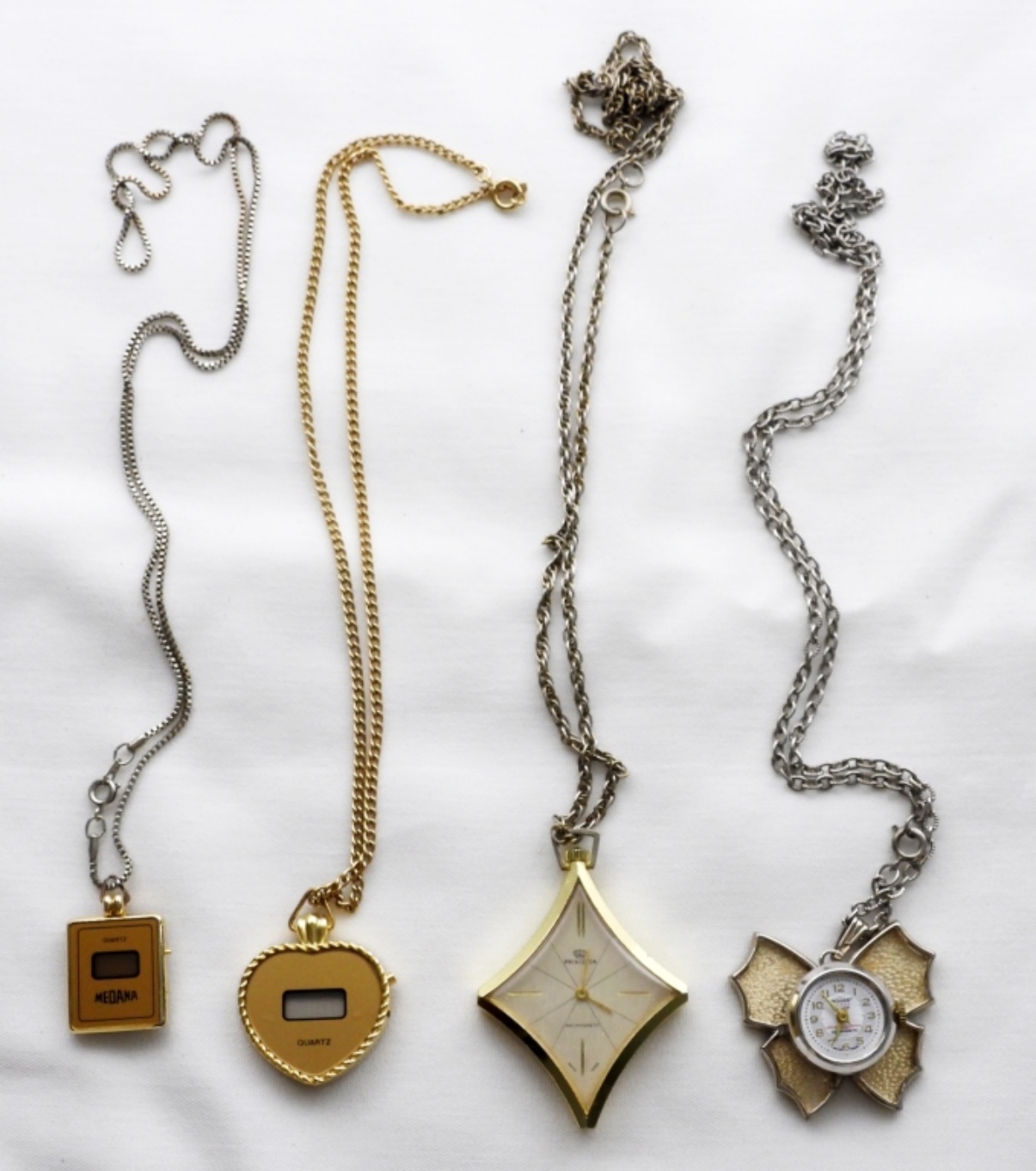 4 VINTAGE NECKLACES WITH WATCH PENDANTS- SOME IN GOLD & SILVER TONES- LENGTHS 16-24″. BRANDS ARE UNSEARCHED & UNVERIFIED. NOT TESTED AS TO WORKING OR NOT. THESE WATCHES DO SHOW SOME WEAR, PREOWNED.