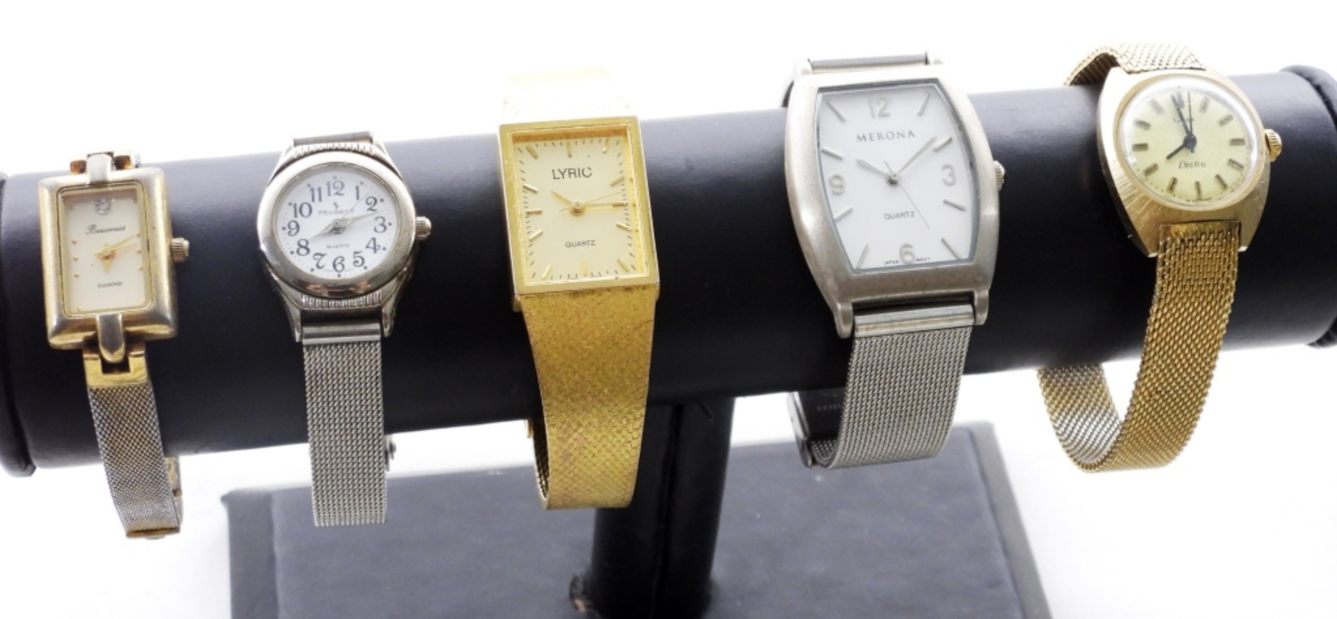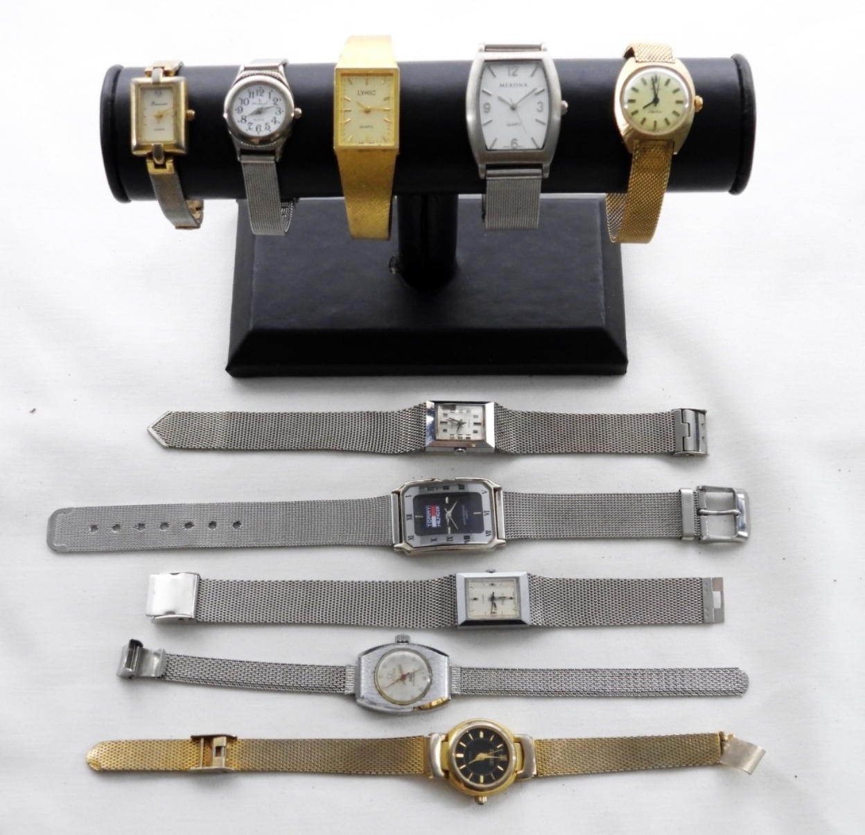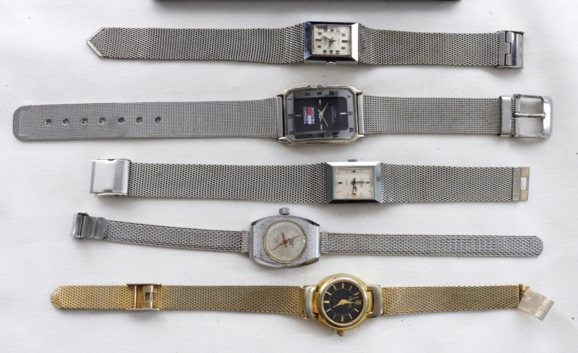 10 BULKY SILVER & GOLD TONE WATCHES- SOME OF THE BRANDS ARE TOMMY HILFIGER, TIMEX, PEUGEOT, LYRIC- THESE BRANDS ARE UNSEARCHED AND UNVERIFIED. THE WATCHES DO SHOW WEAR, PREOWNED. THE OMEGA SILVER TONE WATCH IS