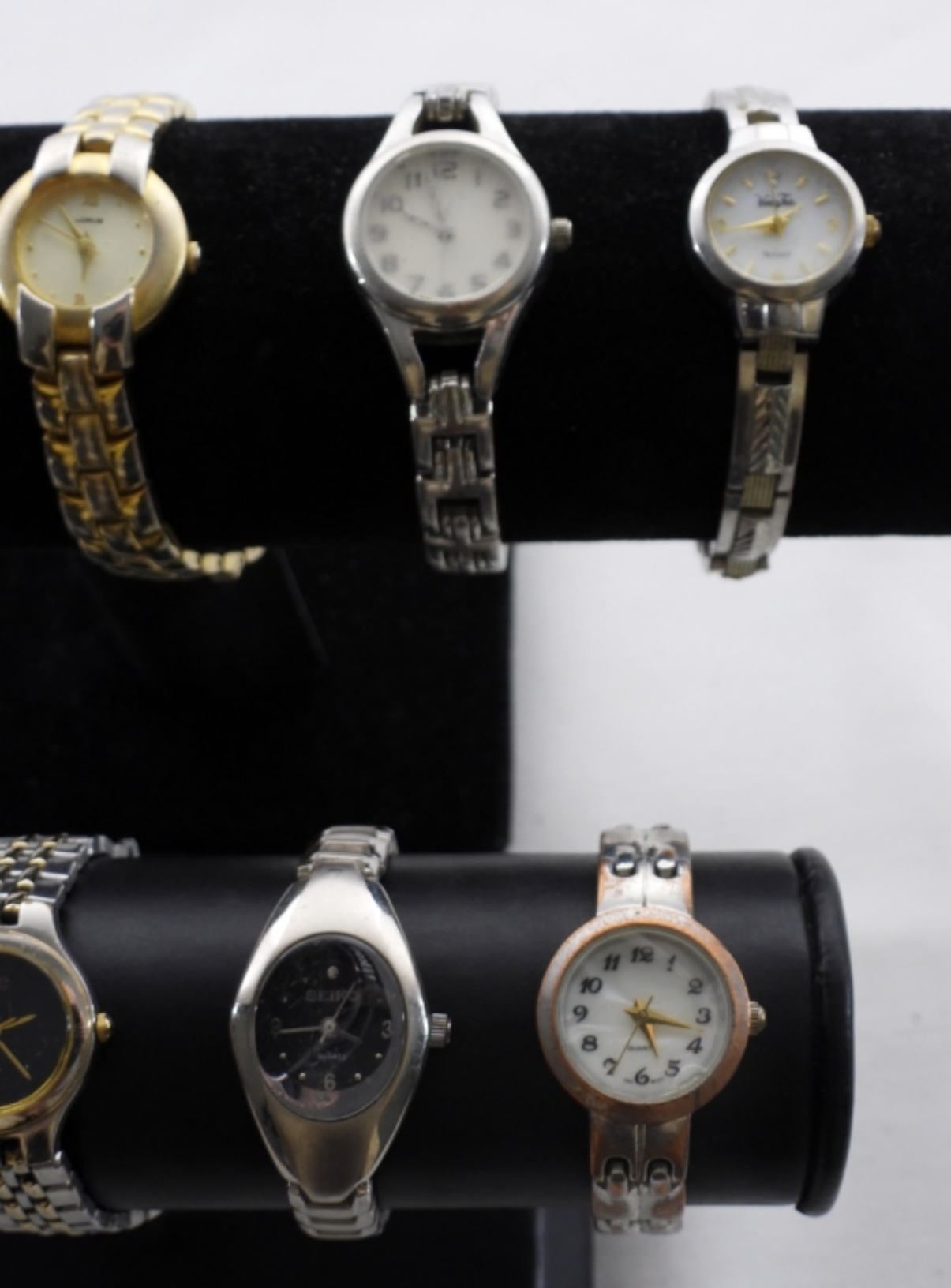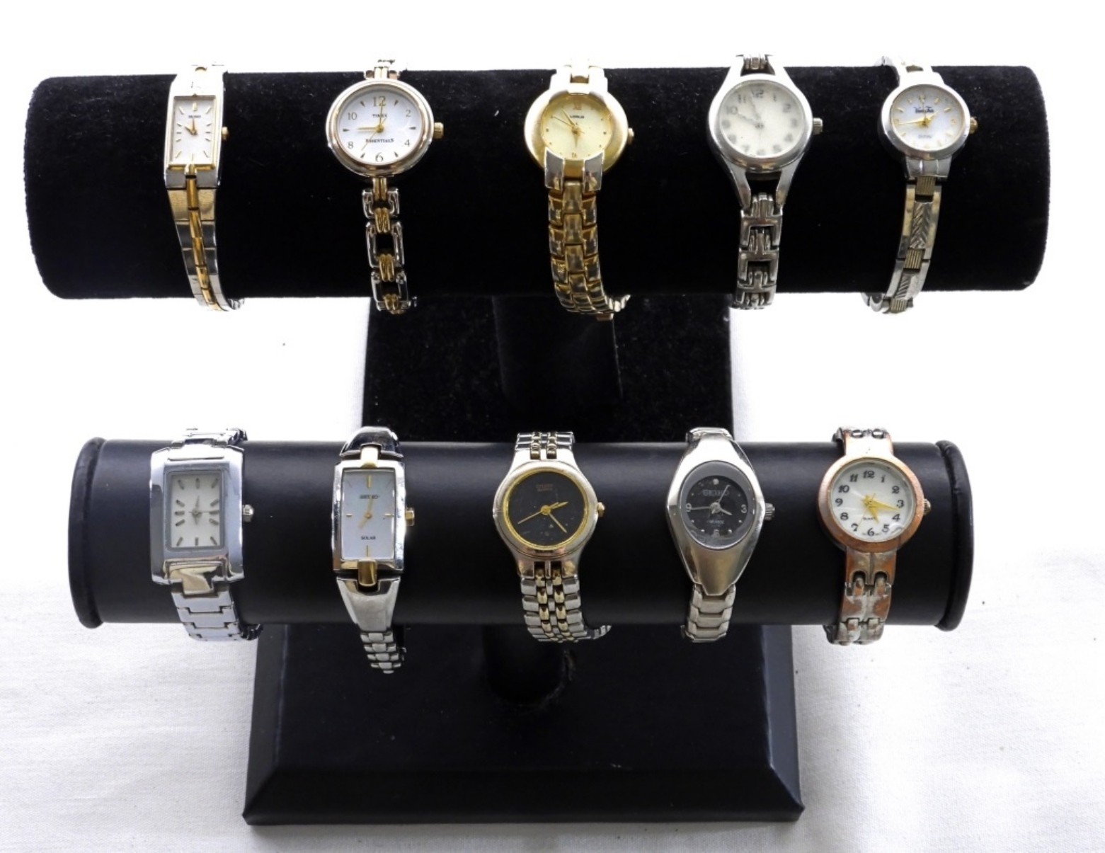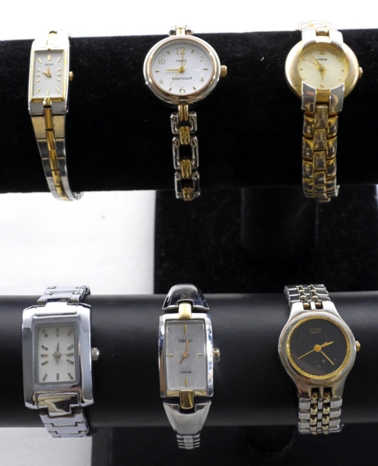 10 WOMEN’S SILVER & GOLD ACCENTED WATCHES. BRANDS ARE SEIKO, VANITY FAIR, TIMEX, LORUS- THESE BRANDS ARE UNSEARCHED & UNVERIFIED. THE WATCHES DO SHOW WEAR, PREOWNED. NOT TESTED AS TO WORKING OR NOT.