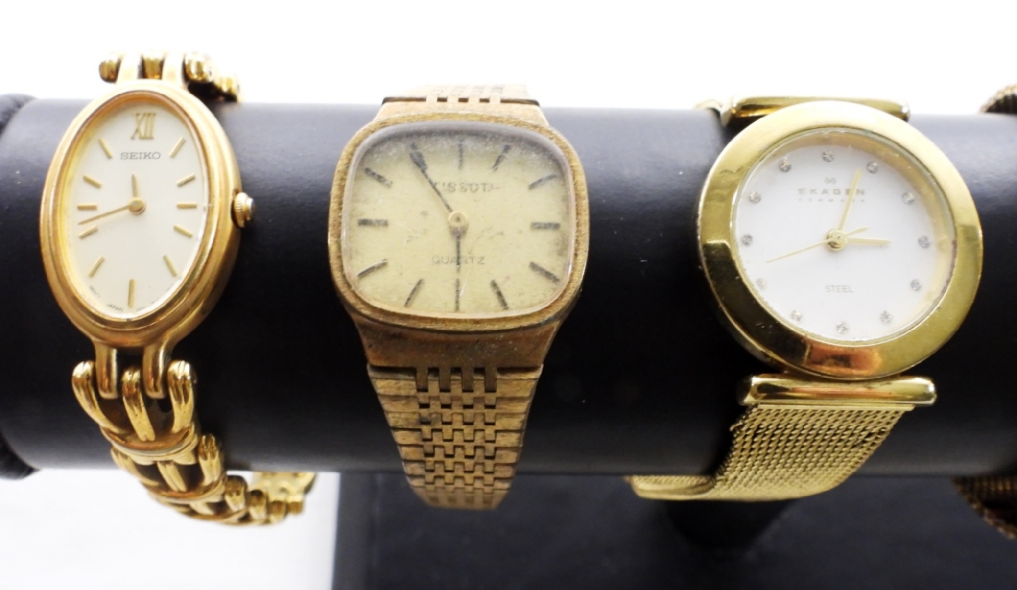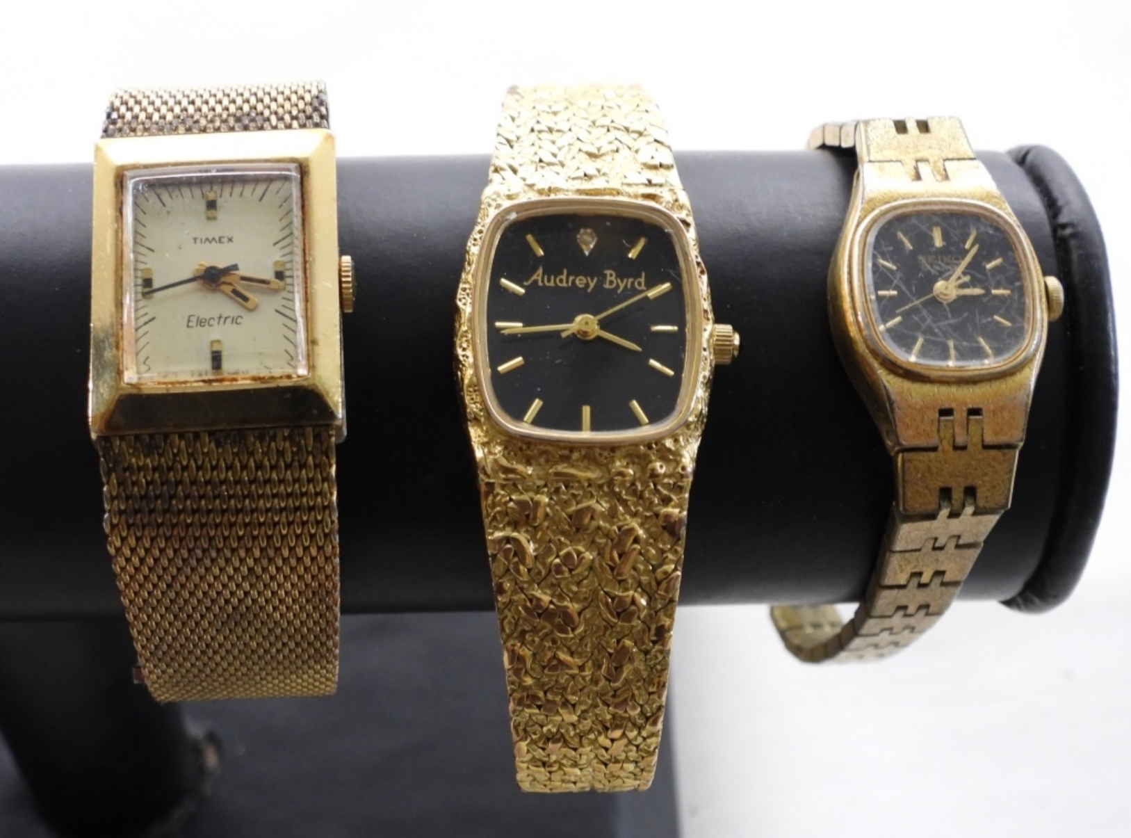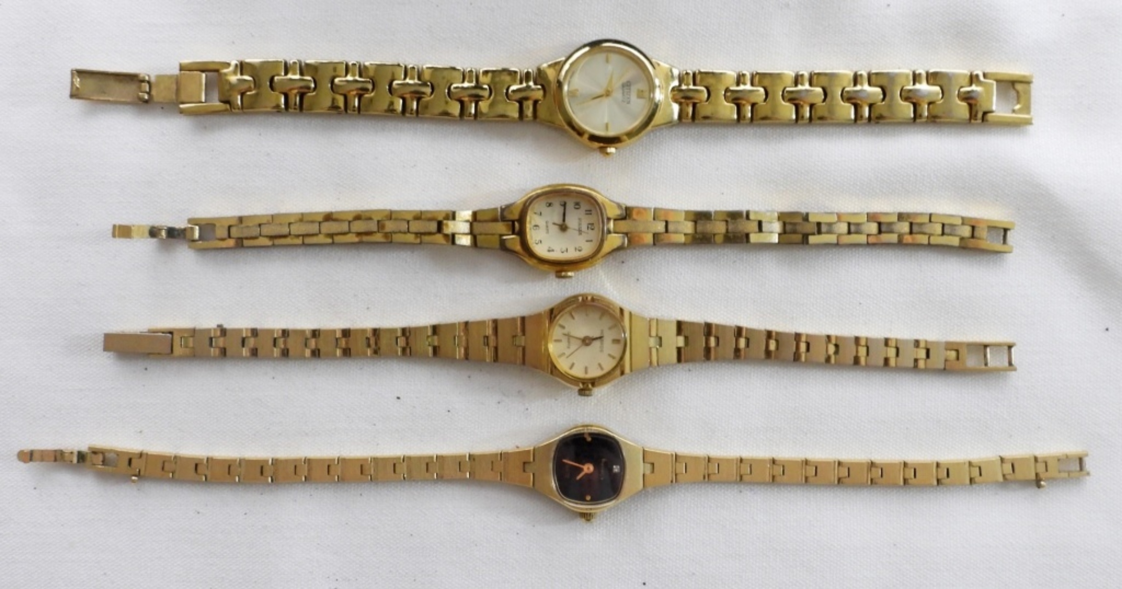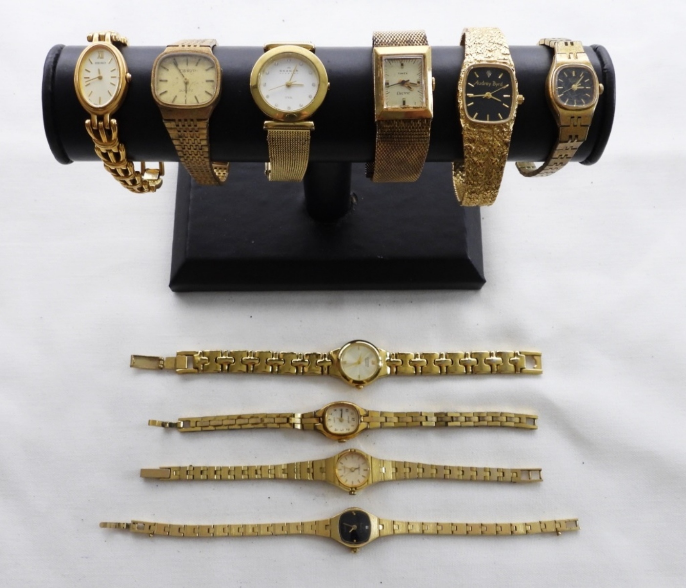 10 VINTAGE GOLD TONED LADIES WATCHES. THE BRANDS ARE- SIKO, PULSAR, SKAGEN, TIMEX, AUNDRY BYRD- THESE BRANDS ARE UNSEARCHED & UNVERIFIED. THE WATCHES DO SHOW WEAR, PREOWNED. NOT TESTED AS TO WORKING OR NOT.