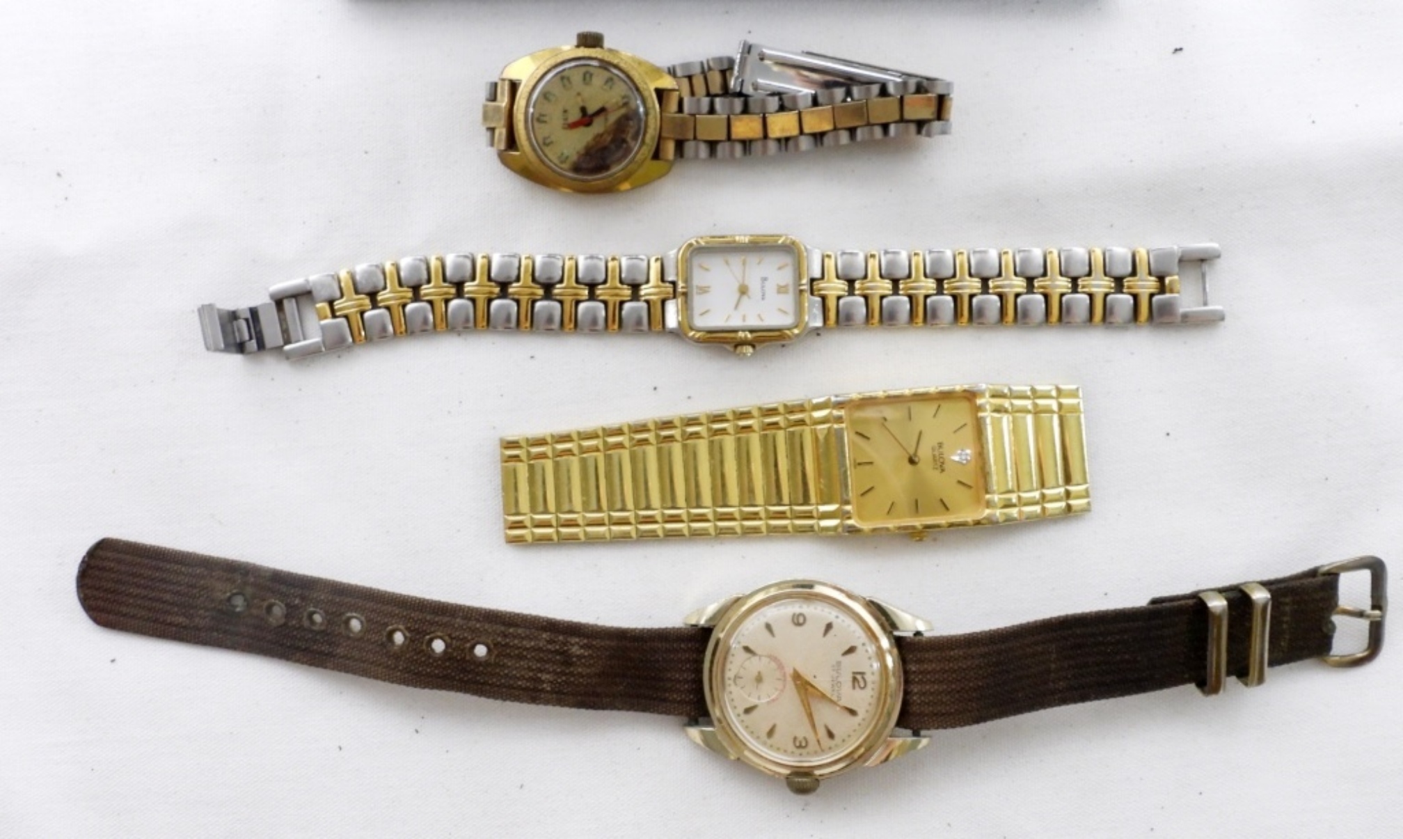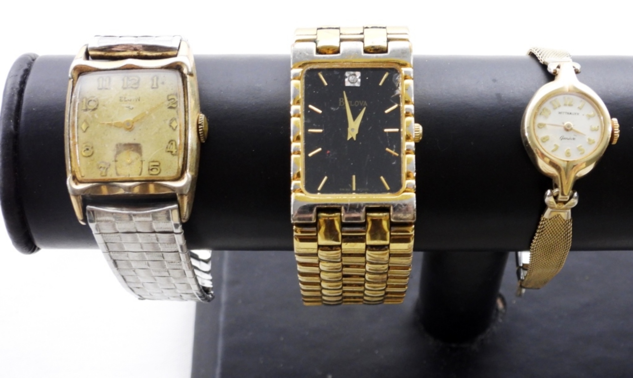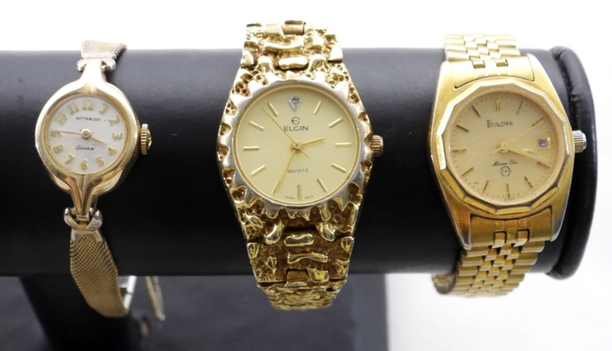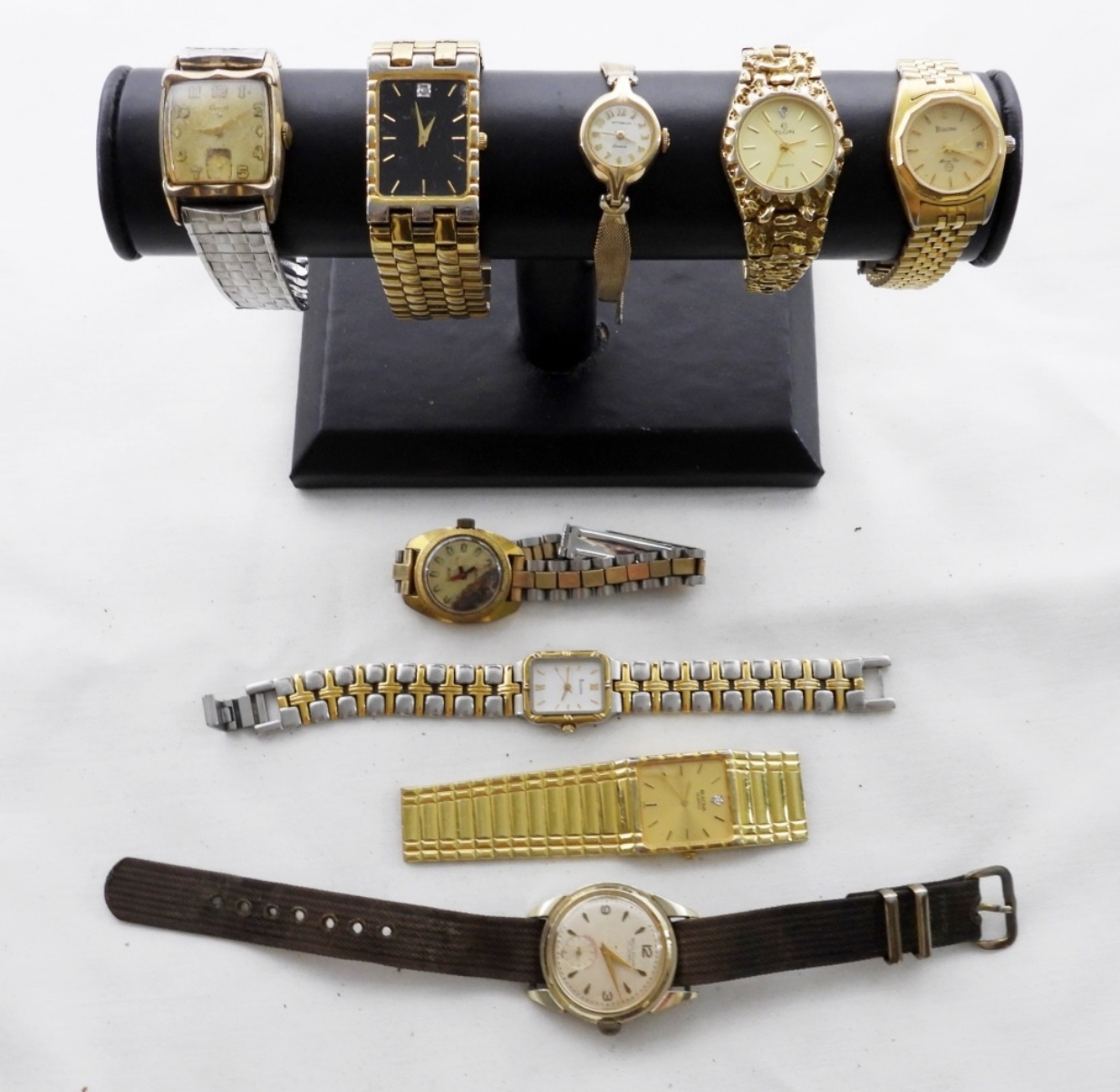 9 MIXED WATCH LOT- 6 GOLD & SILVER TONED WATCHES- ONE OF THE WATCHES FACES DOES SHOW WEAR TO IT. 1- GOLD TONED WATCH THAT THE BAND IS BROKEN MAYBE ABLE TO BE REPAIRED OR USED FOR REPAIRS. 1- SILVER TONED WATCH THAT THE