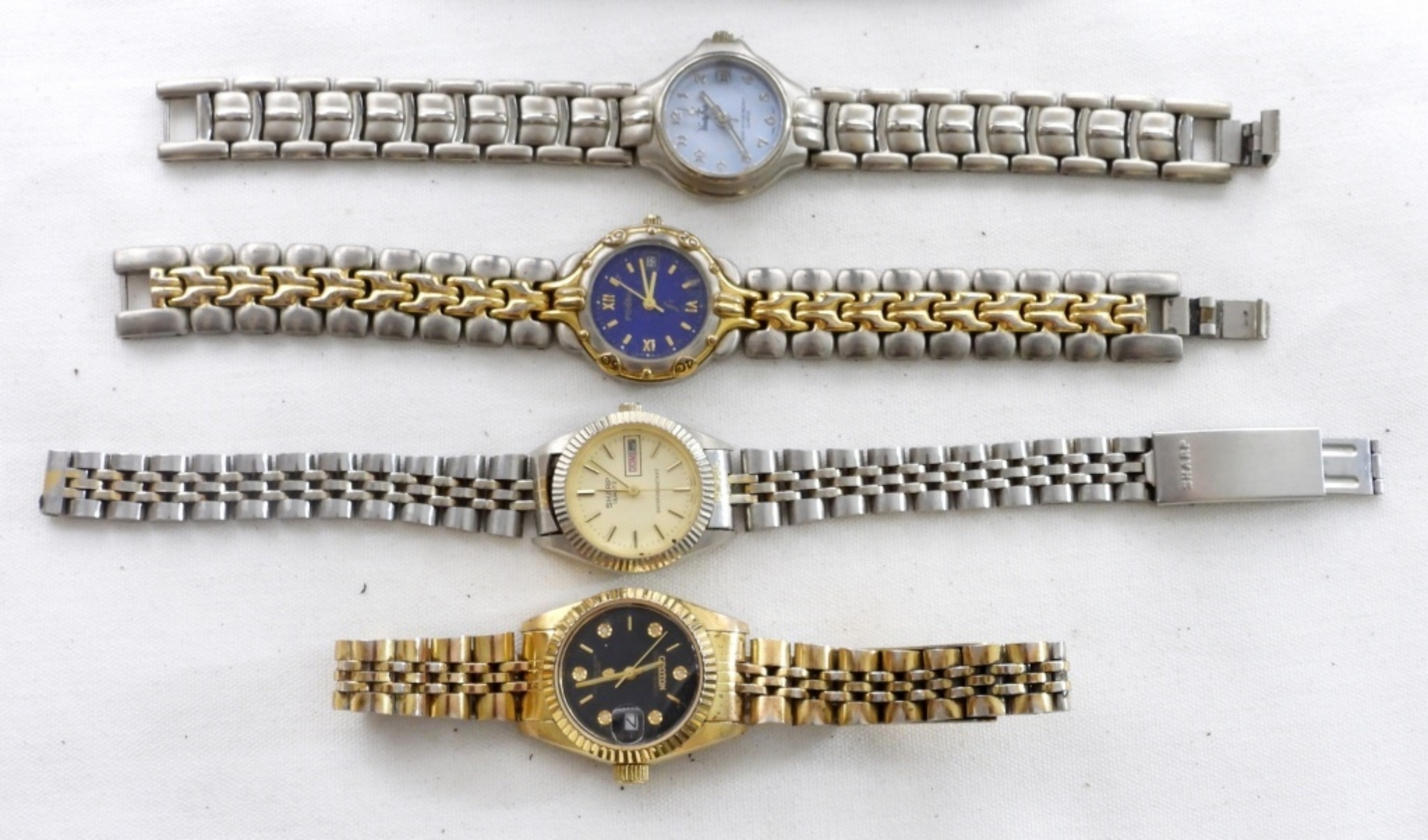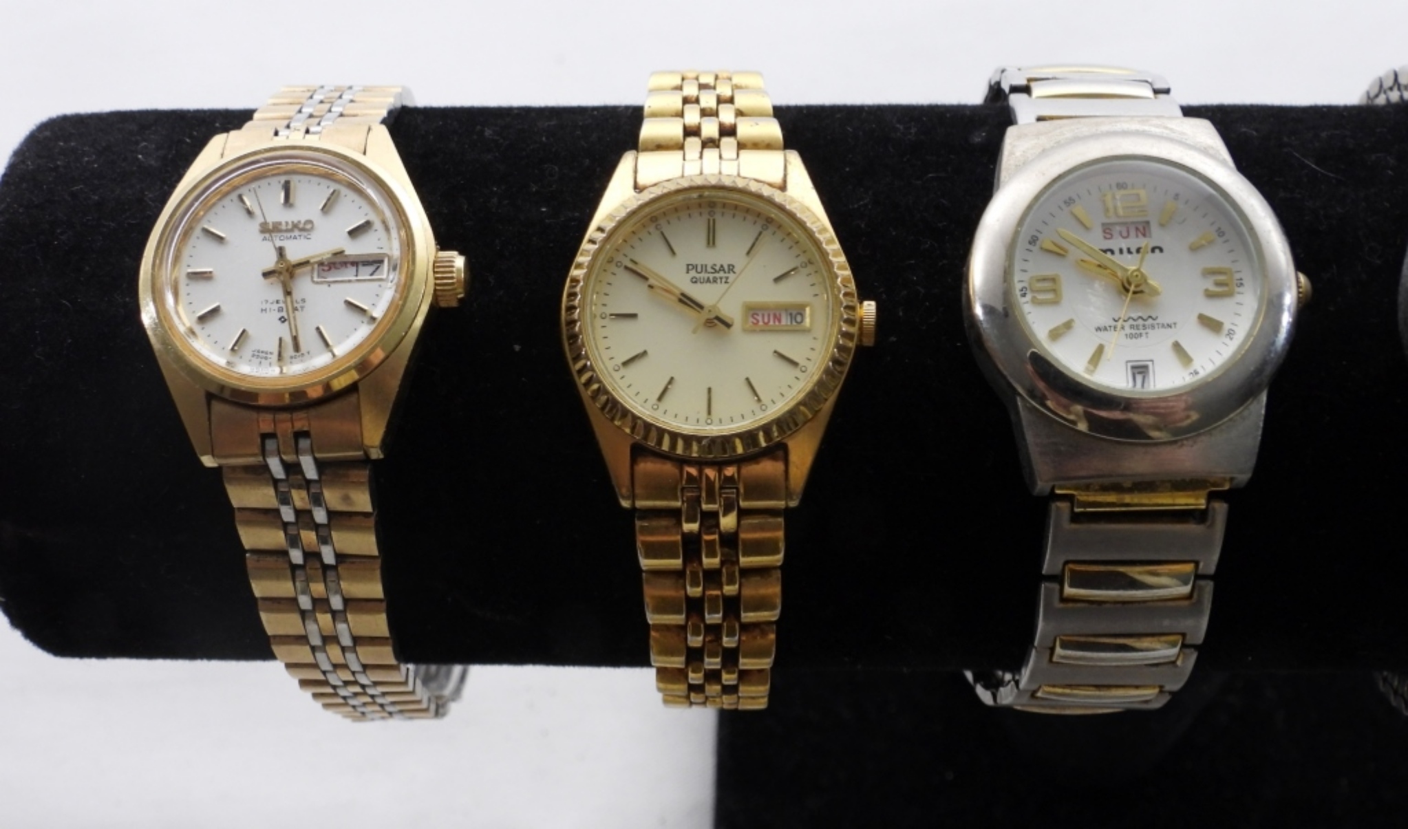 10 VINTAGE GOLD AND SILVER TONED WOMEN’S WATCHES- BRANDS ARE SHARP, VANITY FAIR, MILAN, FOSSIL, PULSAR, SEIKO, TIMEX, CITIZEN – THESE BRANDS ARE UNSEARCHED & UNVERIFIED. THE WATCHES DO SHOW WEAR PREOWNED. NOT TESTED