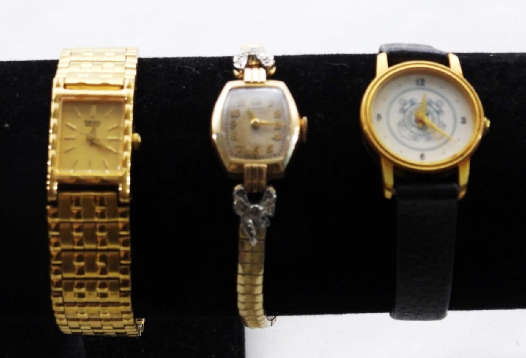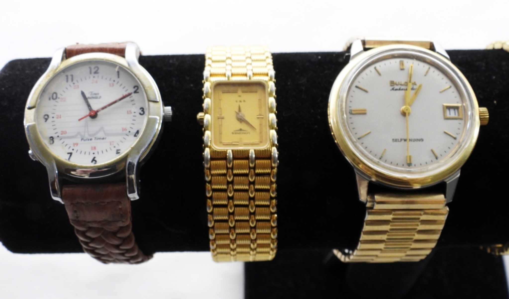 6 WOMEN’S MIXED WATCH LOT- 2- LEATHER BAND WATCHES, 4- GOLD TONED BAND WATCHES. BRANDS ARE TIMEX, GIRAD, SIEKO, LONGINES, BULOVA- THESE BRANDS ARE UNSEARCHED & UNVERIFIED. THE WATCHES DO SHOW WEAR PREOWNED. NOT TESTED AS
