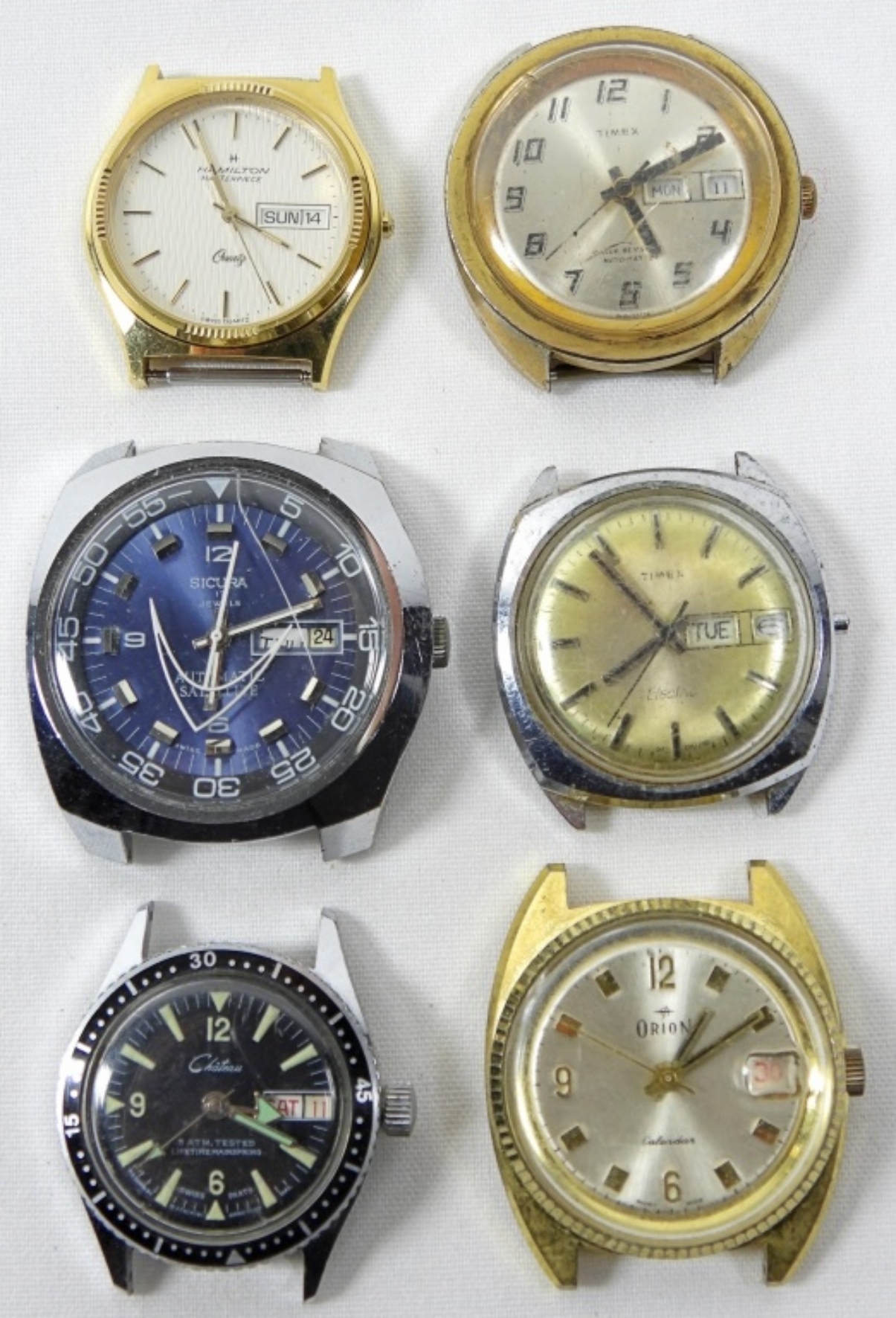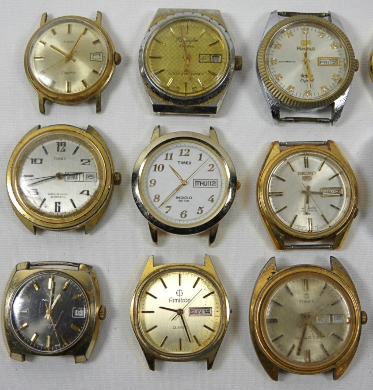 15 ASSORTED DATE/DAY WATCH FACES. NO WATCH BANDS. WATCHES UNTESTED/BRANDS UNVERIFIED.