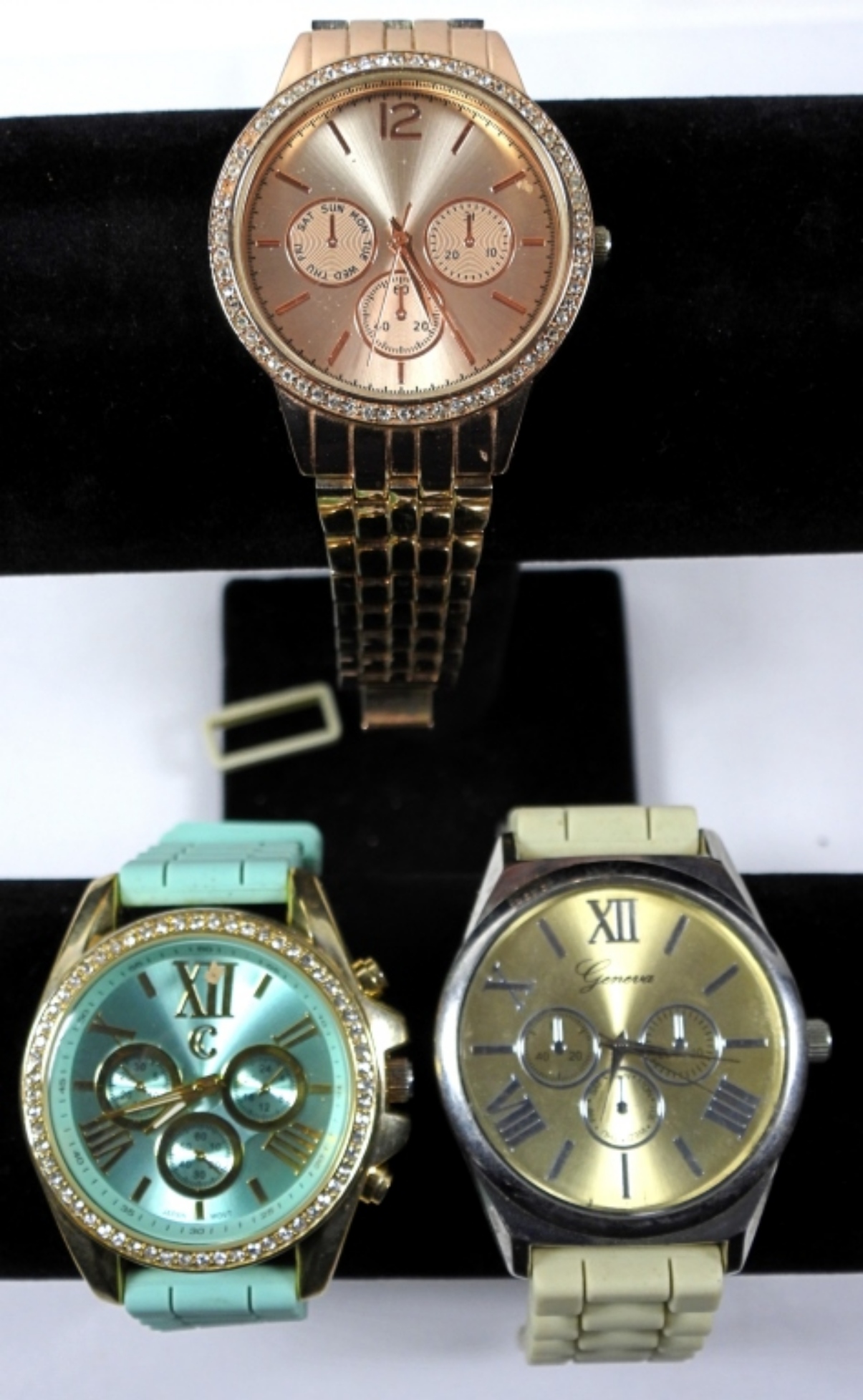 3 LADIES CHRONOGRAPH WATCHES. WATCHES ARE UNTESTED, MAY NEED PARTS OR REPAIR TO WORK. BRANDS UNVERIFIED.