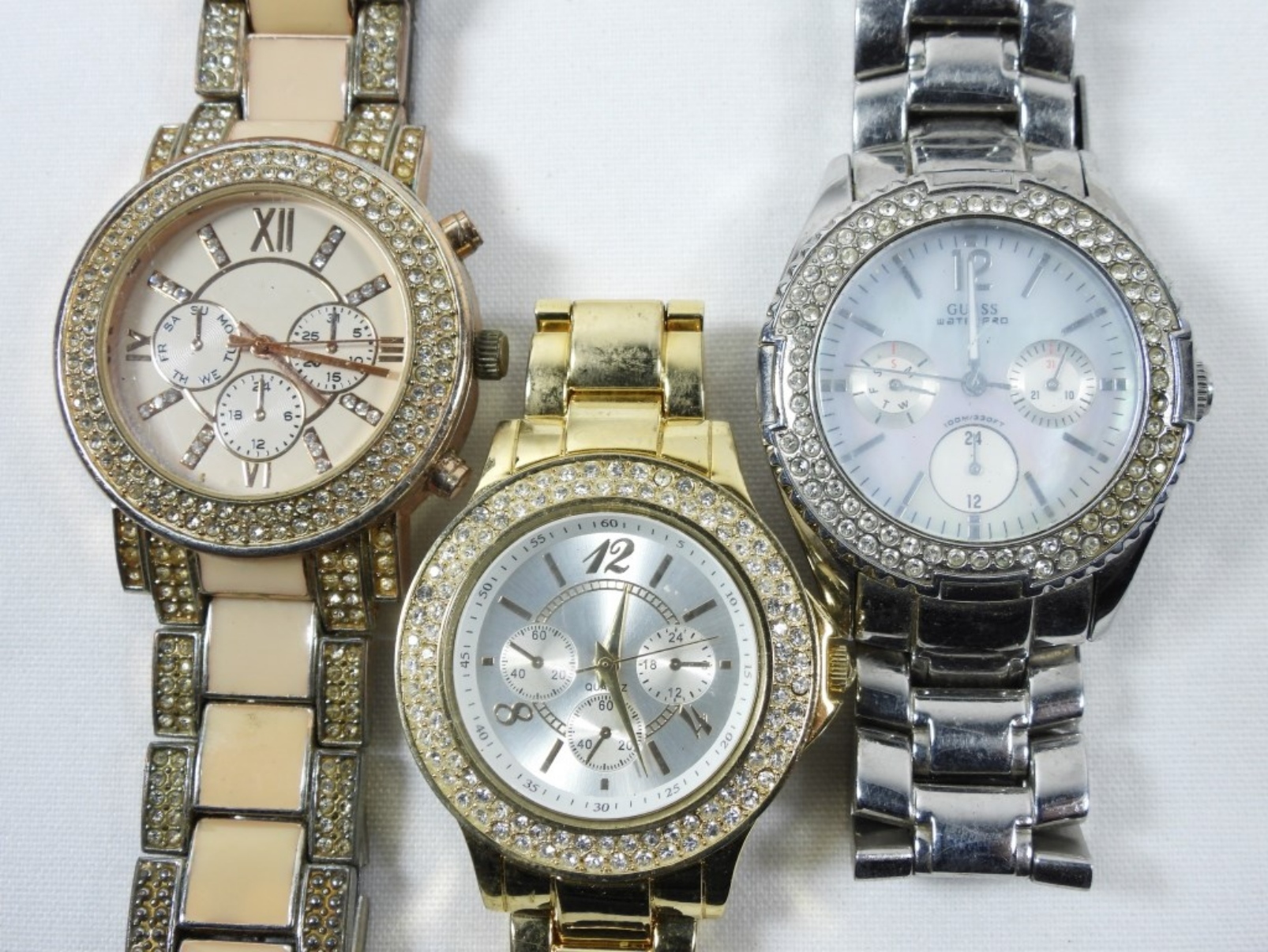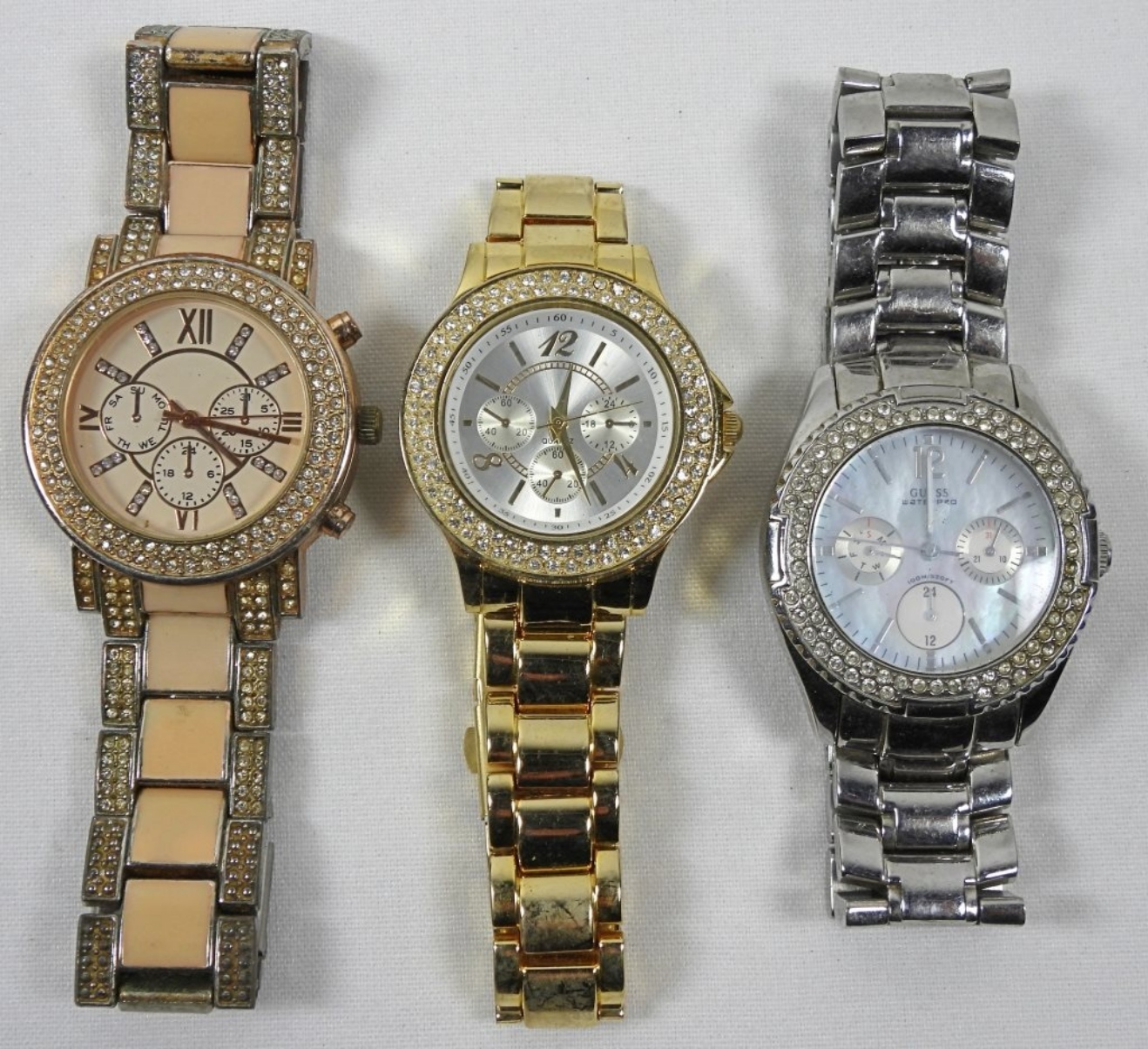 3 LADIES BLING CHRONOGRAPH WATCHES. WATCHES ARE UNTESTED, MAY NEED PARTS OR REPAIR TO WORK. BRANDS UNVERIFIED.