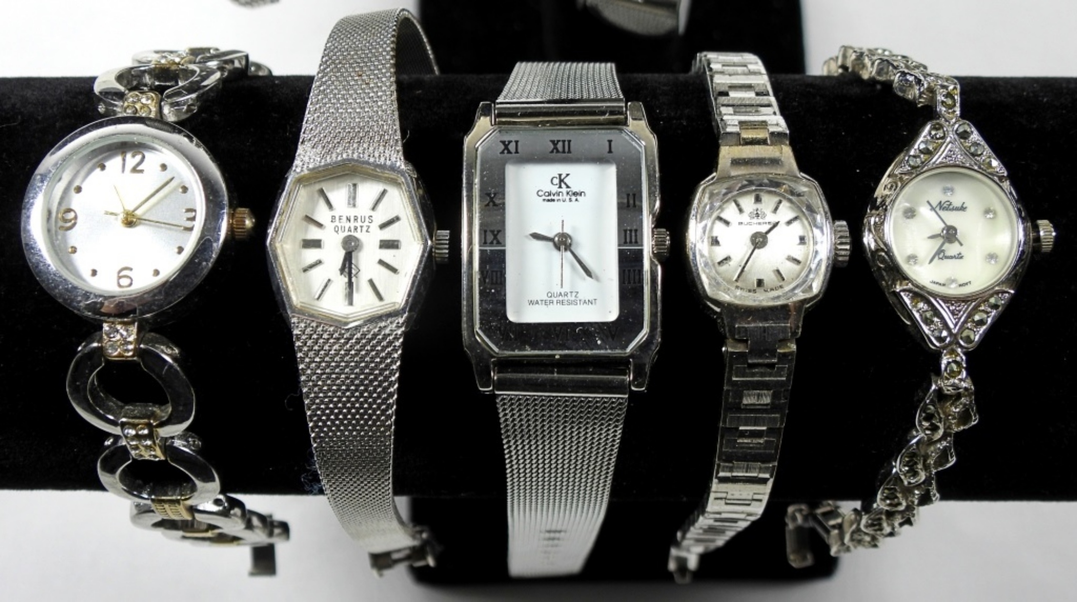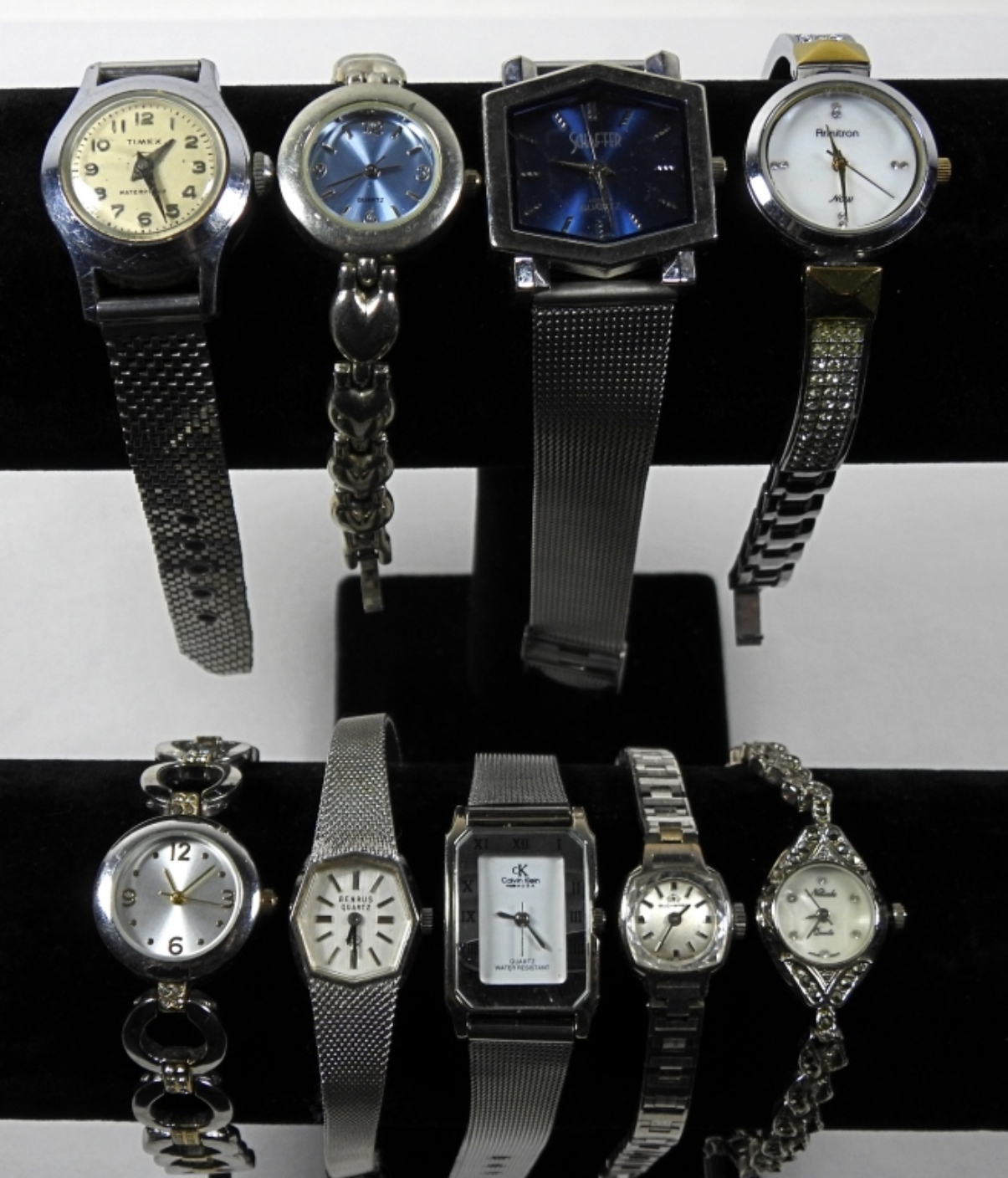 9 ASSORTED LADIES PRETTY SILVER TONE WATCHES. WATCHES ARE UNTESTED/BRANDS UNVERIFIED.